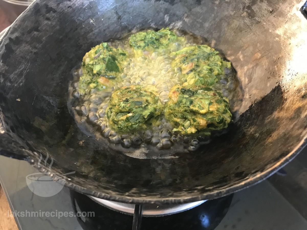 - "पालक कढ़ी पकोड़ा" के पकोड़ों को सभी तरफ कुरकुरा लाल होने तक तल लें। फिर इन पकोड़ों को एक अलग प्लेट में निकाल कर रखें।