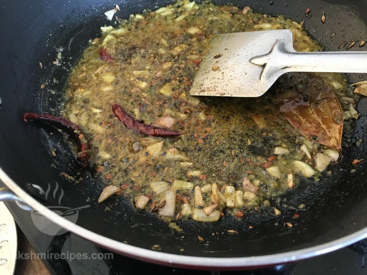 - कुछ सेकंड के बाद कढ़ाई में कटा हुआ प्याज डालें और उन्हें हल्का लाल होने तक भूनें।