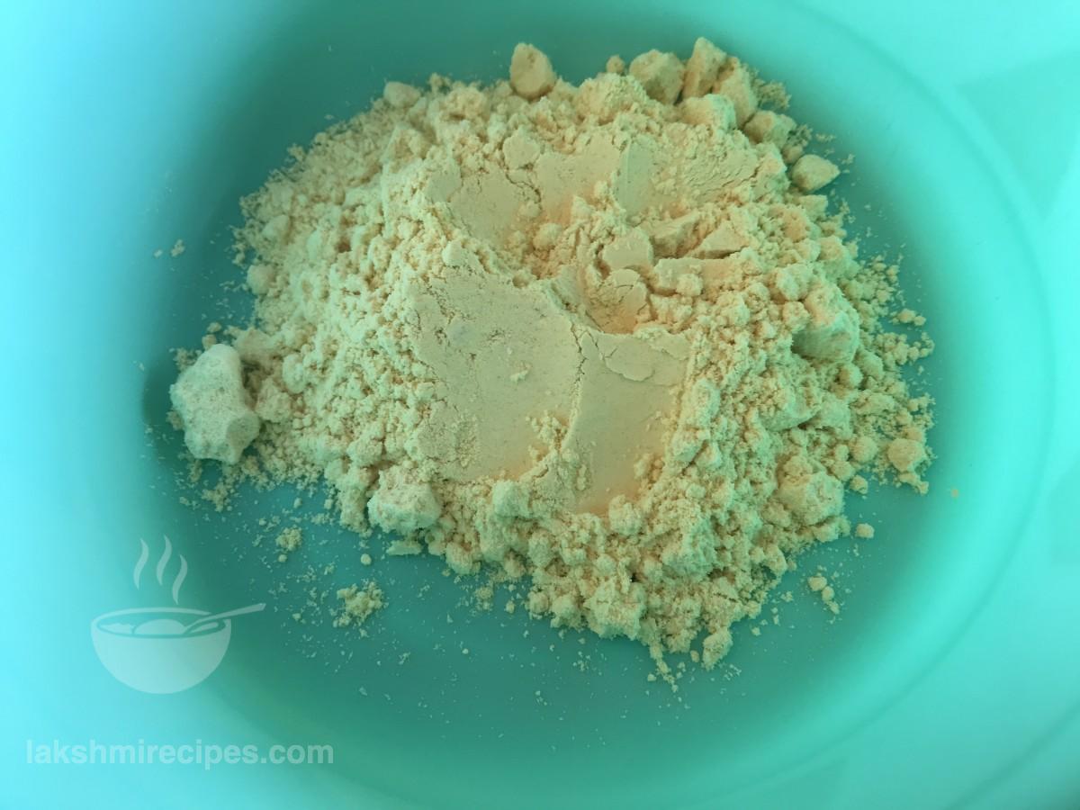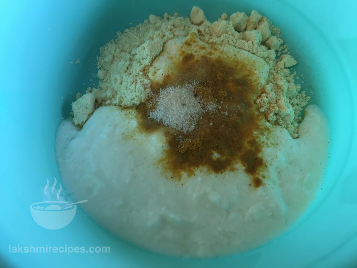 - Now take 4 table spoon gram flour in a deep mixing bowl and add salt, curd and turmeric powder to it. Mix the ingredients well. Make sure that no lumps are formed.