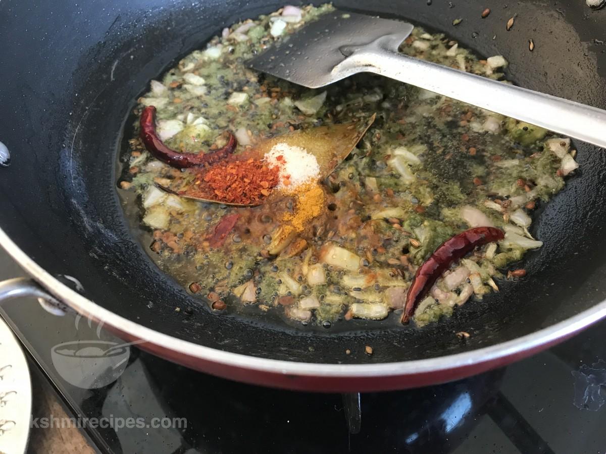 - Then add turmeric powder, red chilli powder and salt to the ingredients. Mix and cook the ingredients together. (Remember, that salt was already added to the batter for kadhi in the earlier steps. So add only little salt, or as per taste at thi step.)