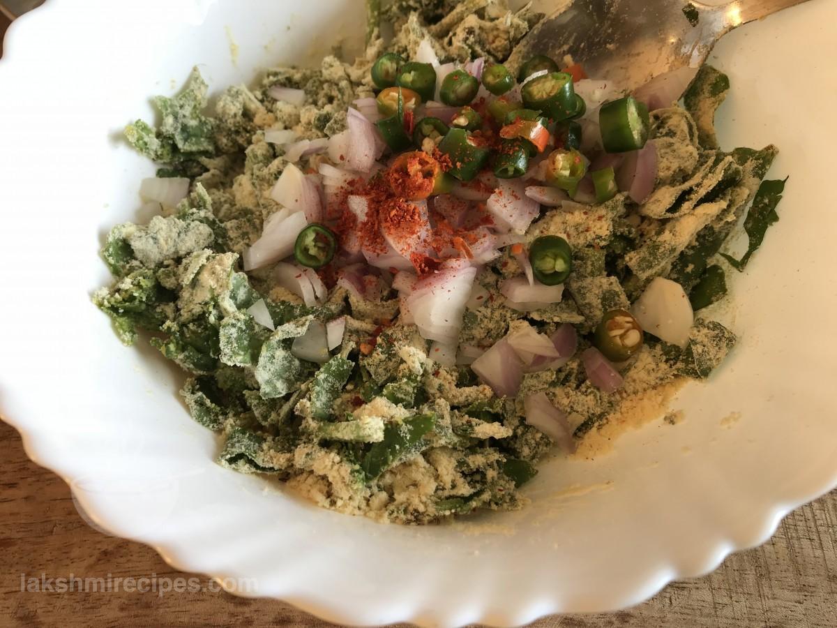 - फिर इस सामग्री में कटा हुआ प्याज, हरी मिर्च, लाल मिर्च पाउडर और 1-2 छोटी चम्मच पानी डालें। (कृपया ध्यान दें कि नमक डालने से पालक के पत्ते पानी छोड़ते हैं, तो ज्यादा पानी नहीं डालें।) फिर से मिलाएं और "पालक कढ़ी पकोड़ा" के लिए पकोड़े बनाने के लिए बल्लेबाज तैयार करें।