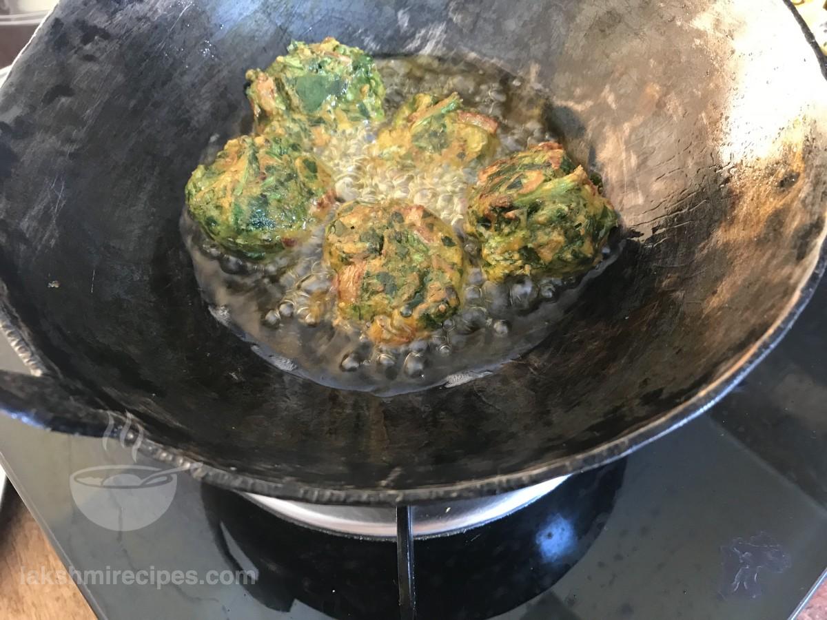 - Take some batter in your hand and make it roughly round like a ball and put it in the hot oil to deep fry it. Allow the pakoda ball to fry slowly in the hot oil.