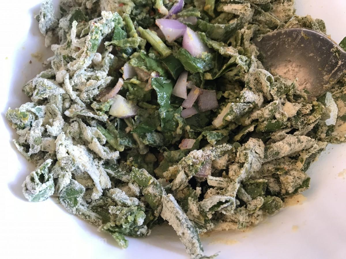 - इन कटे हुए पालक के पत्तों को एक मिश्रण कटोरे में डालें और इसमें बेसन, अज्वैन, हल्दी पाउडर और नमक डालें। अच्छी तरह से सामग्री को मिलाएं।