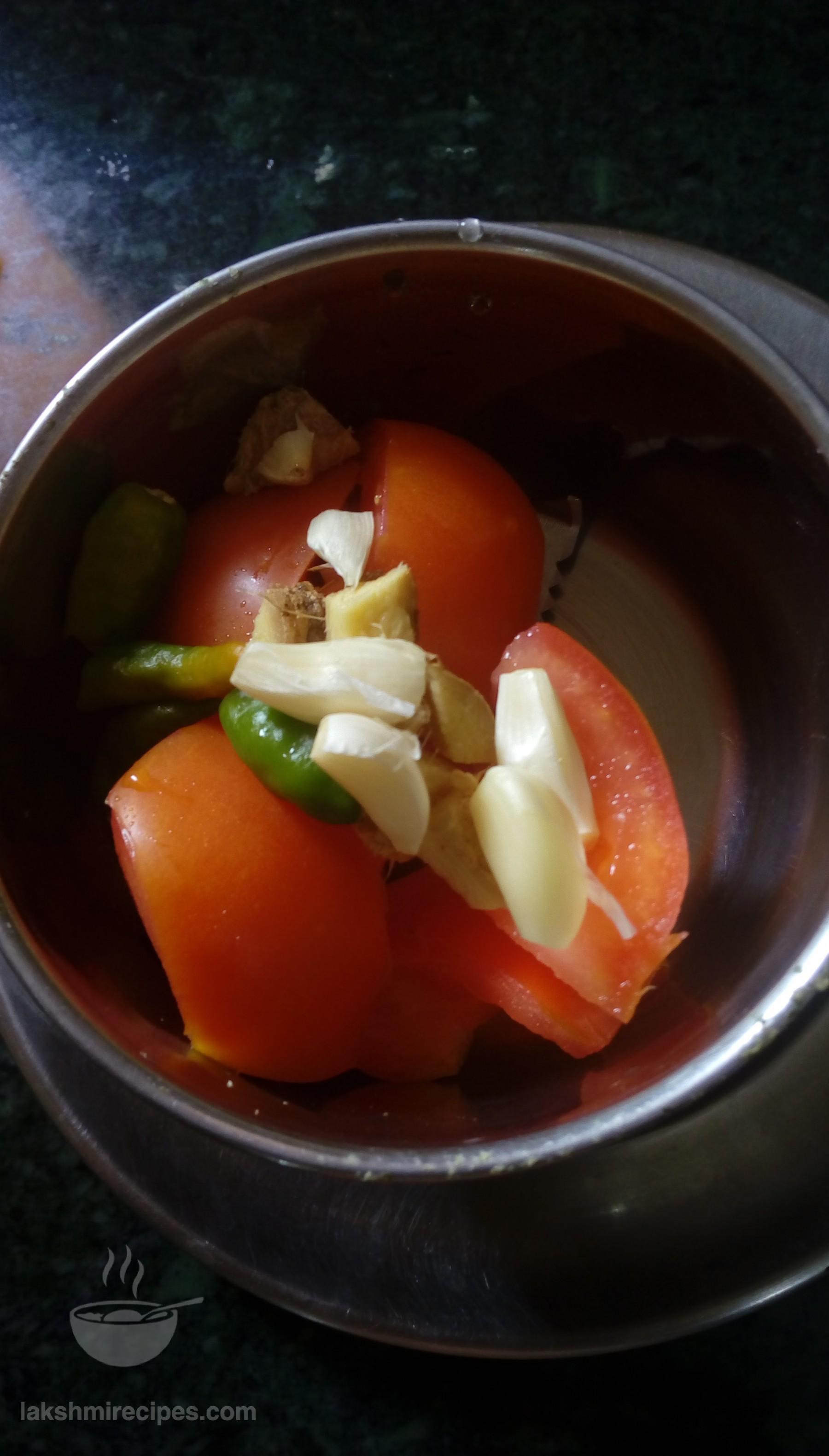 - Now in a mixer jar add chopped tomato (tamatar), garlic petals (lehsun ki kali), ginger (adrak) and green chilli (hari mirch). Grind all ingredients together into a fine paste.