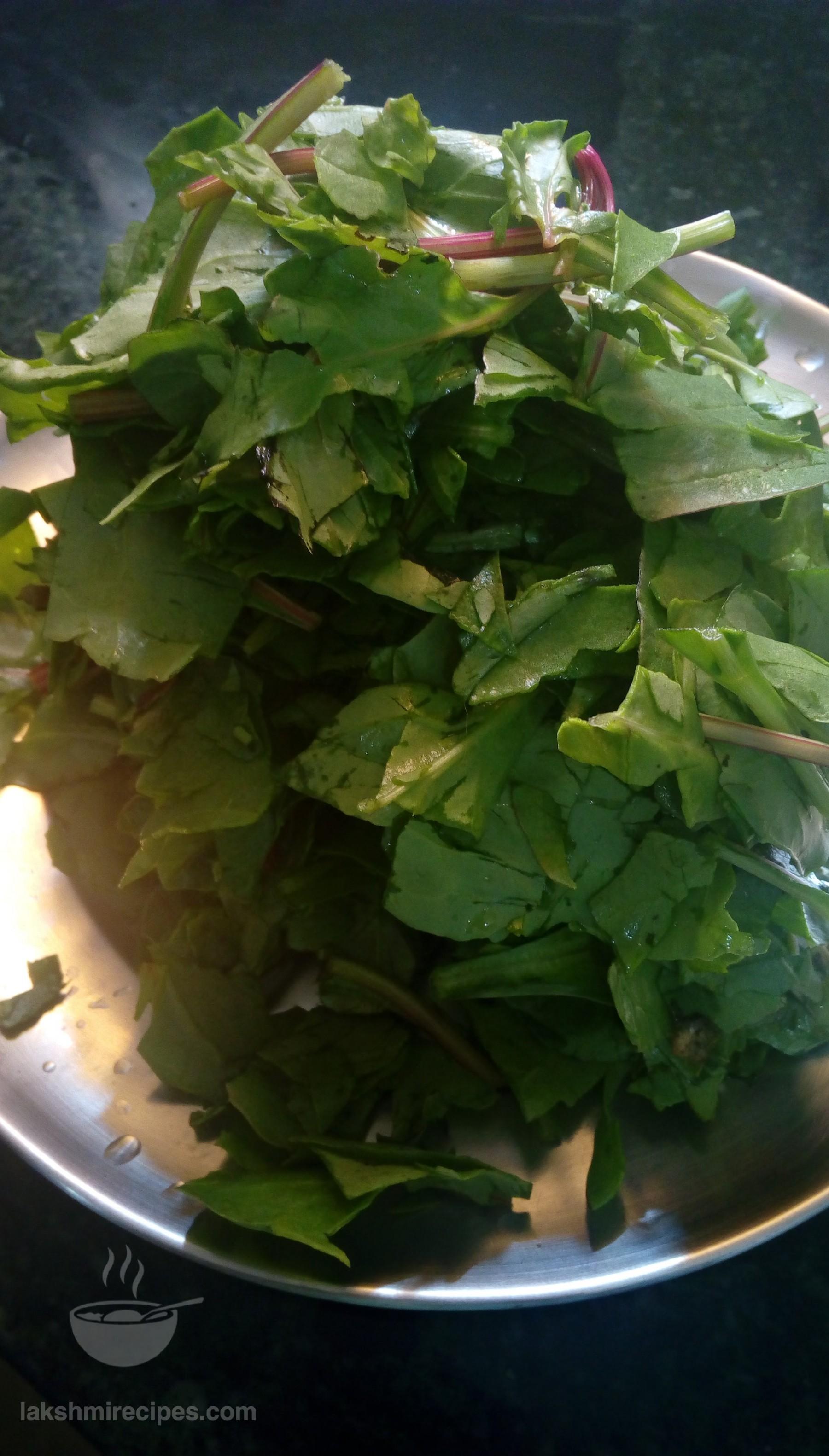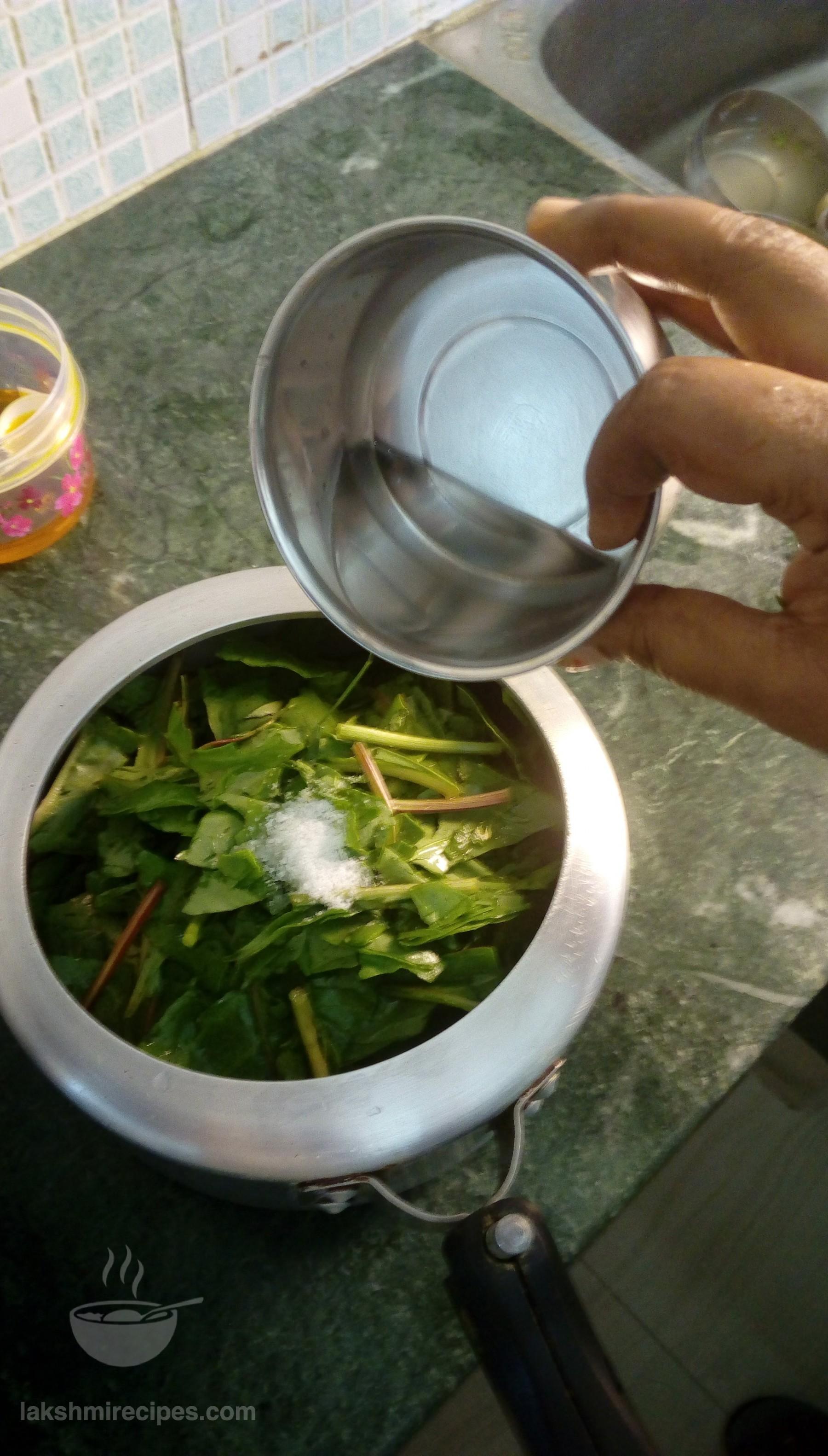 - First seperate the spinach leaves (palak patta) from the bunch and wash them well with water atleast 3 times. Now cut the spinach leaves into 1.5 inch long pieces and transfer them to the cooker. Add 1/2 cup water and close the lid. Now cook the spinach for 2-3 whistles.