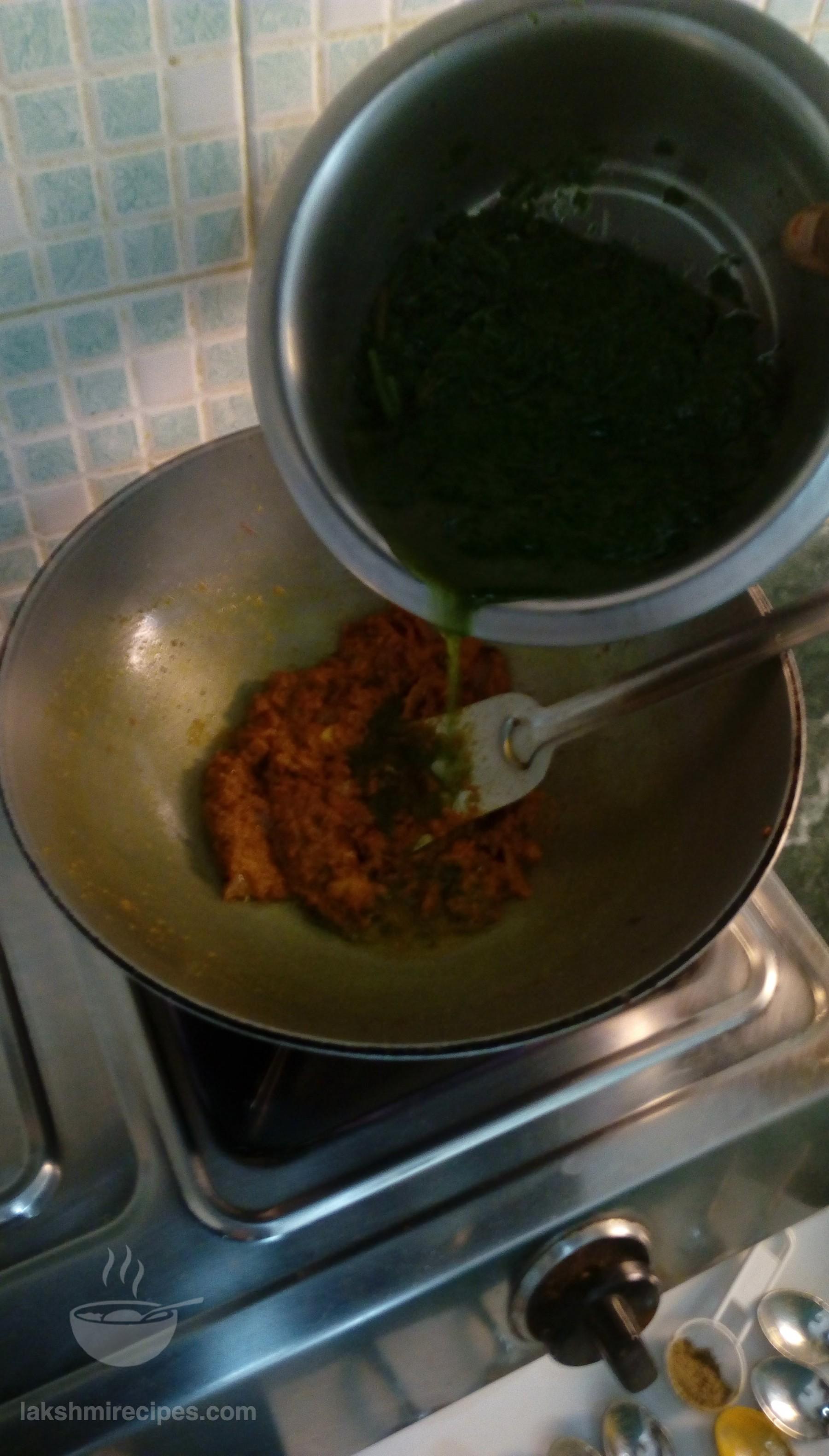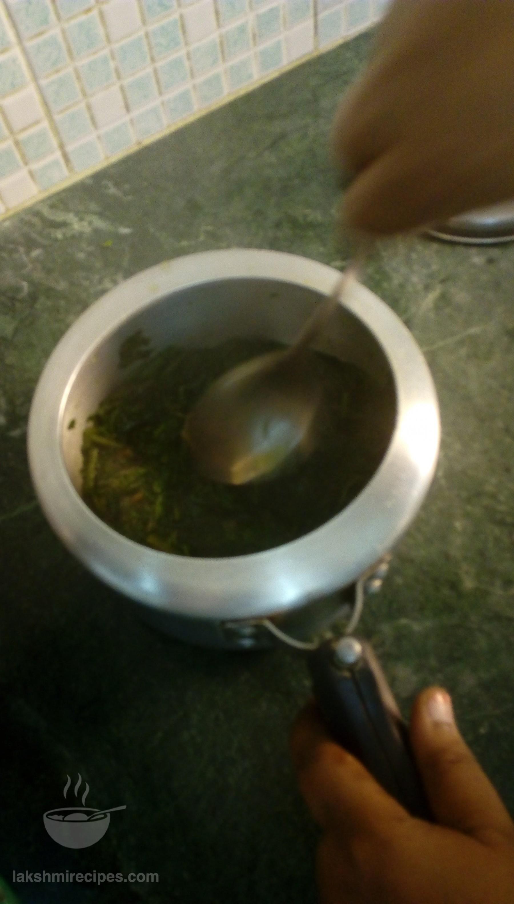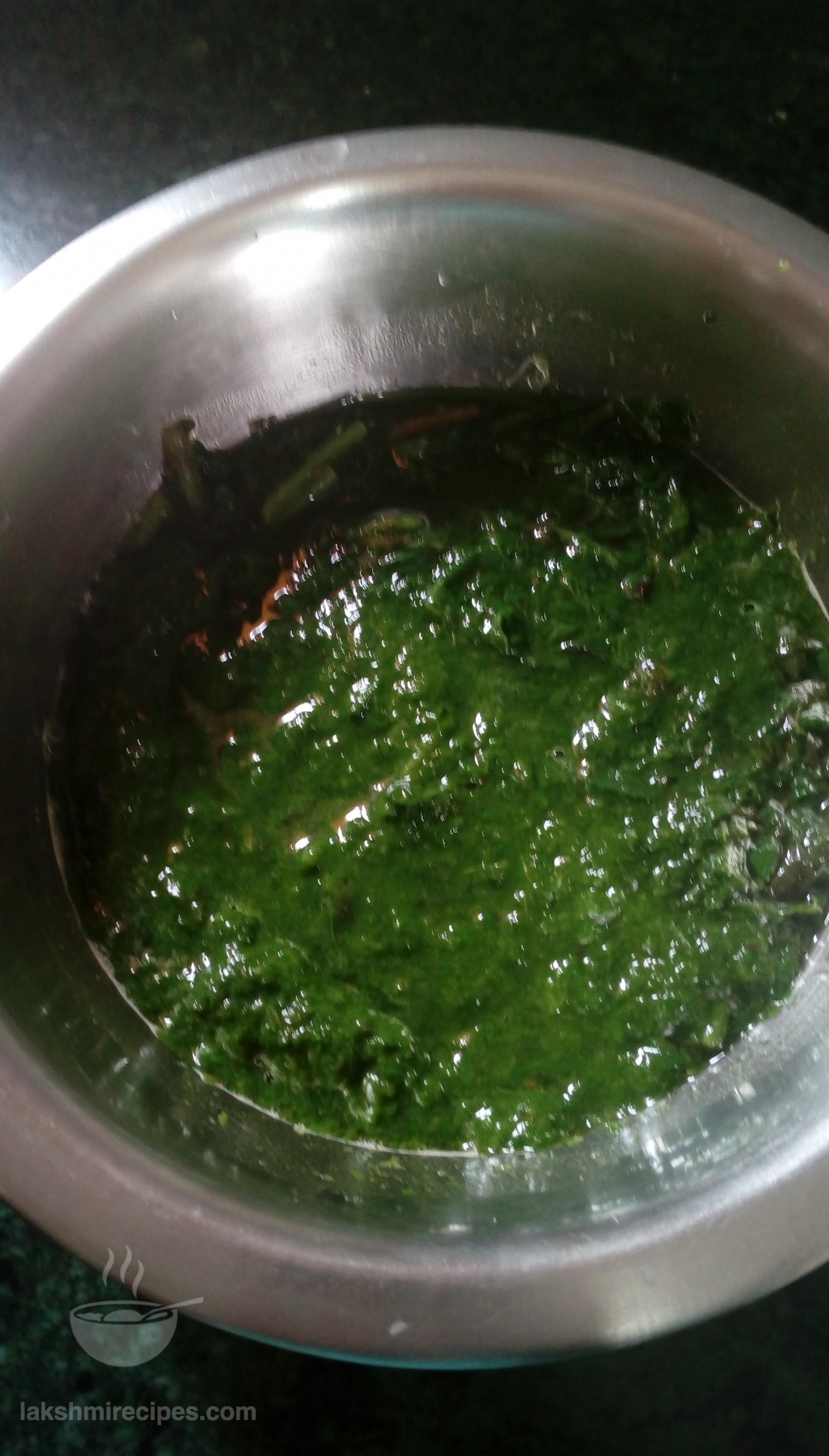 - Now open the cooker lid, transfer the cooked spinach (paalak) leaves to a deep vessel and chafe the cooked spinach leaves to form a paste. (you can also strain the spinach leaves from the water and grind them to a fine paste in a mixer grinder). Keep the spinach water in a seperate vessel for use in later step.