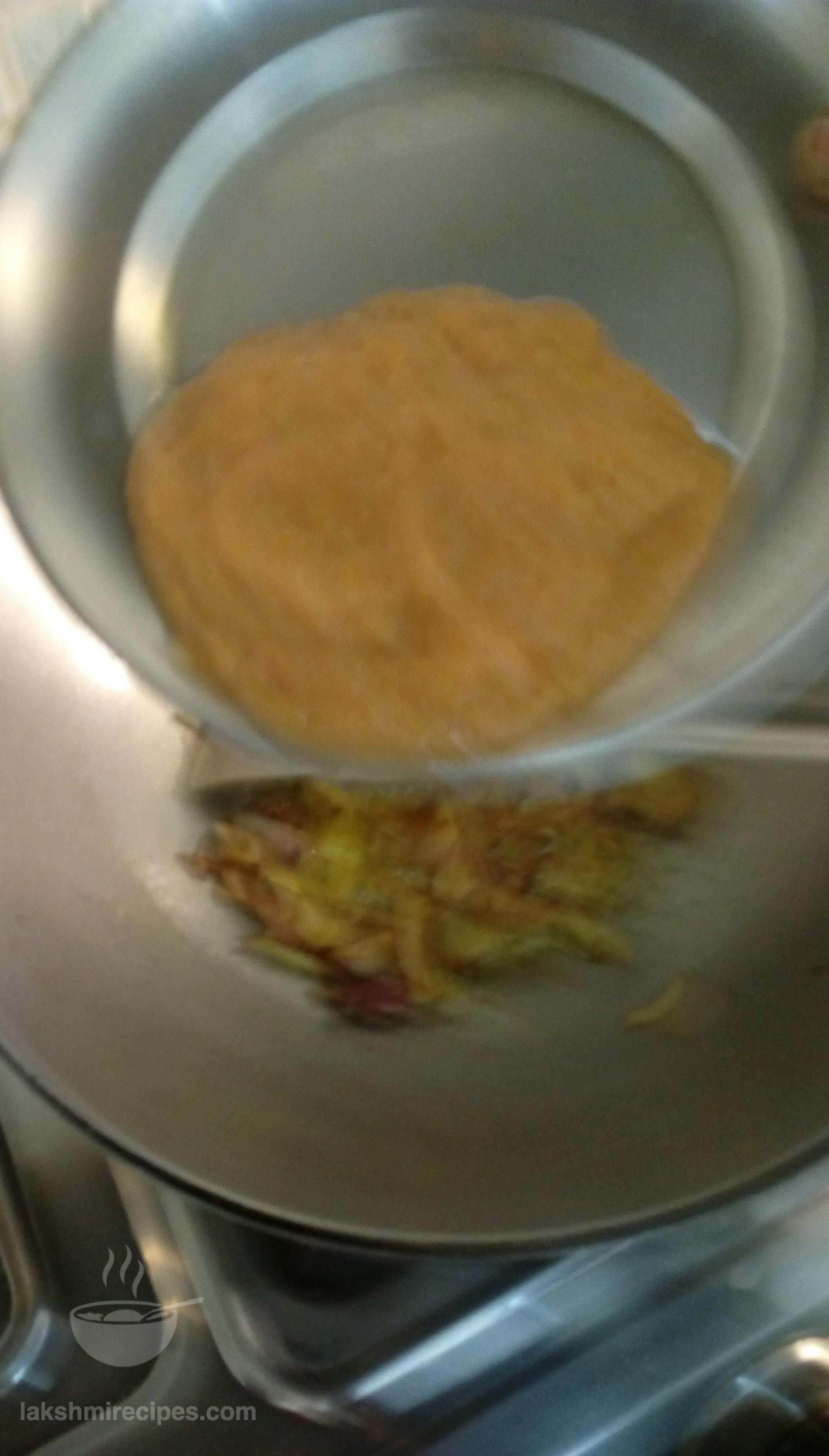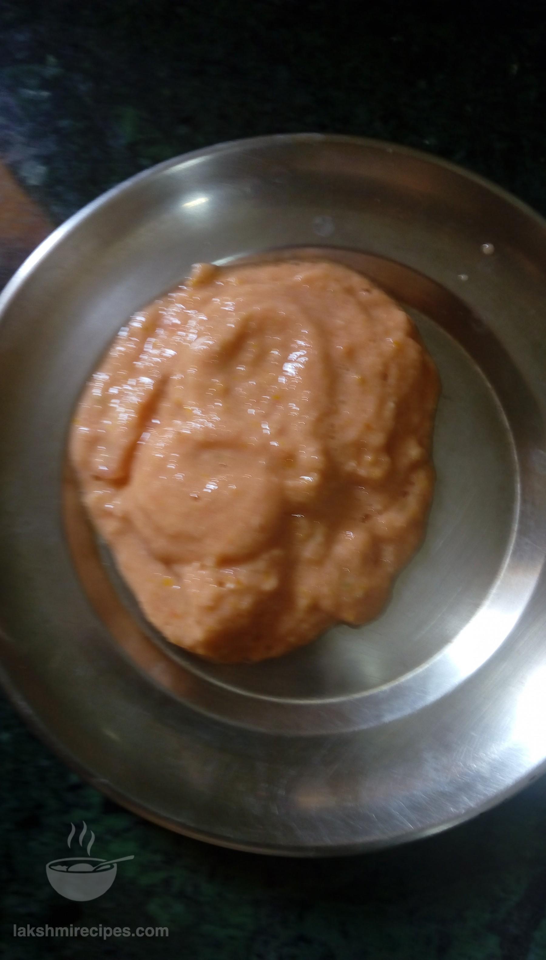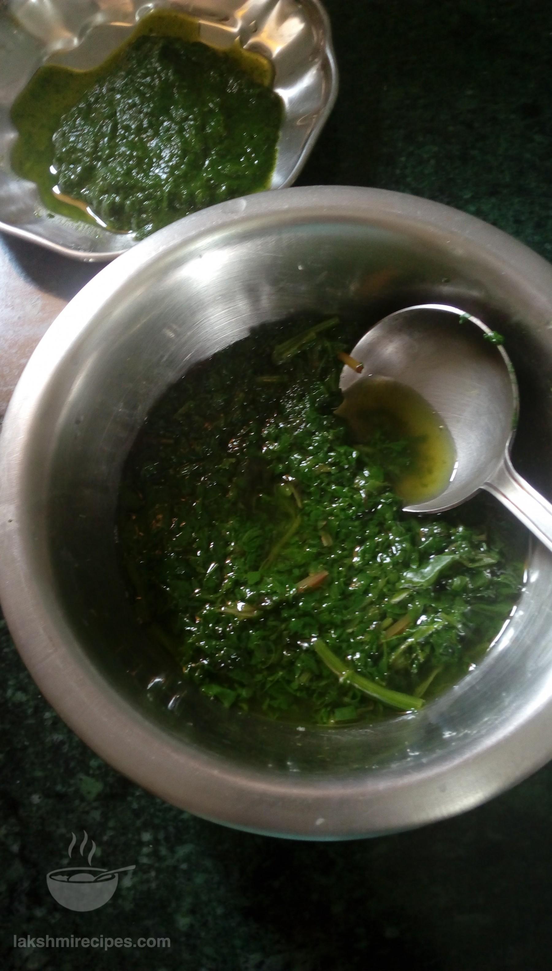 - Now open the cooker lid, transfer the cooked spinach (paalak) leaves to a deep vessel and chafe the cooked spinach leaves to form a paste. (you can also strain the spinach leaves from the water and grind them to a fine paste in a mixer grinder). Keep the spinach water in a seperate vessel for use in later step.