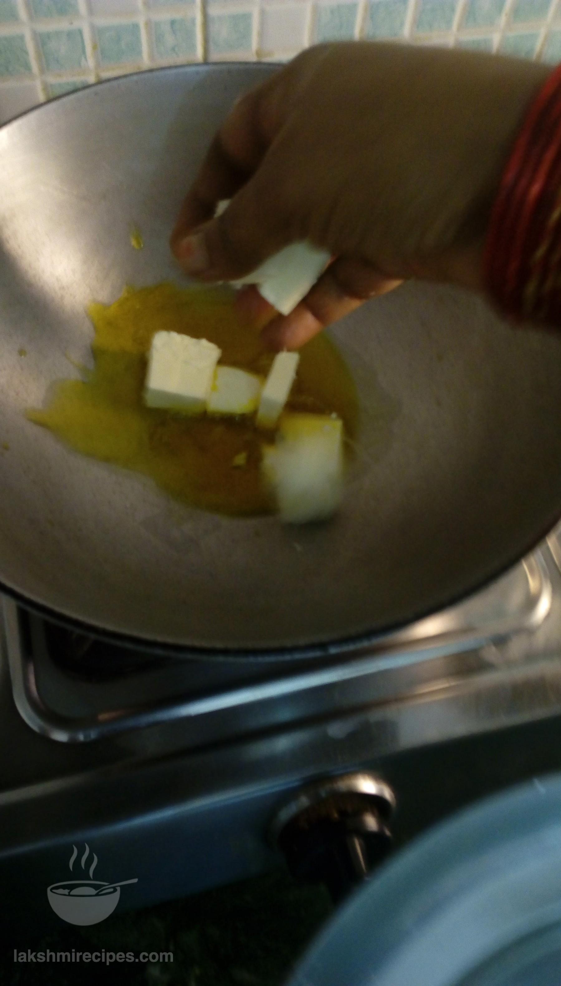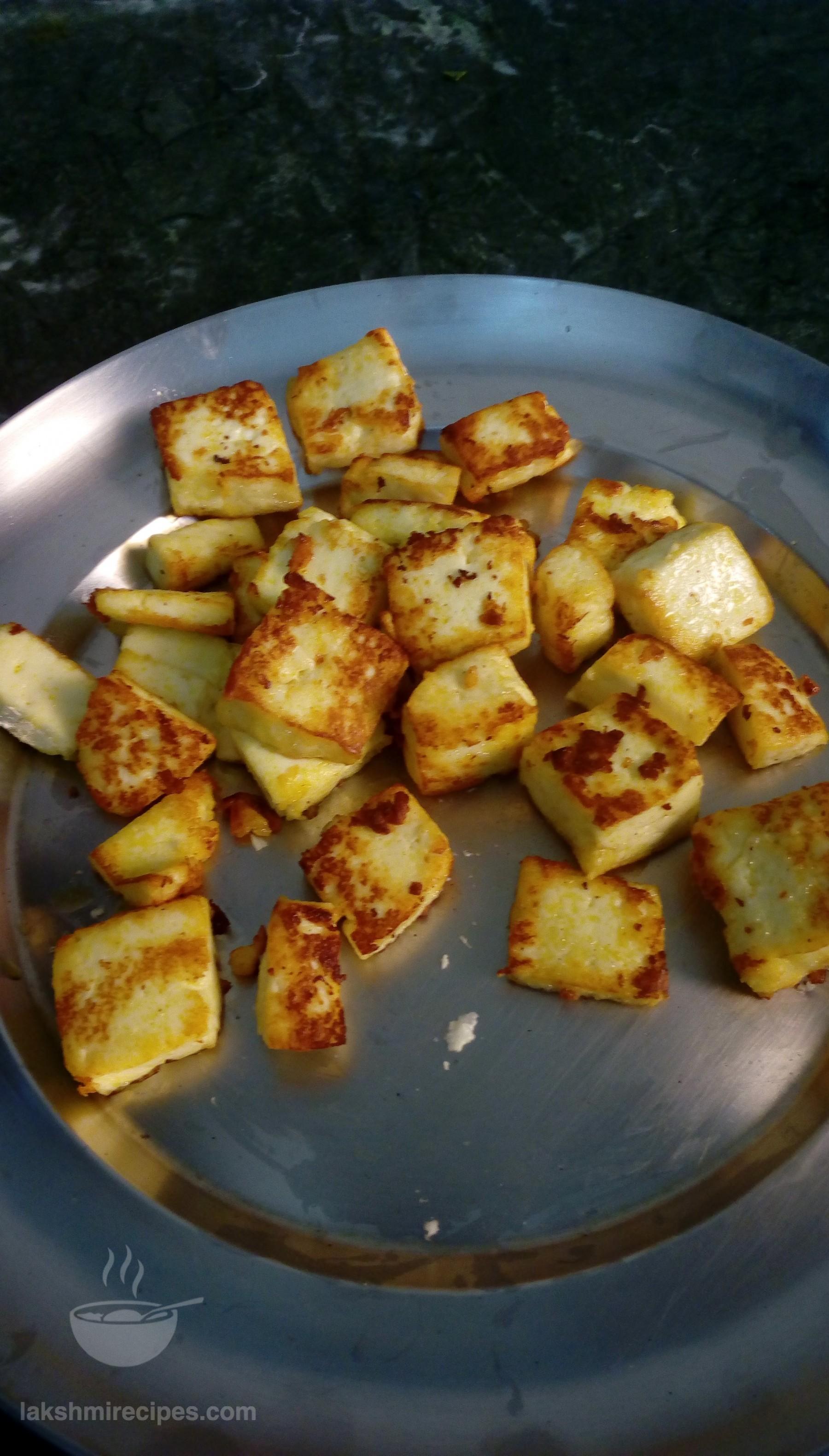- Now heat some oil in a kadhai and during this time cut the paneer into small cubes. Add these cubes to the kadhai and saute them till they turn a little red. Transfer these fried cubes to a plate.