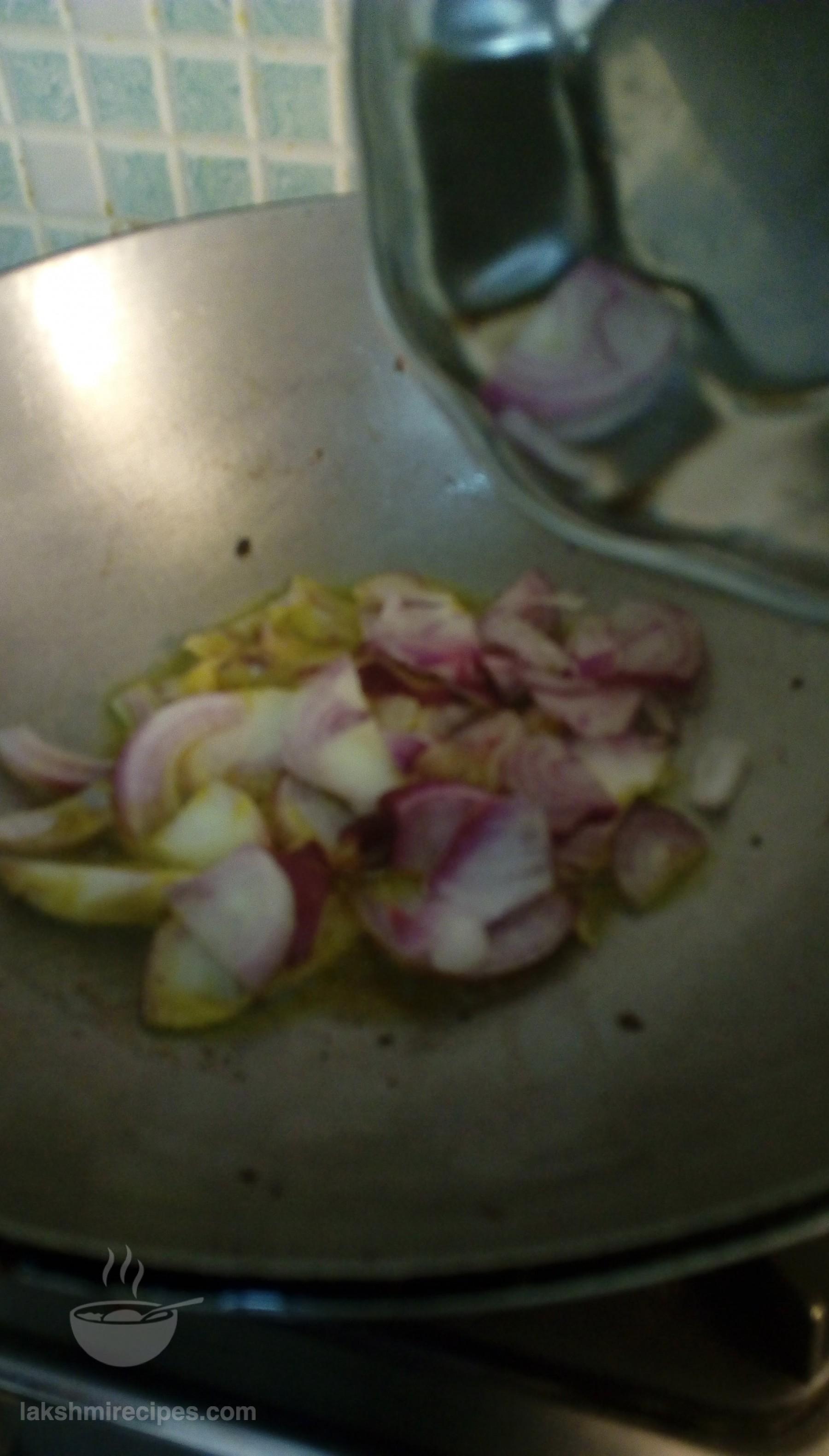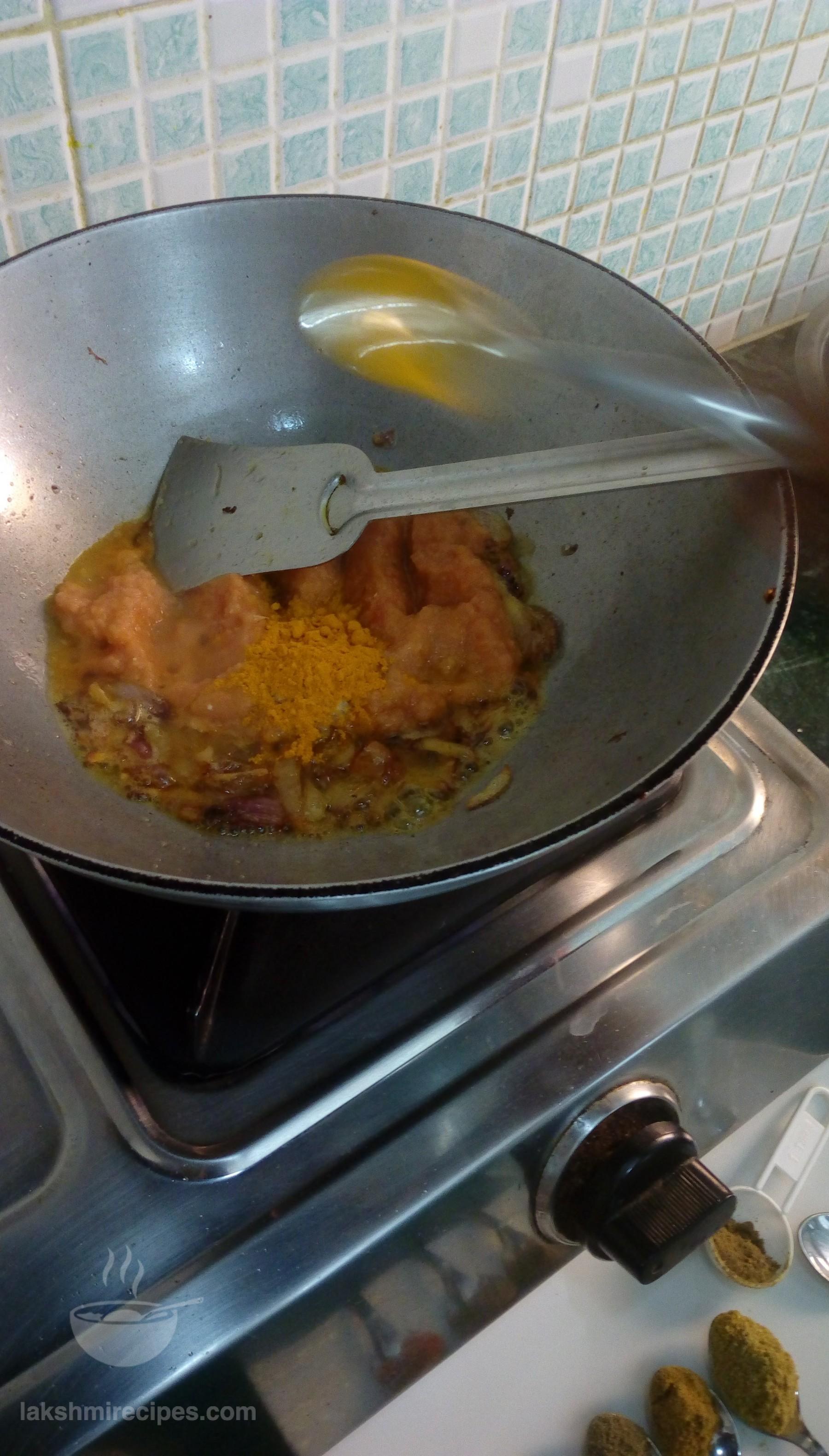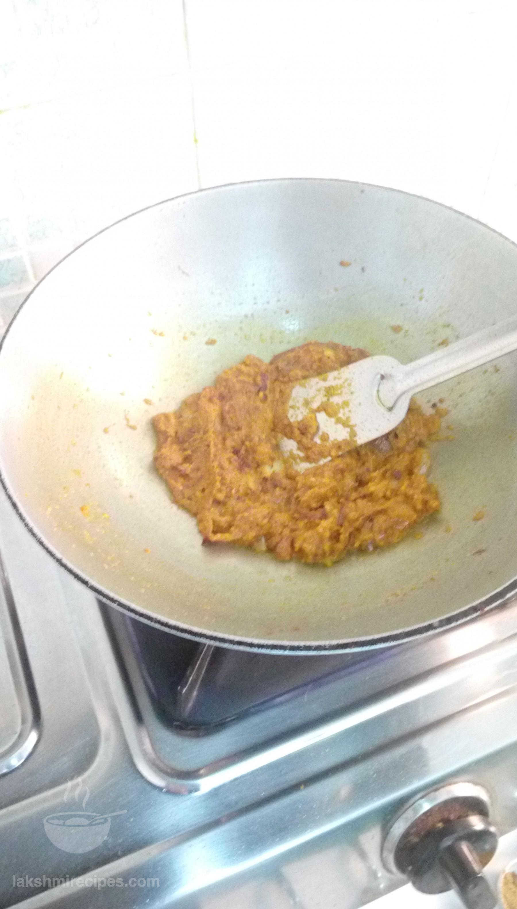 - In the same kadhai add the finely chopped onions. As they saute and turn light red in color add the tomato and ginger -garlic paste prepared in step 2 to the kadhai.