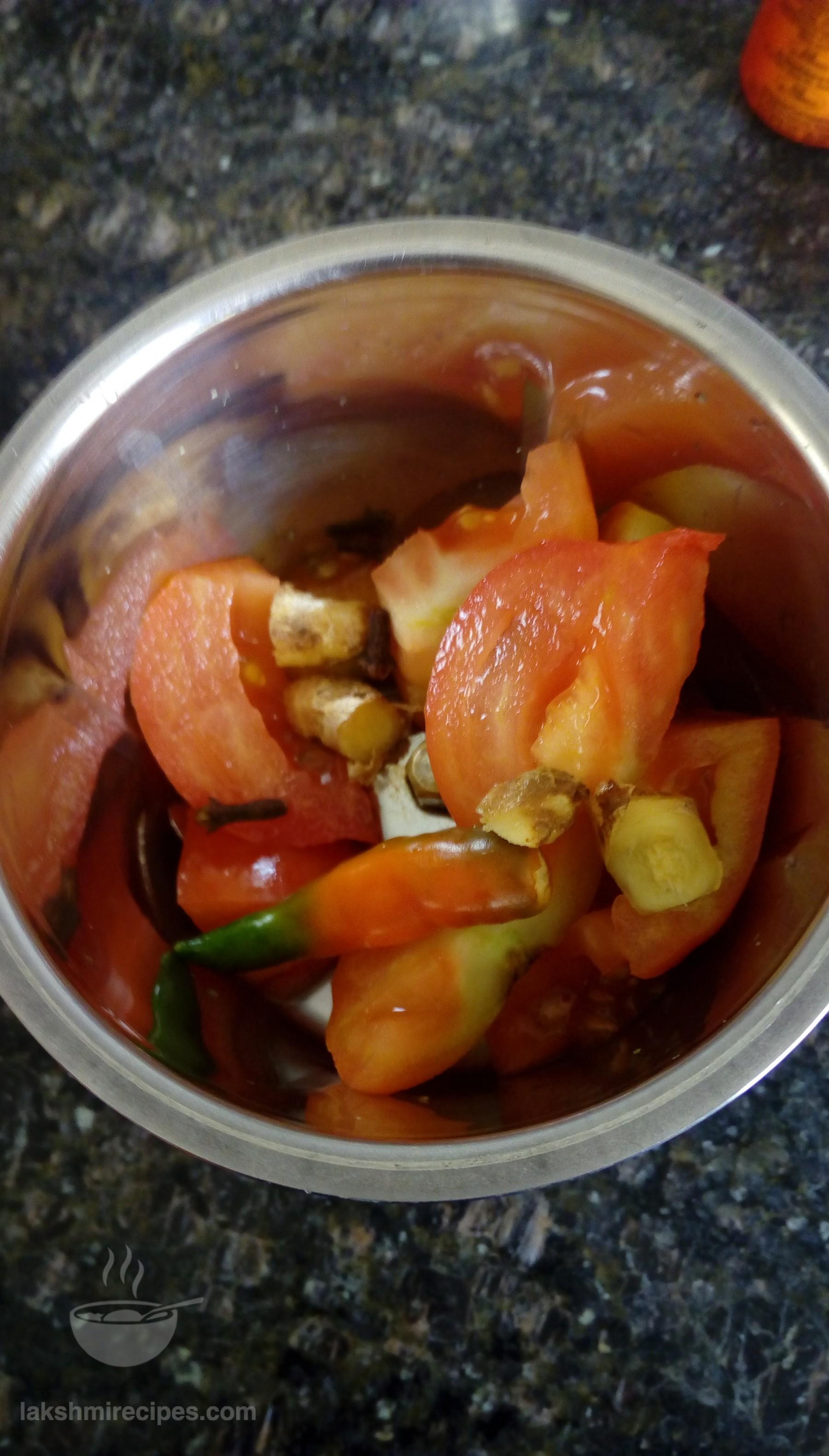 - Take the chopped tomato (tamatar), green chilli (hari mirch), ginger (adrak) and cloves (laung) in a mixer jar and grind the ingredients together into a fine paste. Transfer this paste to a big plate.