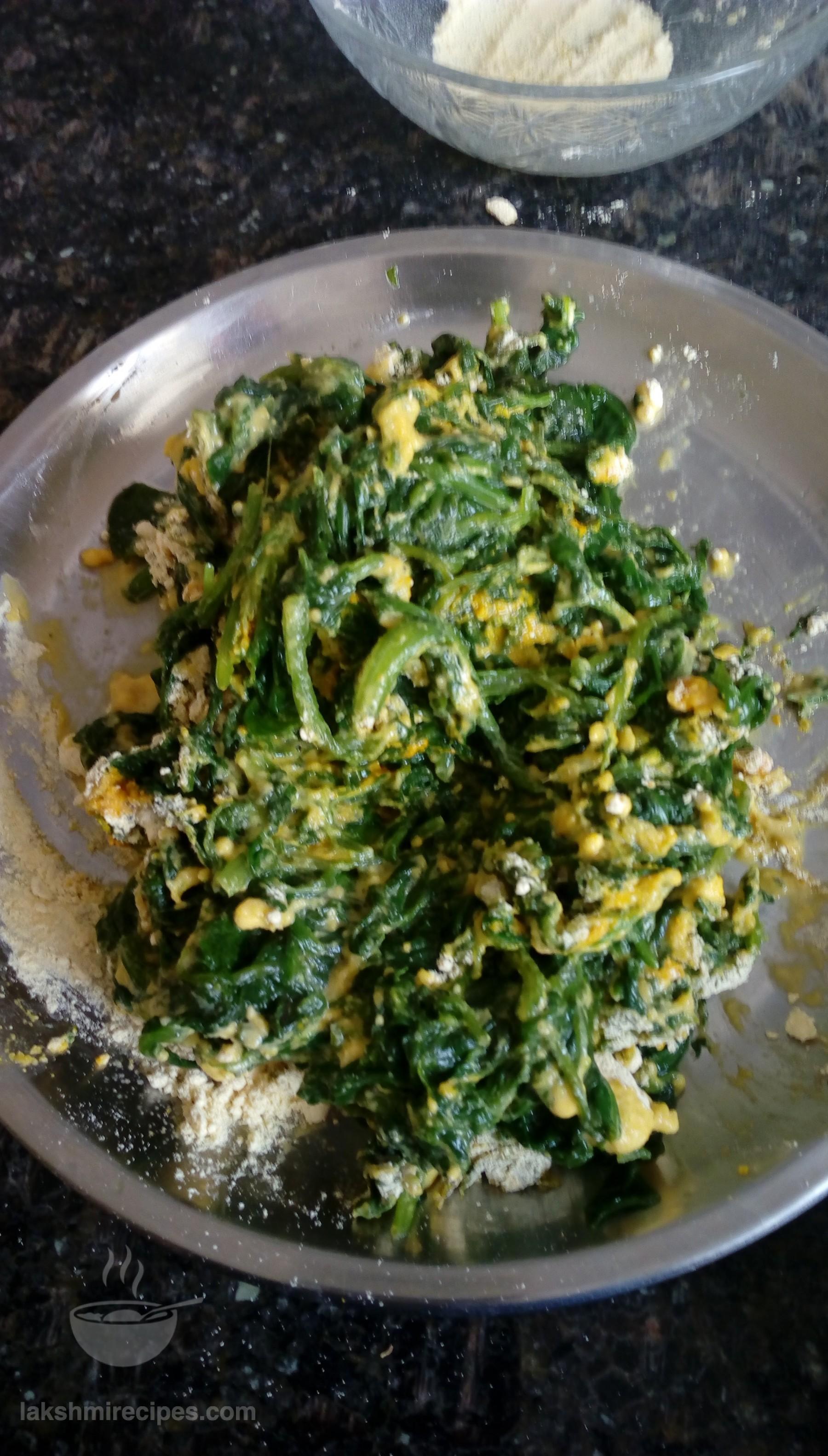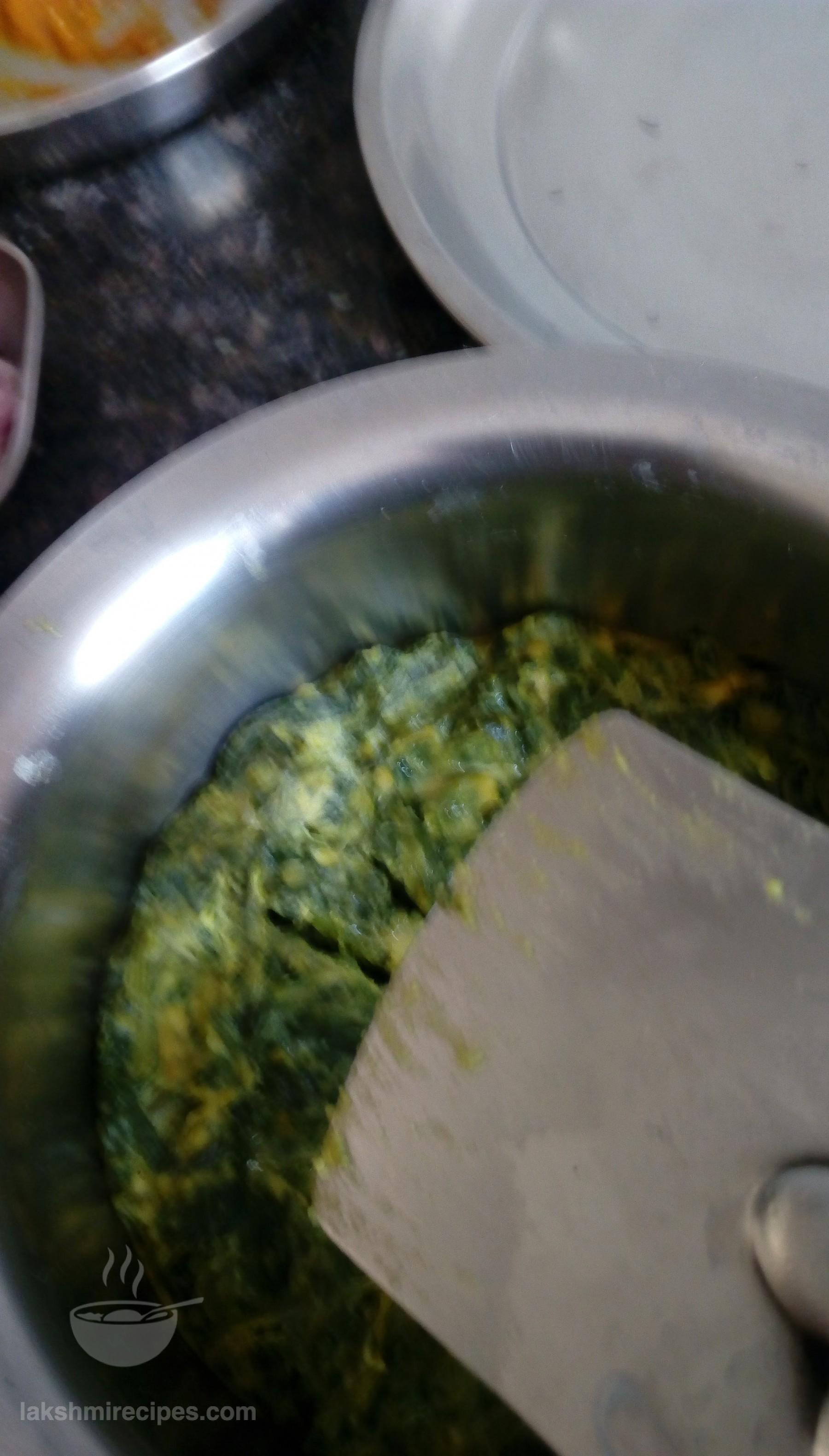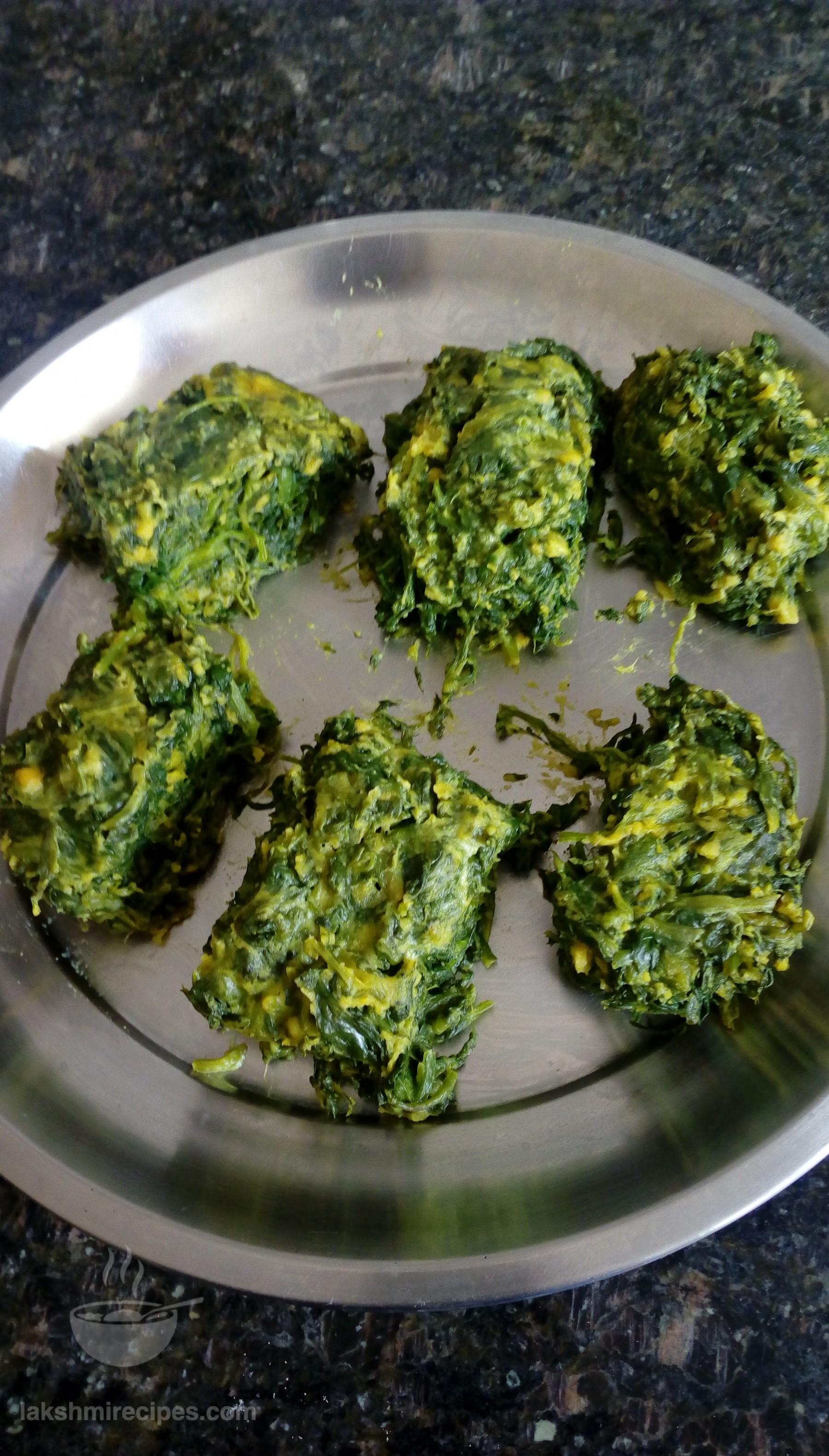 - Now turn off the flame and poke the spinach mixture (the mixture will get cooked like a cake) with a knife to check if it is cooked. Allow this mixture cake to cool, transfer it to plate and then cut small pieces of it.