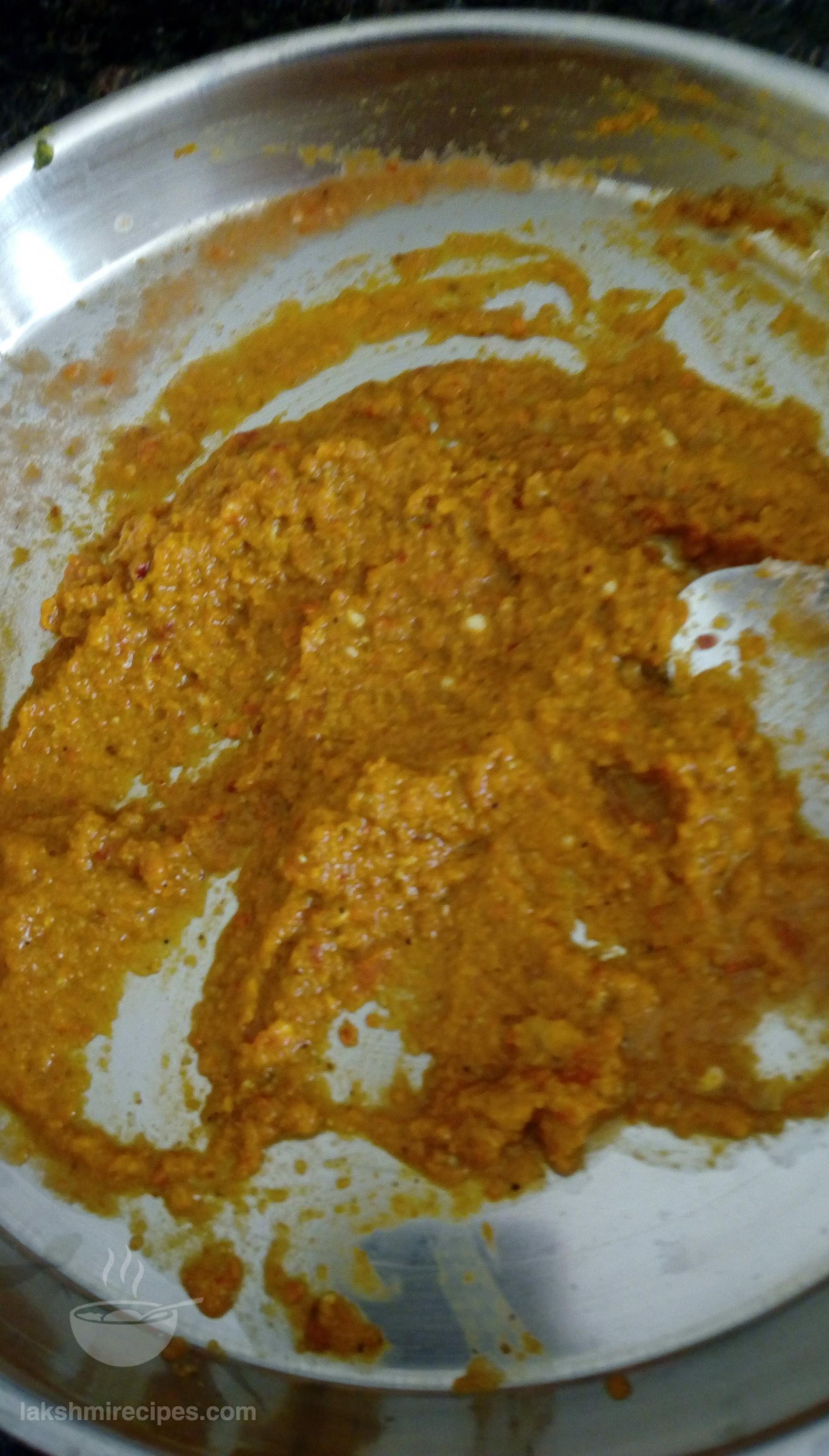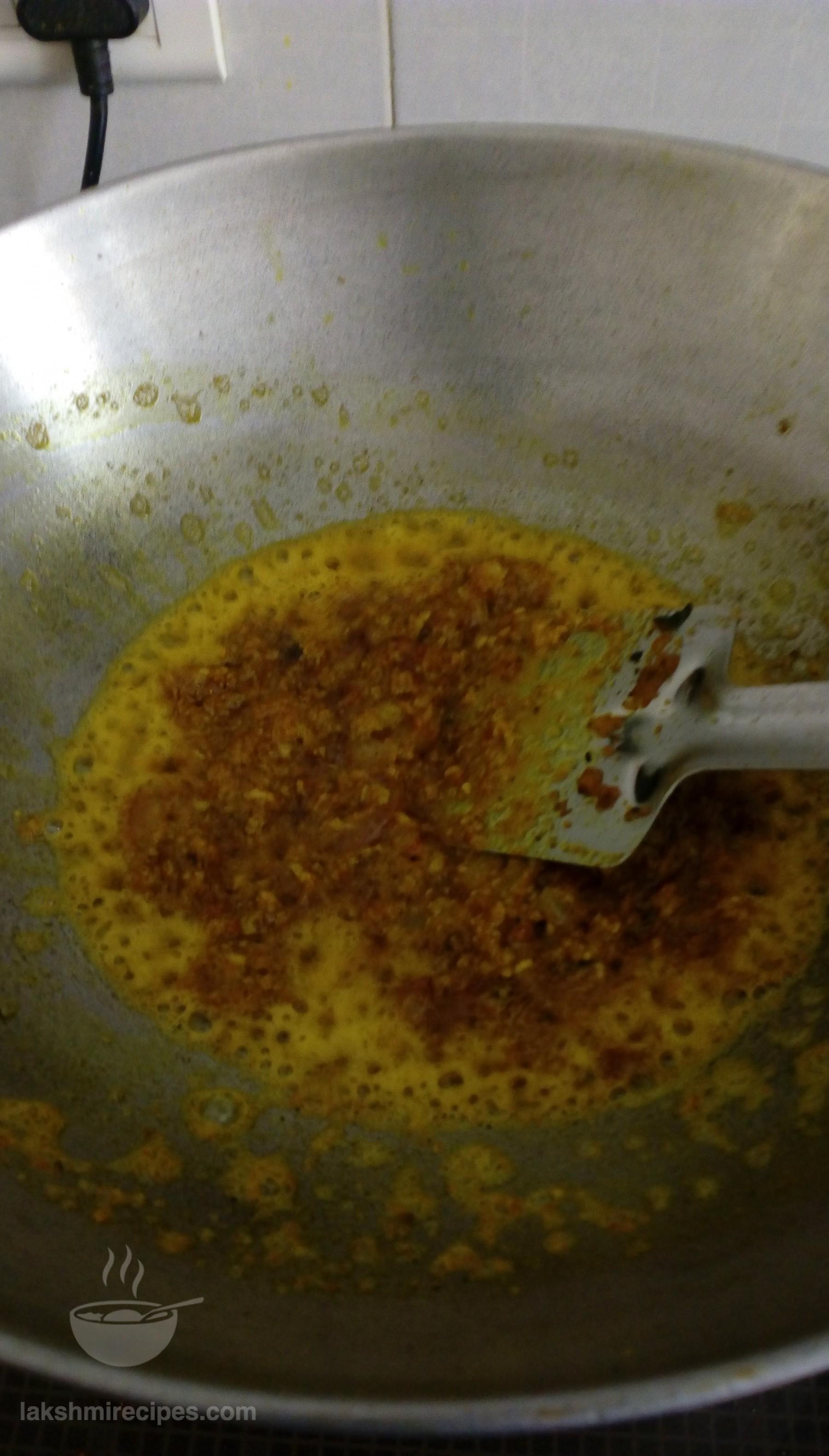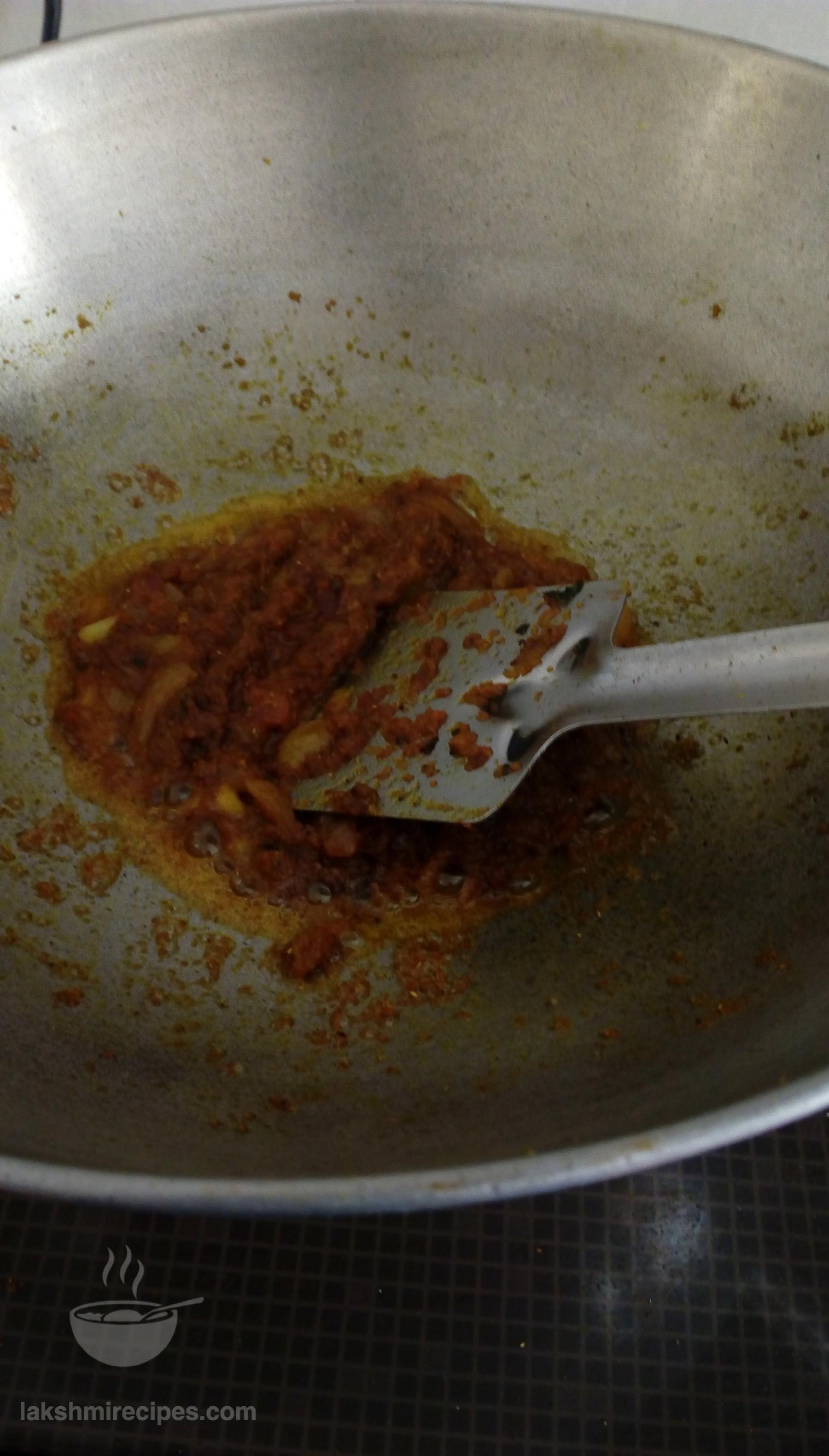 - Then add the other part of the masala paste (prepared in step 5) into the kadhai and cook it nicely till it turns red and the oil begins to seperate from the masala.