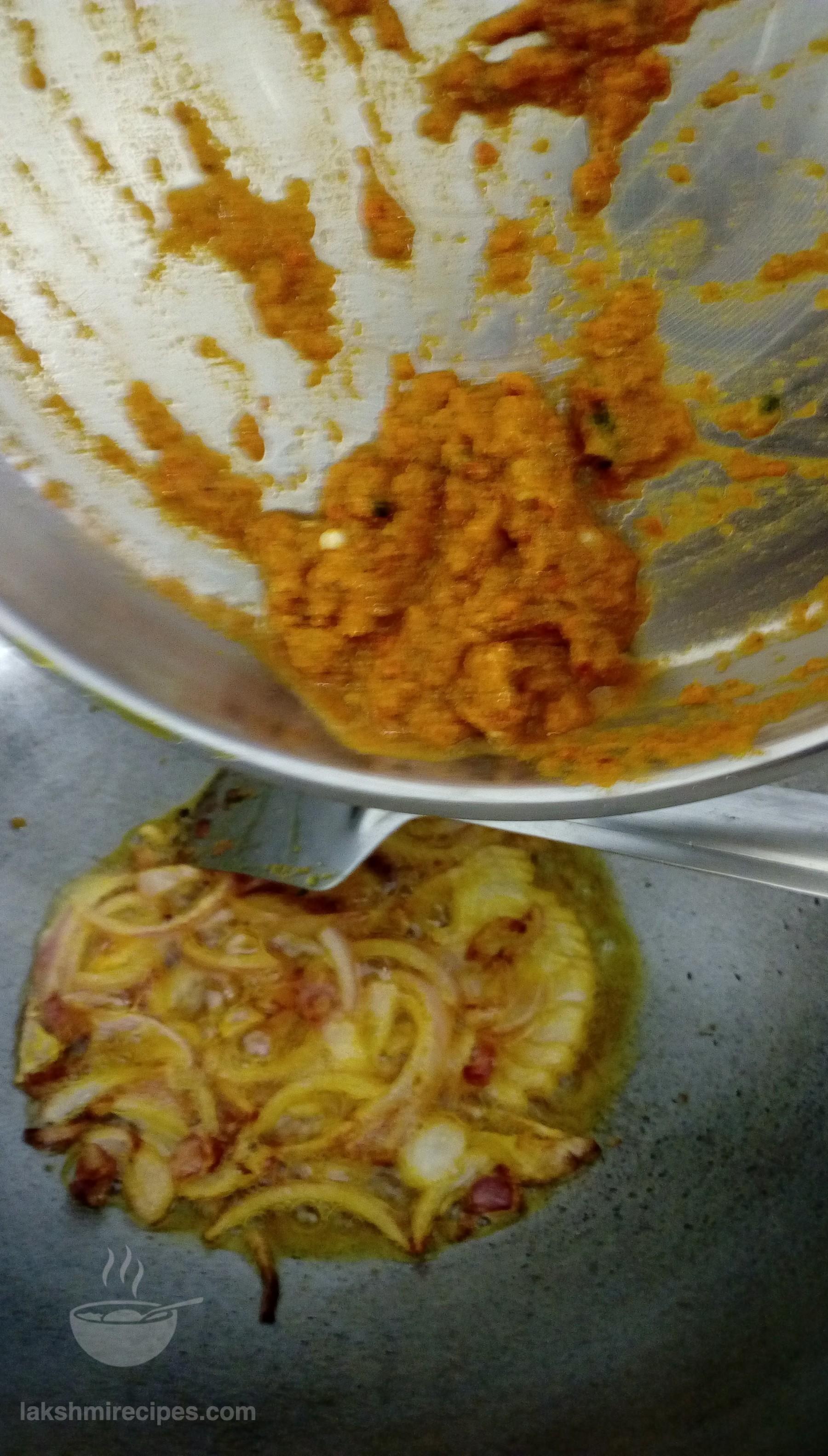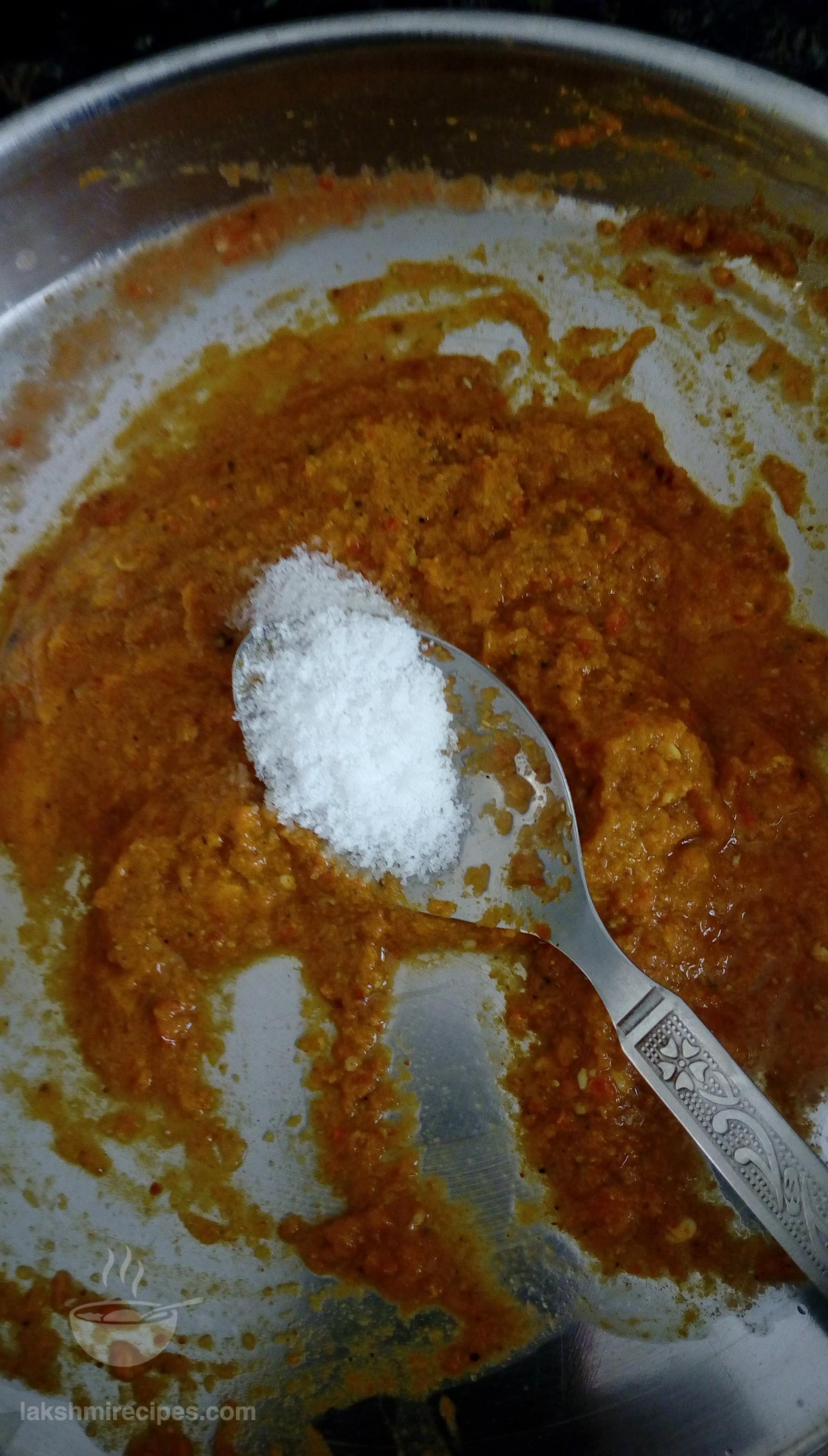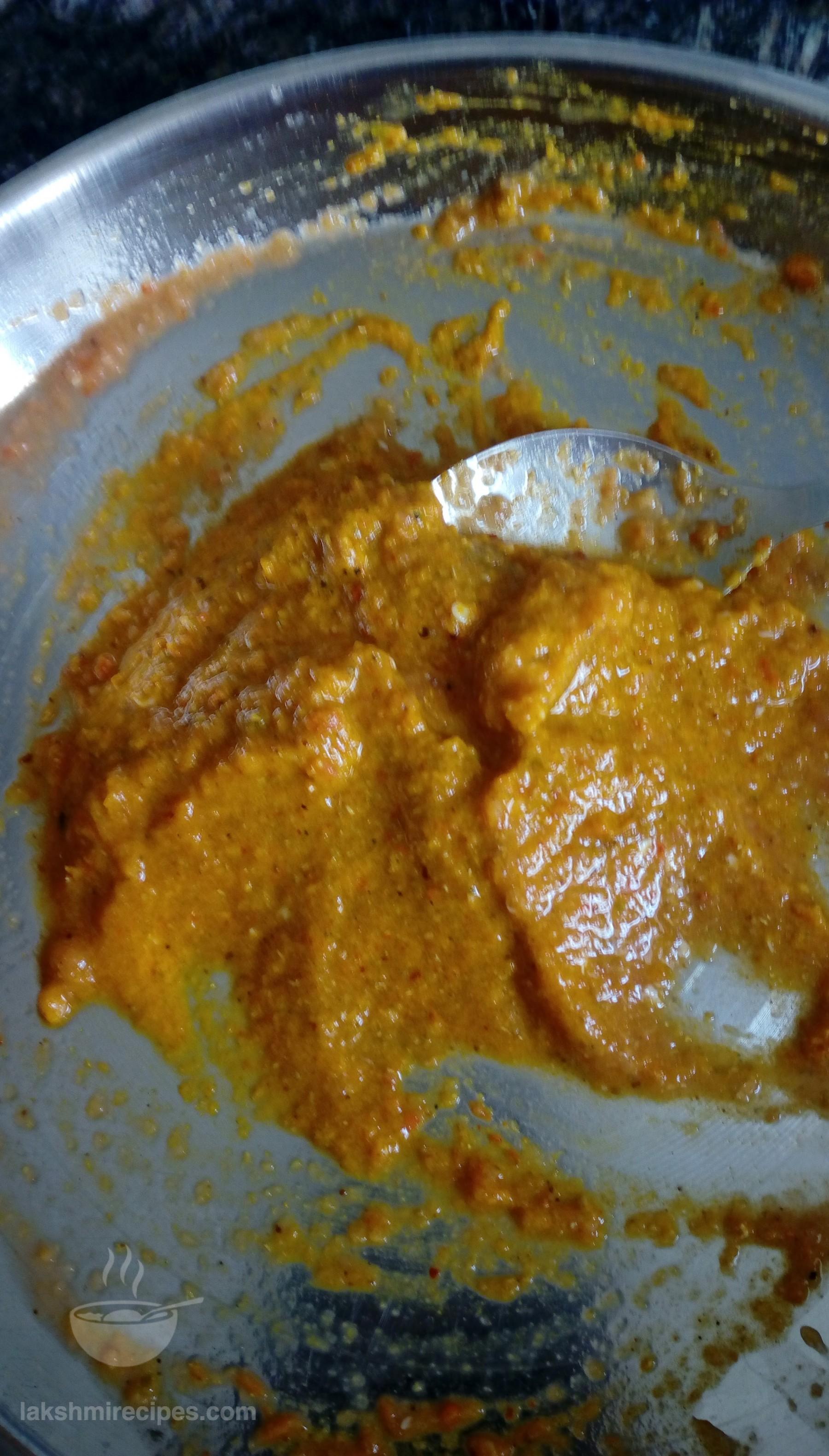- Then add the other part of the masala paste (prepared in step 5) into the kadhai and cook it nicely till it turns red and the oil begins to seperate from the masala.