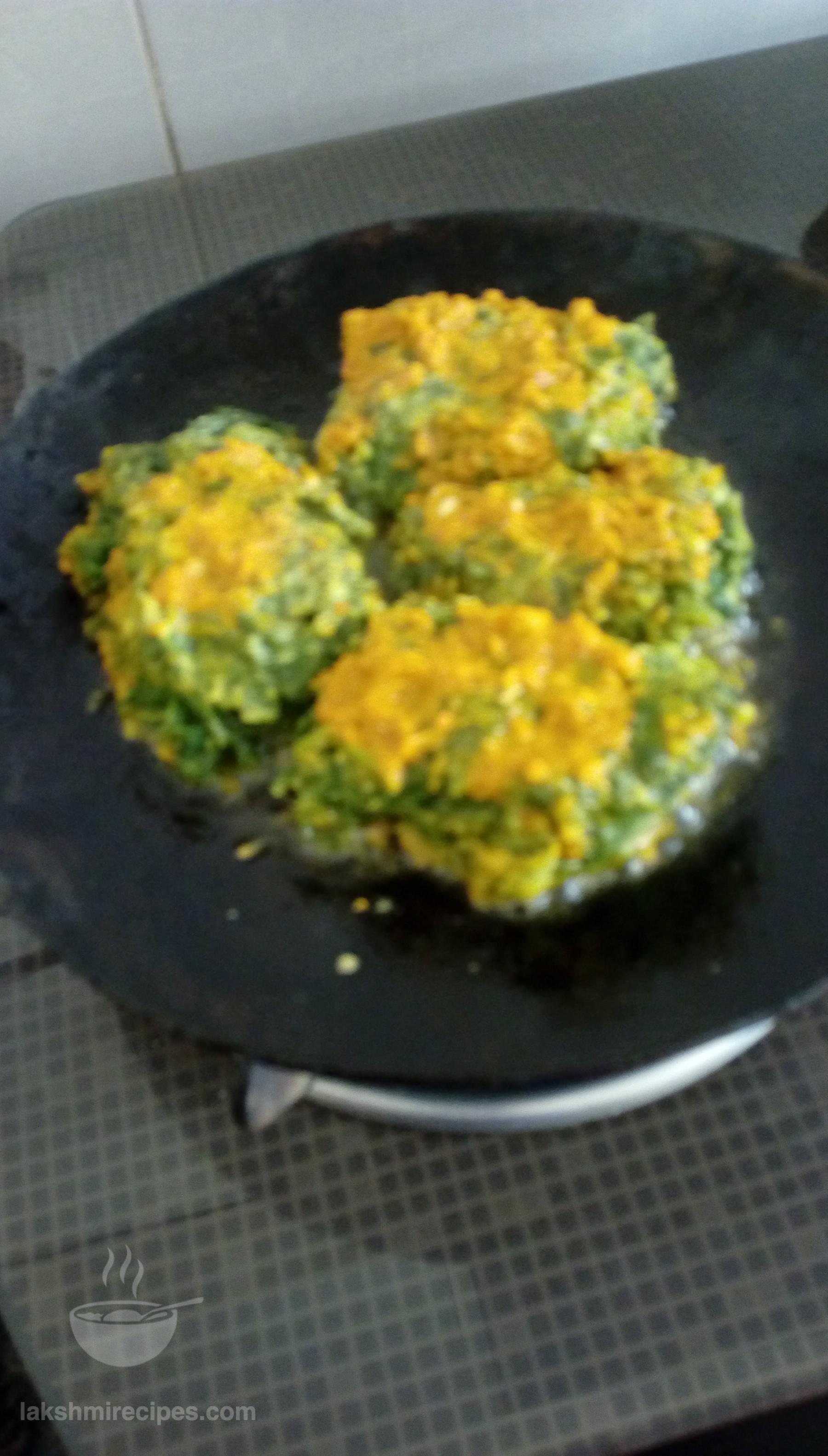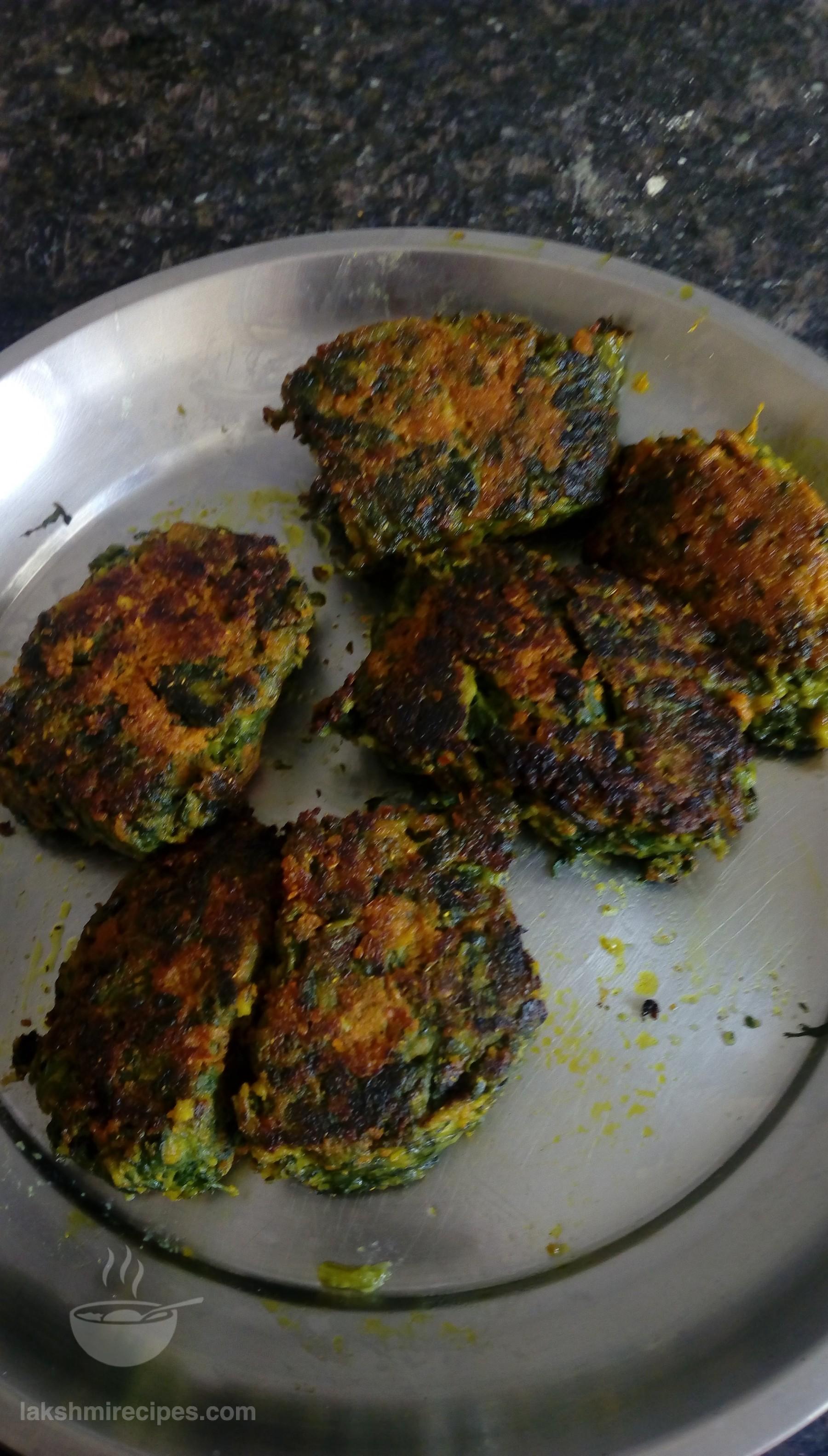 - Now heat 1 tea spoon mustard oil on a tawa. Dip the spinach mixture pieces (prepared in the previous step) into one past of the masala paste (prepared in step 5) and then place them to cook on the tawa. When one side turns crispy red then flip gently to cook the other side till in the same manner. (If required pour 1-2 tea spoon oil more). Transfer the cooked piece to plate and cook the remaining pieces in the similar manner.