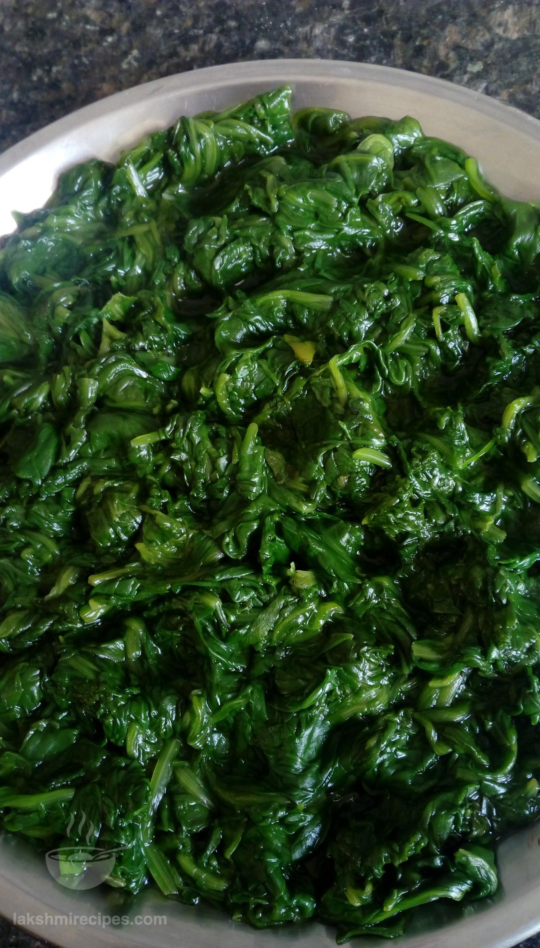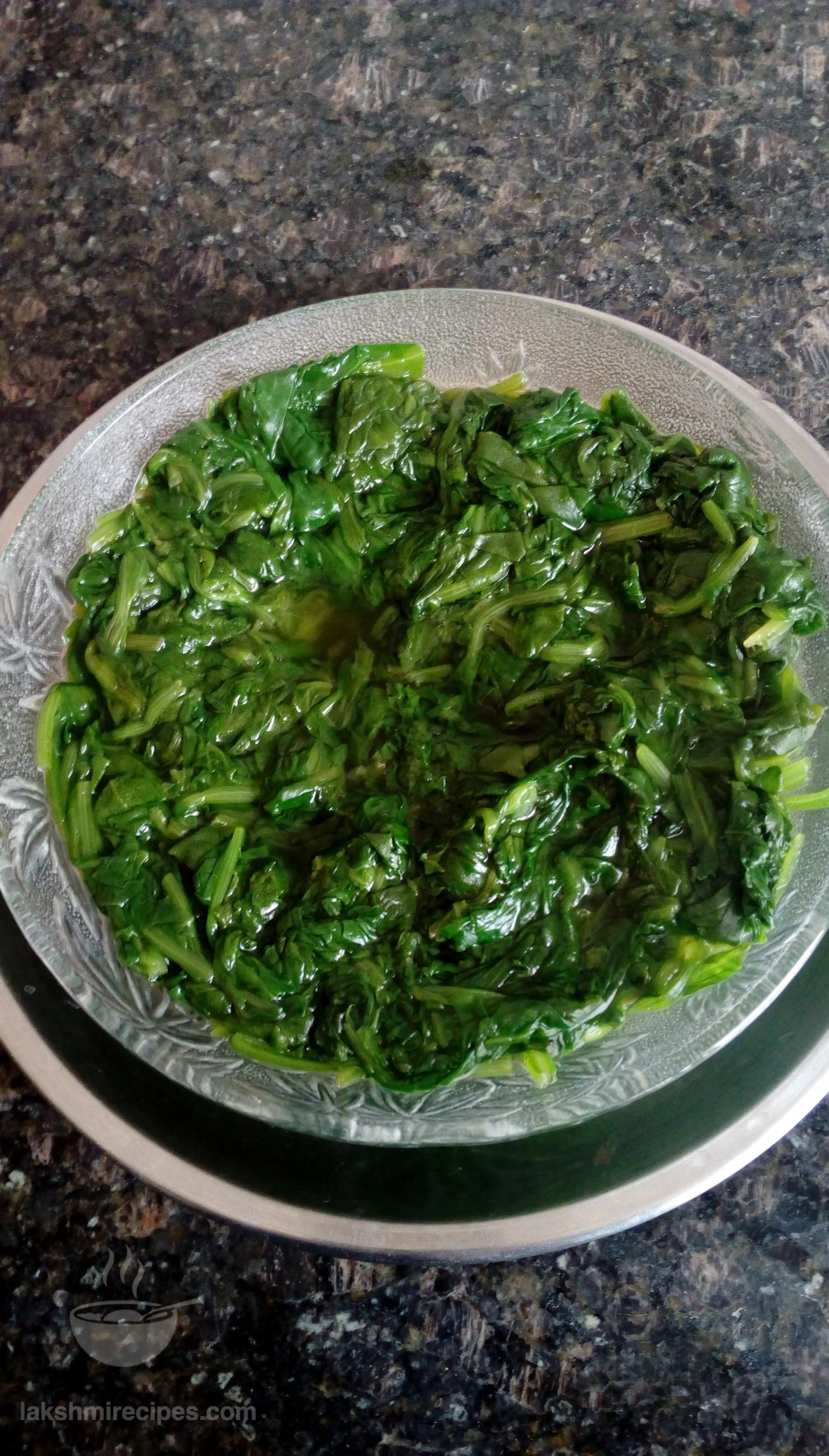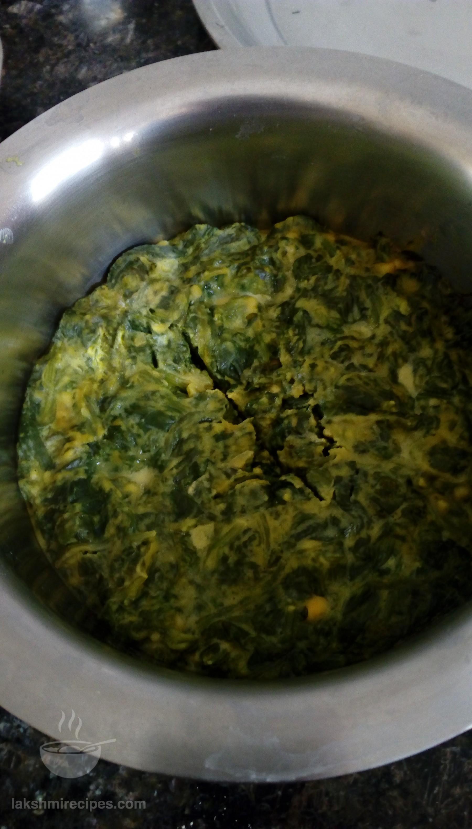 - Then take some water in a big deep vessel (bada bhagona), set it to boil and place the vessel containing the spinach leaves mixture in it. Cover with a lid and cook 12 minutes.