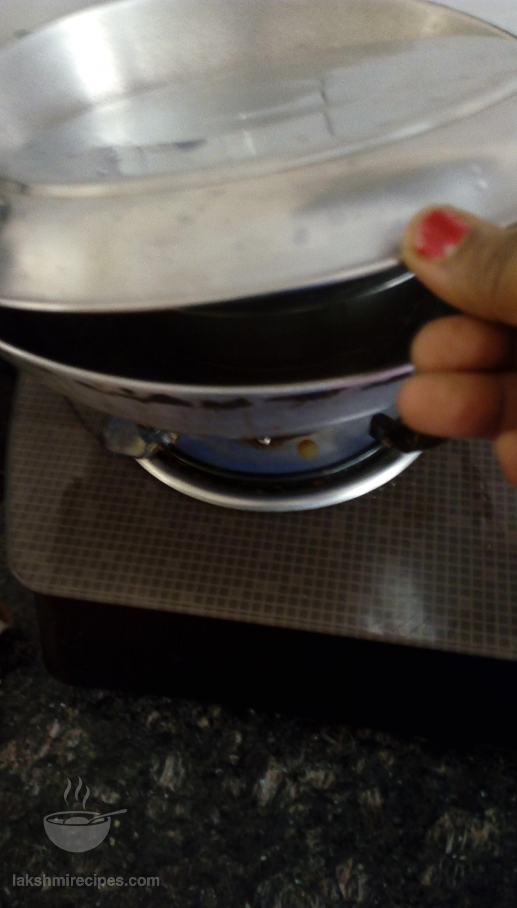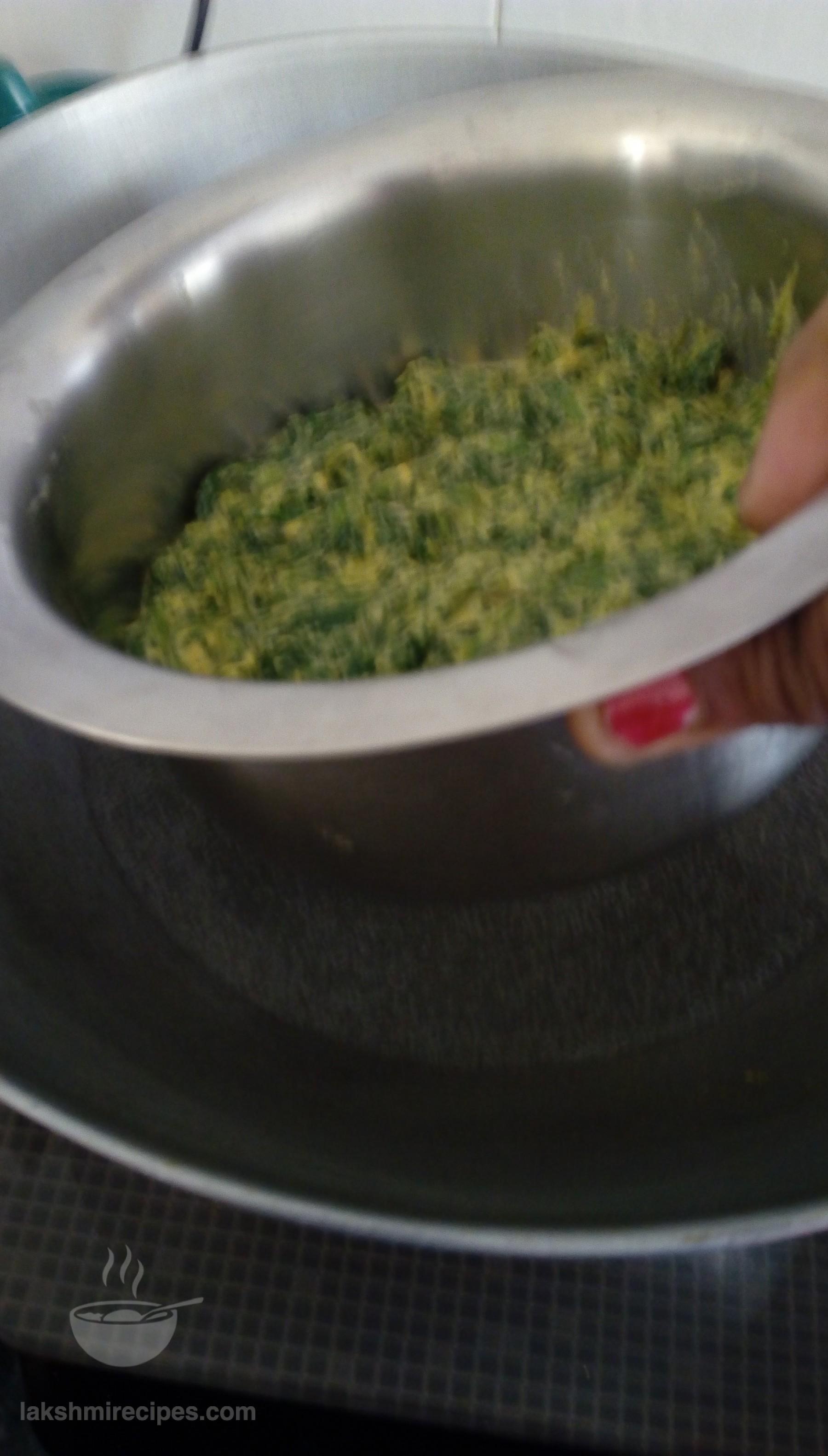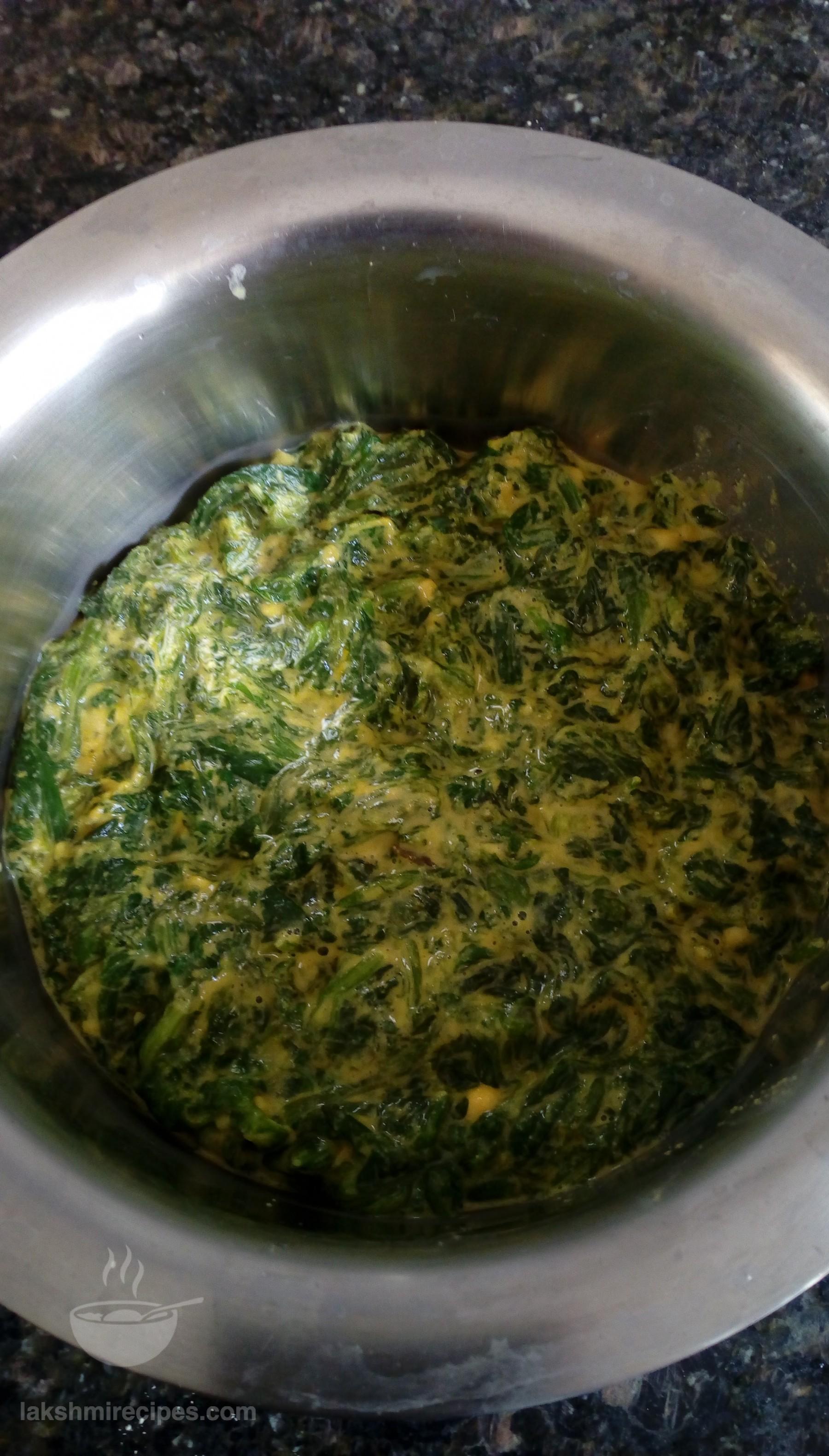 - Then take some water in a big deep vessel (bada bhagona), set it to boil and place the vessel containing the spinach leaves mixture in it. Cover with a lid and cook 12 minutes.