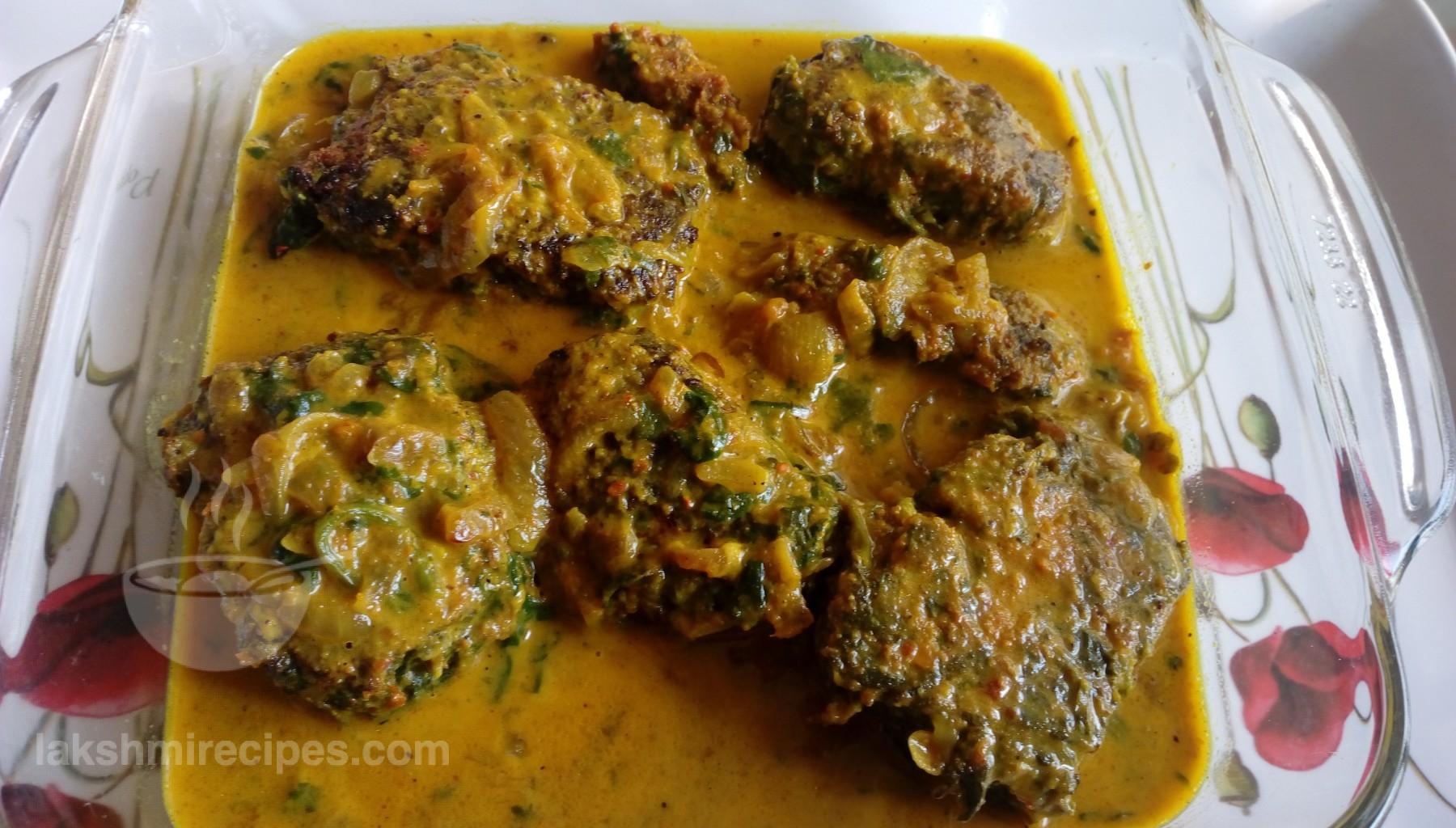 - Now transfer the gravy to a beautiful serving dish. Place the crispy pieces of spinach leaves (palak ke patte) in the gravy. And the beautiful, creamy and tasty palak kofta curry is ready to be served.