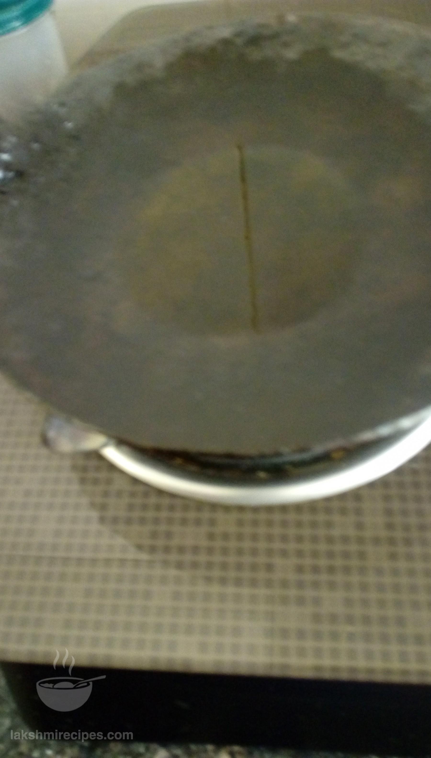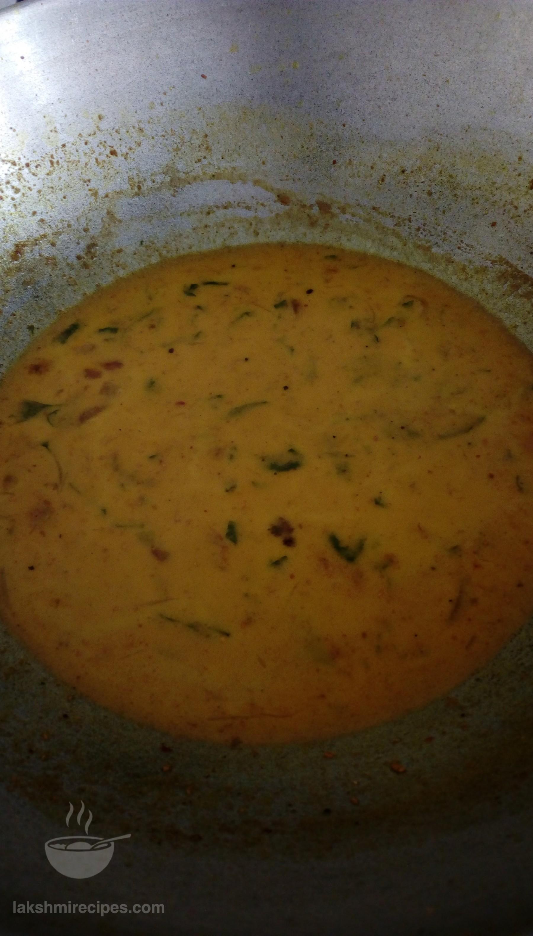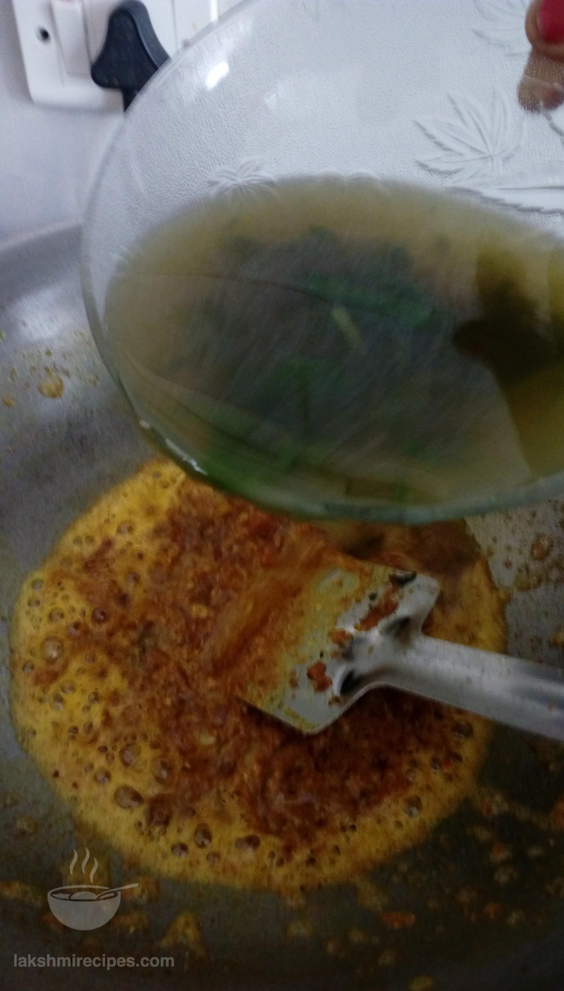 - Now add the spinach water left in the cooker after pressure cooking the spinach leaves (palak ke patte) to the kadhai. Stir and allow the ingredients to boil on high flame to form a smooth gravy. (If required add more water. You can alter the consistency of the gravy as per your requirement.)