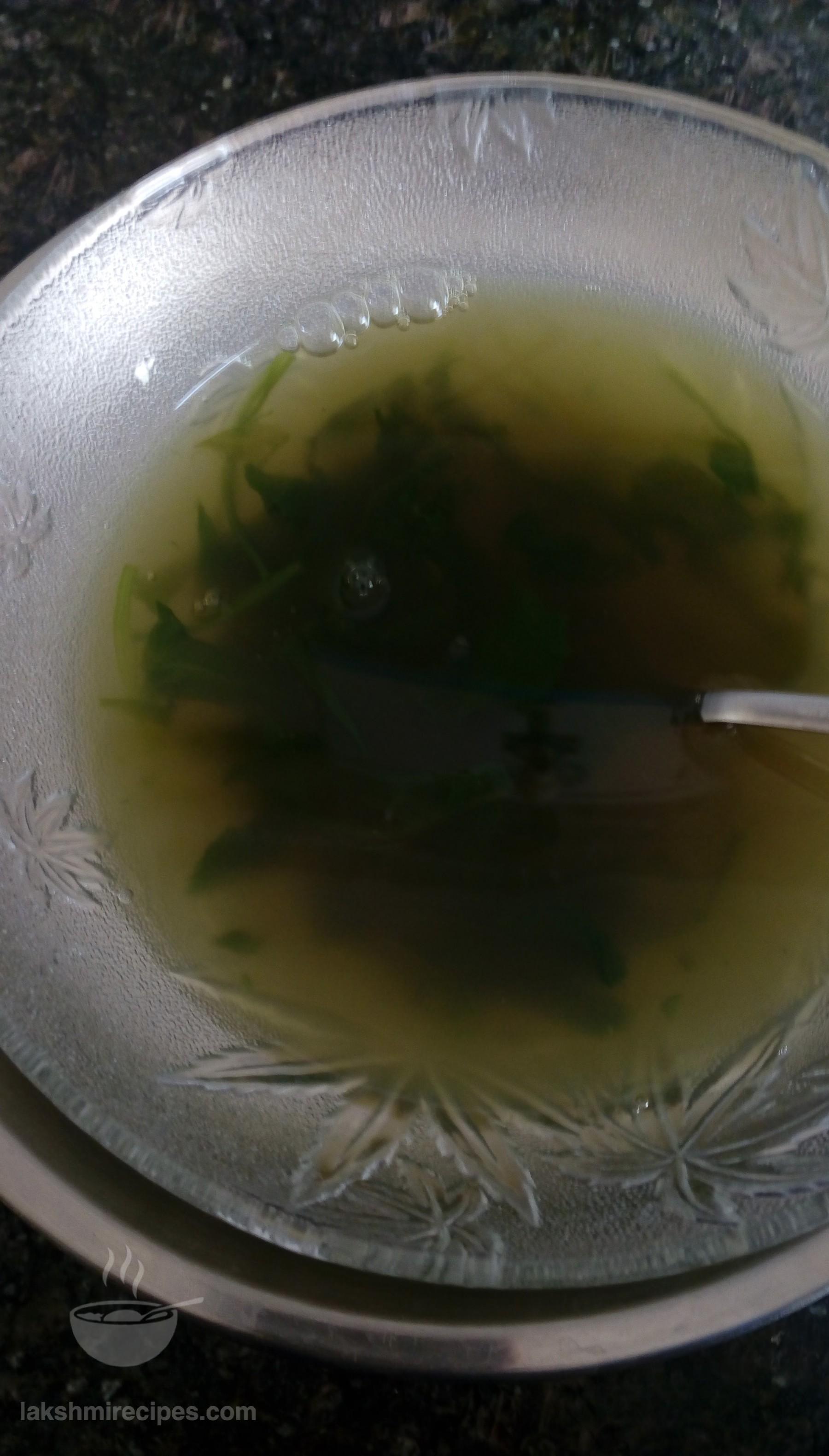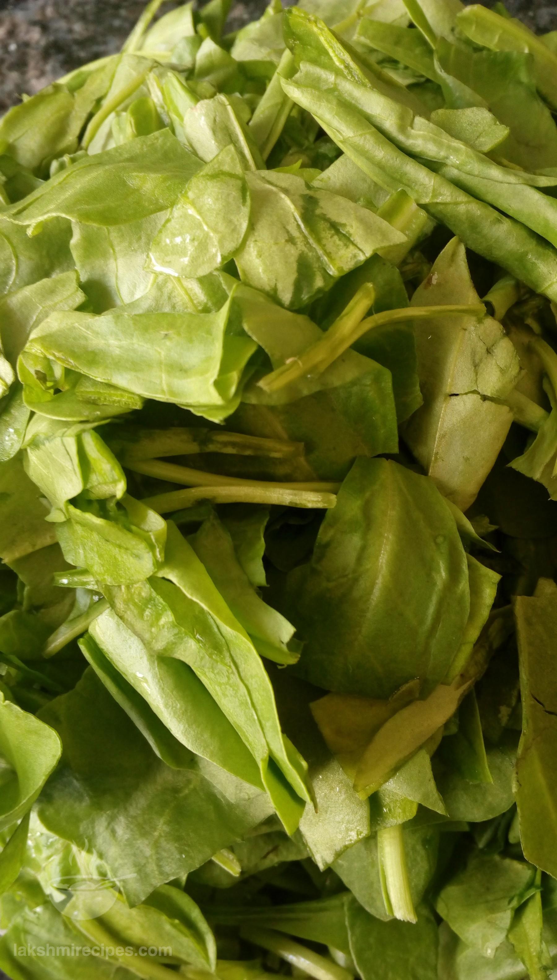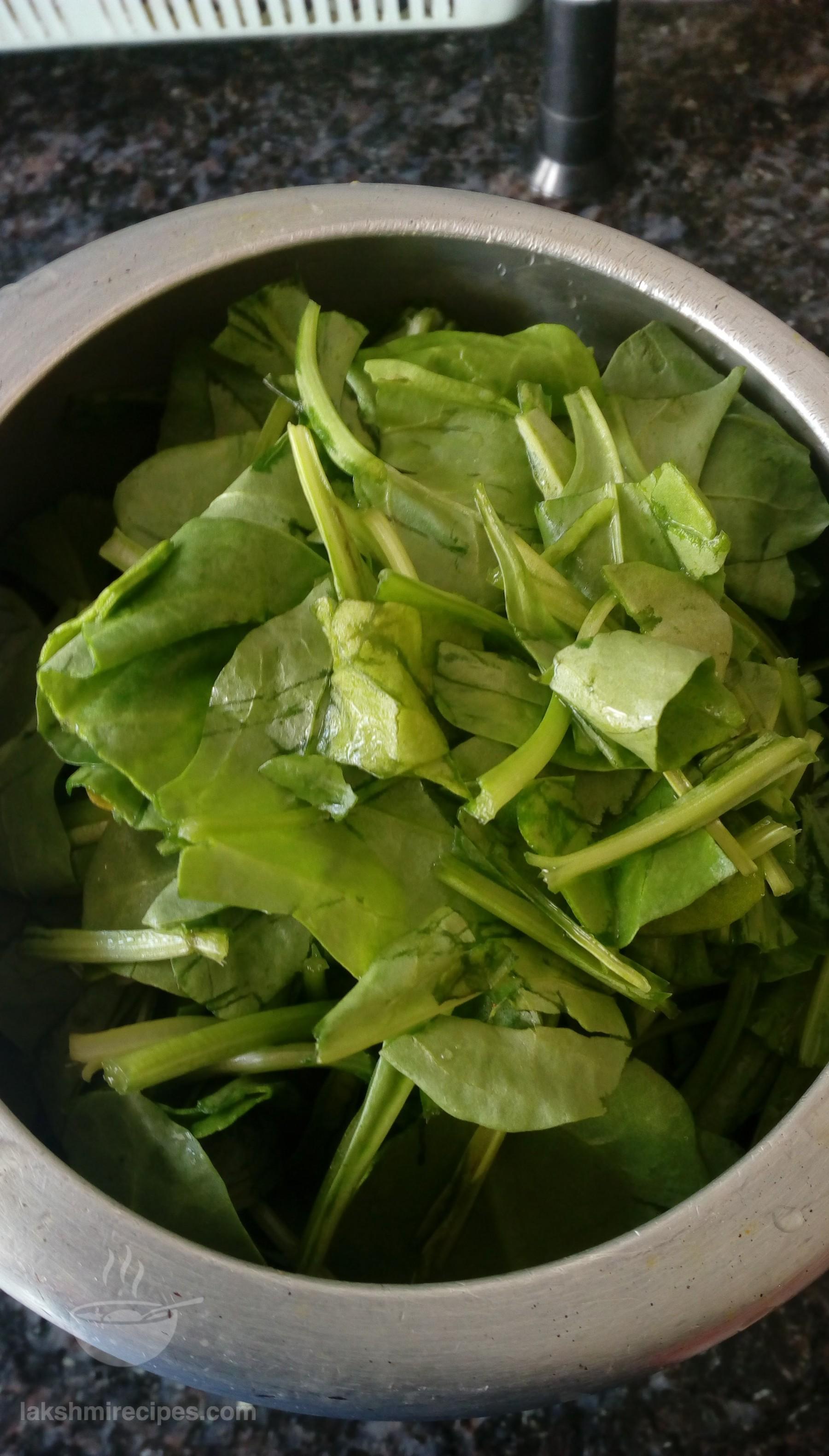 - Cut the spinach leaves (palak ke patte) from the stem and leave them submerged in water for some time. Then strain off this water and wash the leaves nicely with plain water twice.
