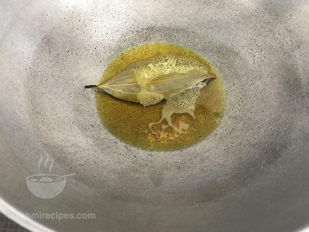 - अब कढ़ाई में 2 बड़ा चम्मच सरसों का तेल डालकर गरम करें। फिर और गरम तेल में हींग और तेज़ पत्ता डालें।
