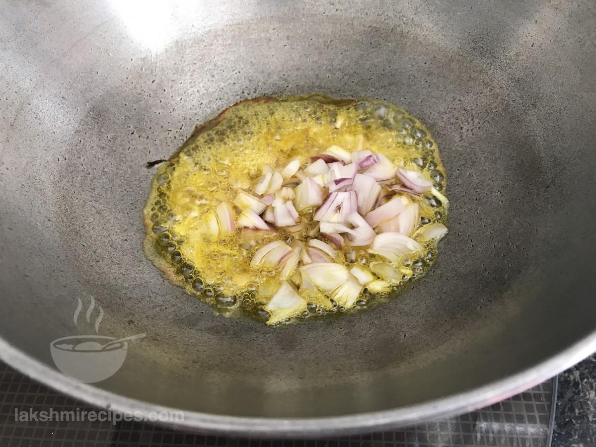 - Then add the finely chopped onion to the kadhai and saute the onion till it turns golden brown in color.