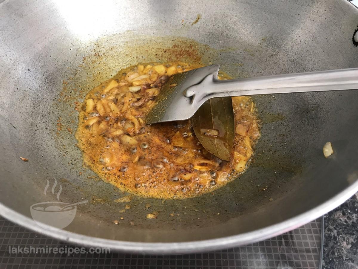 - फिर कढ़ाई में बारीक कटा हुआ प्याज डालकर रंग में सुनहरा भूरा होने तक भूनें।