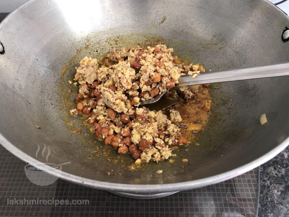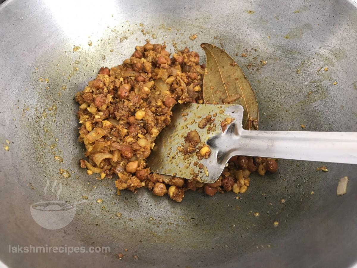 - When the oil begins to seperate from the cooking ingredients then add the coarsely ground black chickpeas or kala chana and the few whole black chickpeas or kala chana to the kadhai. Stir to mix the ingredients together and saute them together for 2 minutes.