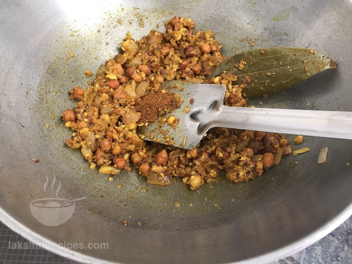 - जब तेल मसालों से अलग होने लगे, तो कढ़ाई में दरदरे रूप से पिसे हुए काले चने या साबुत काले चने डालें। सामग्री को मिलाएं और उन्हें 2 मिनट तक सामग्री को चलाते हुए पकाएं।