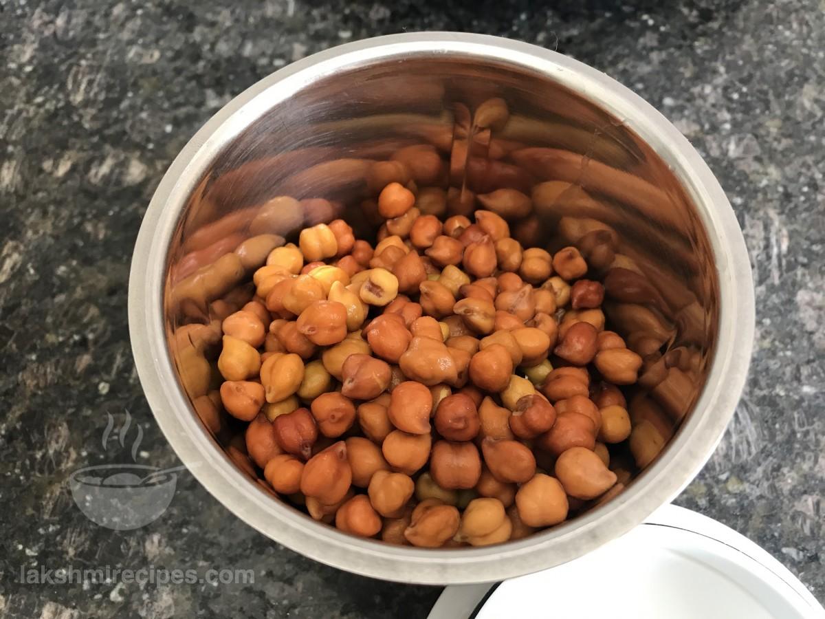 - ढक्कन को 15-20 मिनट के बाद हटाएं और 1-2 चनों को हाथ से मसल कर देखें कि वे पके हैं या नहीं। अगर चने आसानी से मसल जाएं तो गैस बंद कर दें, नहीं तो कढ़ाई को फिर से ढक दें और कुछ मिनट और के लिए पकने दें।