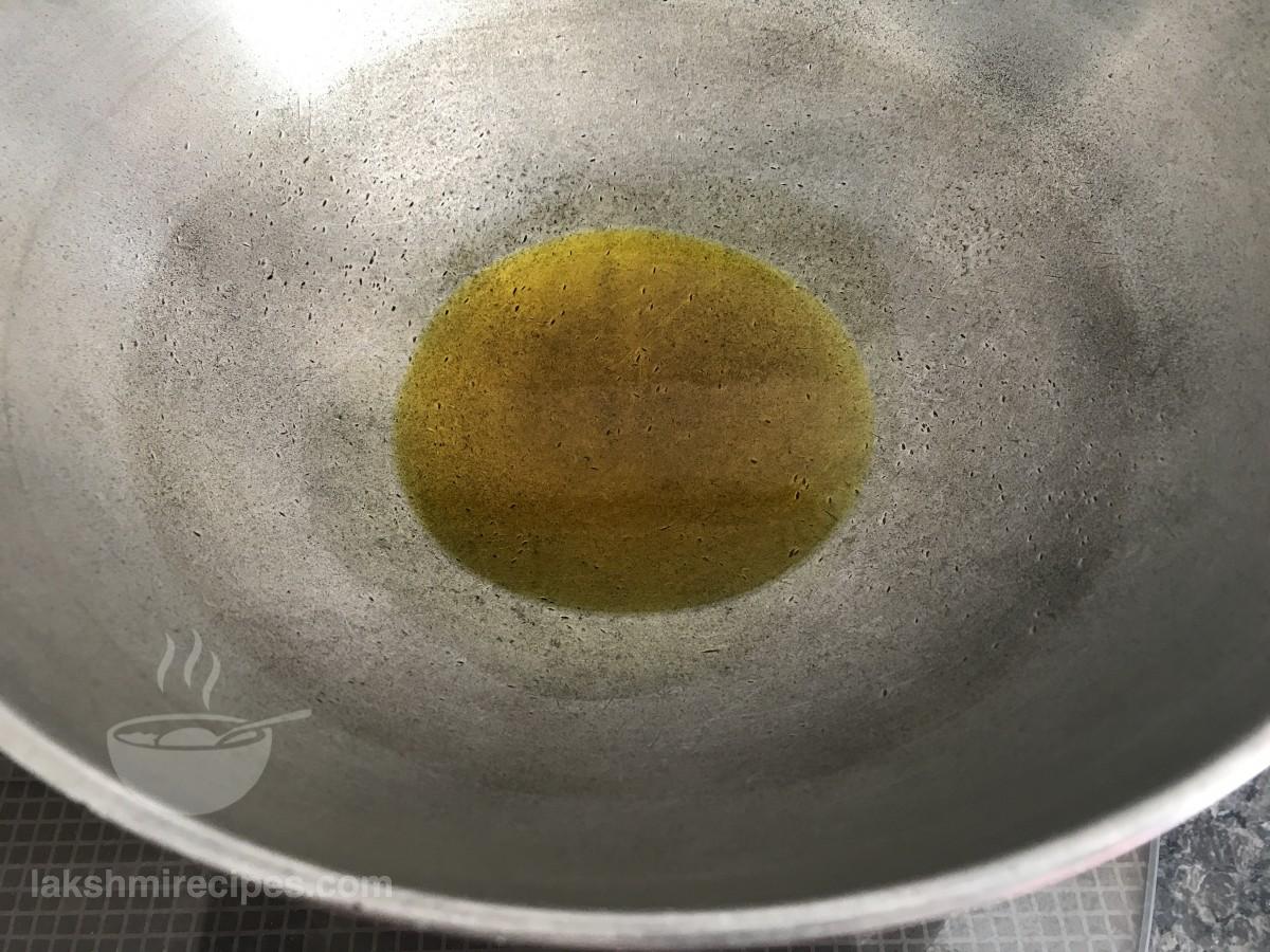 - Now heat 2 table spoon mustard oil or sarson ka tel in a kadhai. Then and add asafoetida or hing and bay leaf or tej patta to the hot oil.