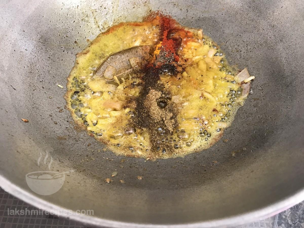 - Now add the powdered spices (turmeric powder, red chilli powder, coriander powder, cumin seeds powder and black pepper powder) and salt to the kadhai. Mix and saute the ingredients together for 1 minute over low flame.