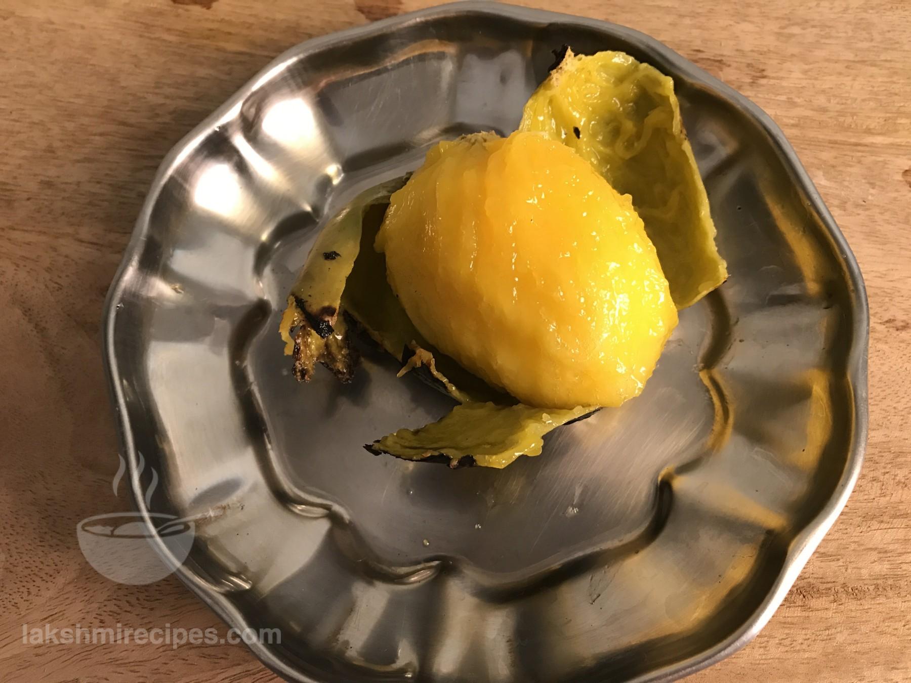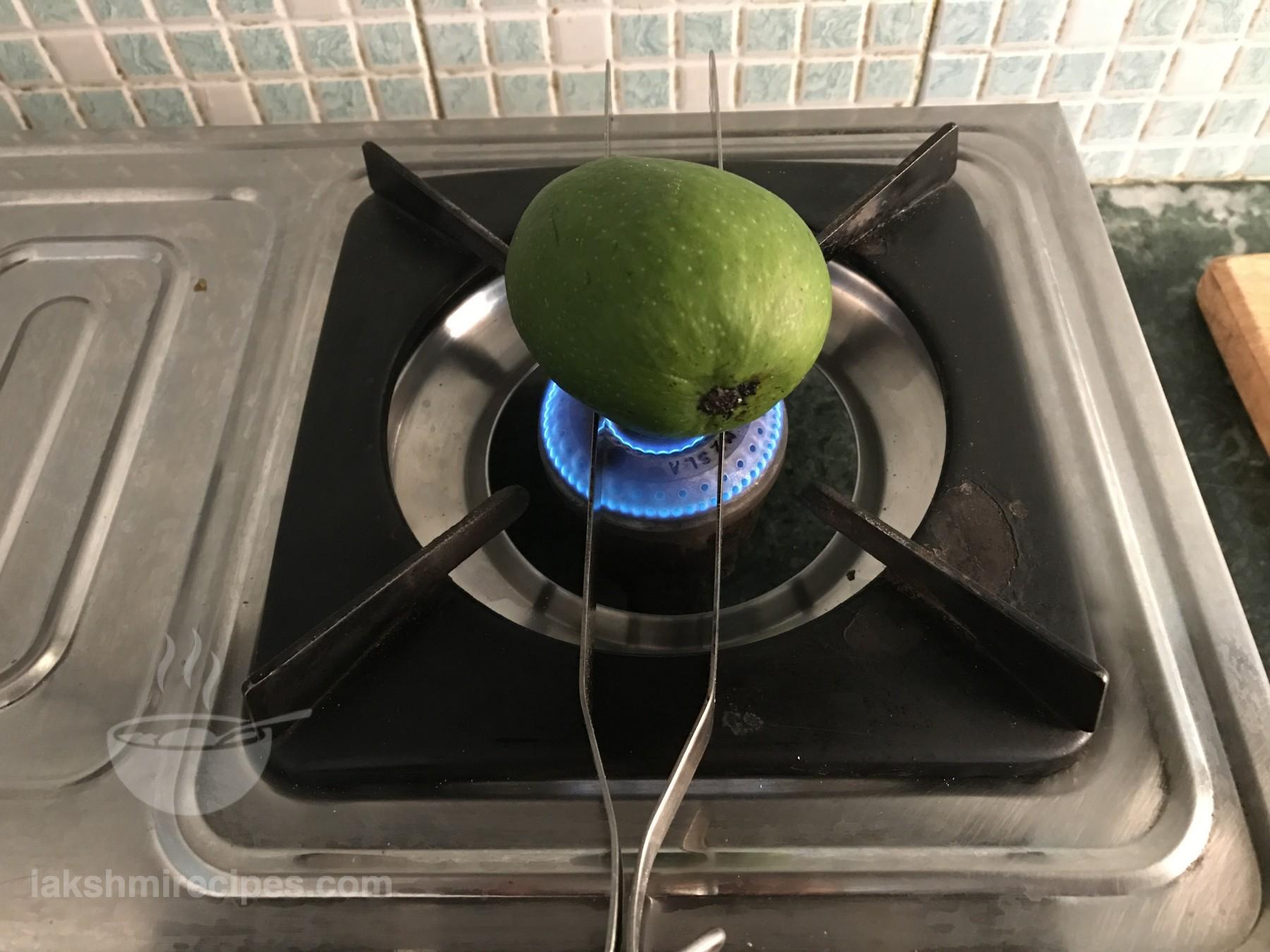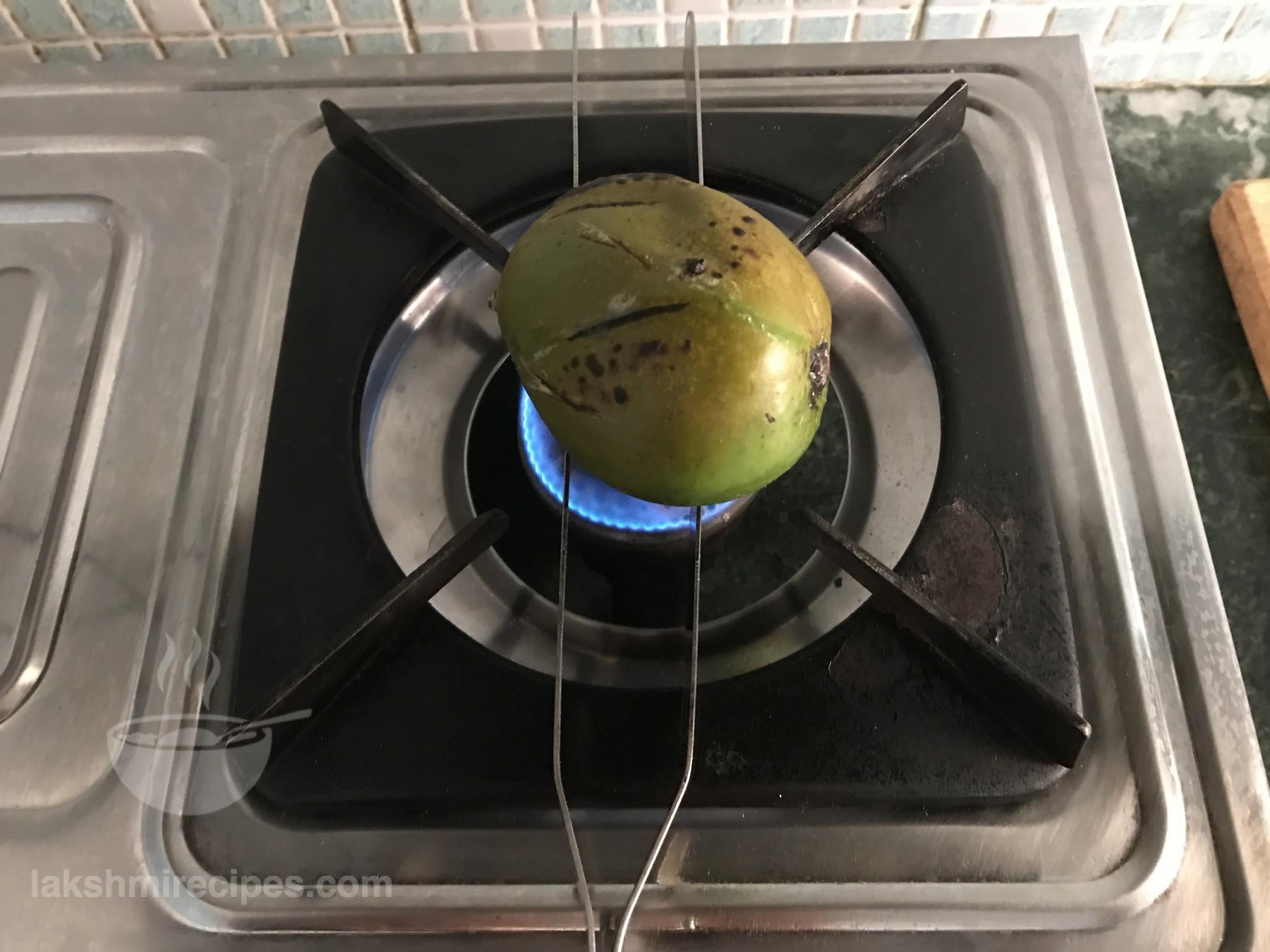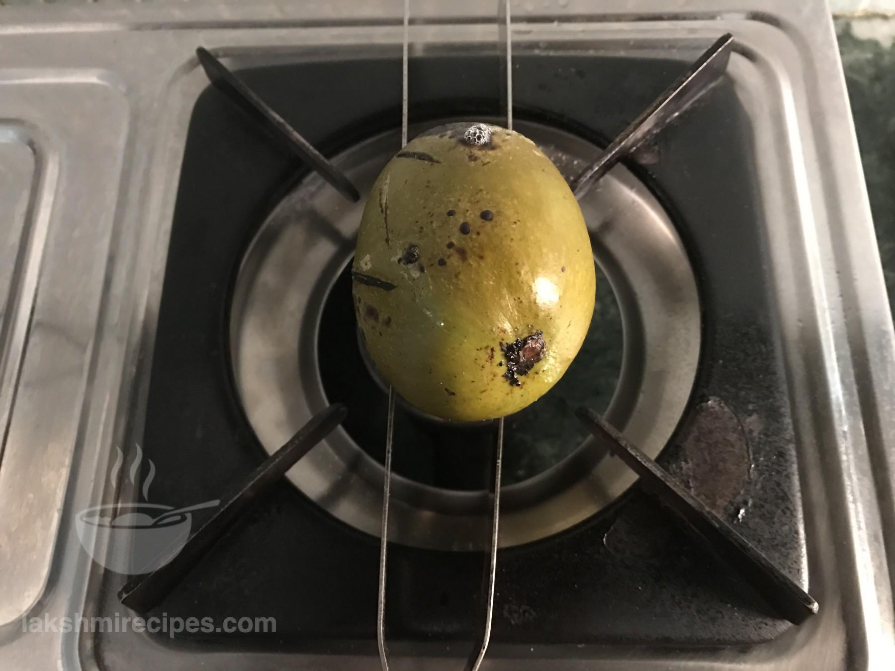 - Place the raw mango over the tongs or iron mesh and then lower the flame. When one side gets cooked and becomes soft then rotate it to get cooked on the other side. Rotate and turn to allow the mango to cook on all sides in this manner. (When the raw mango is cooked it will become soft and change its color from green to greenish yellow.)