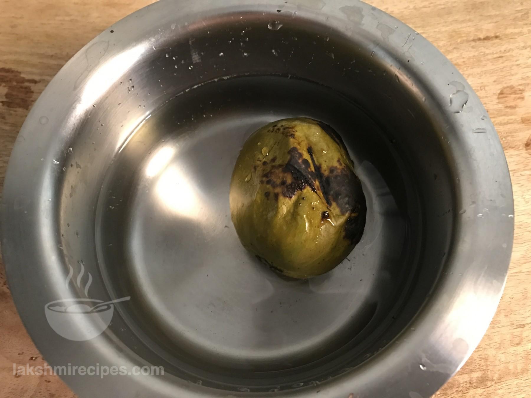 - Now remove the mango from over the flame and keep it dipped in water contained in a vessel for 10 minutes.