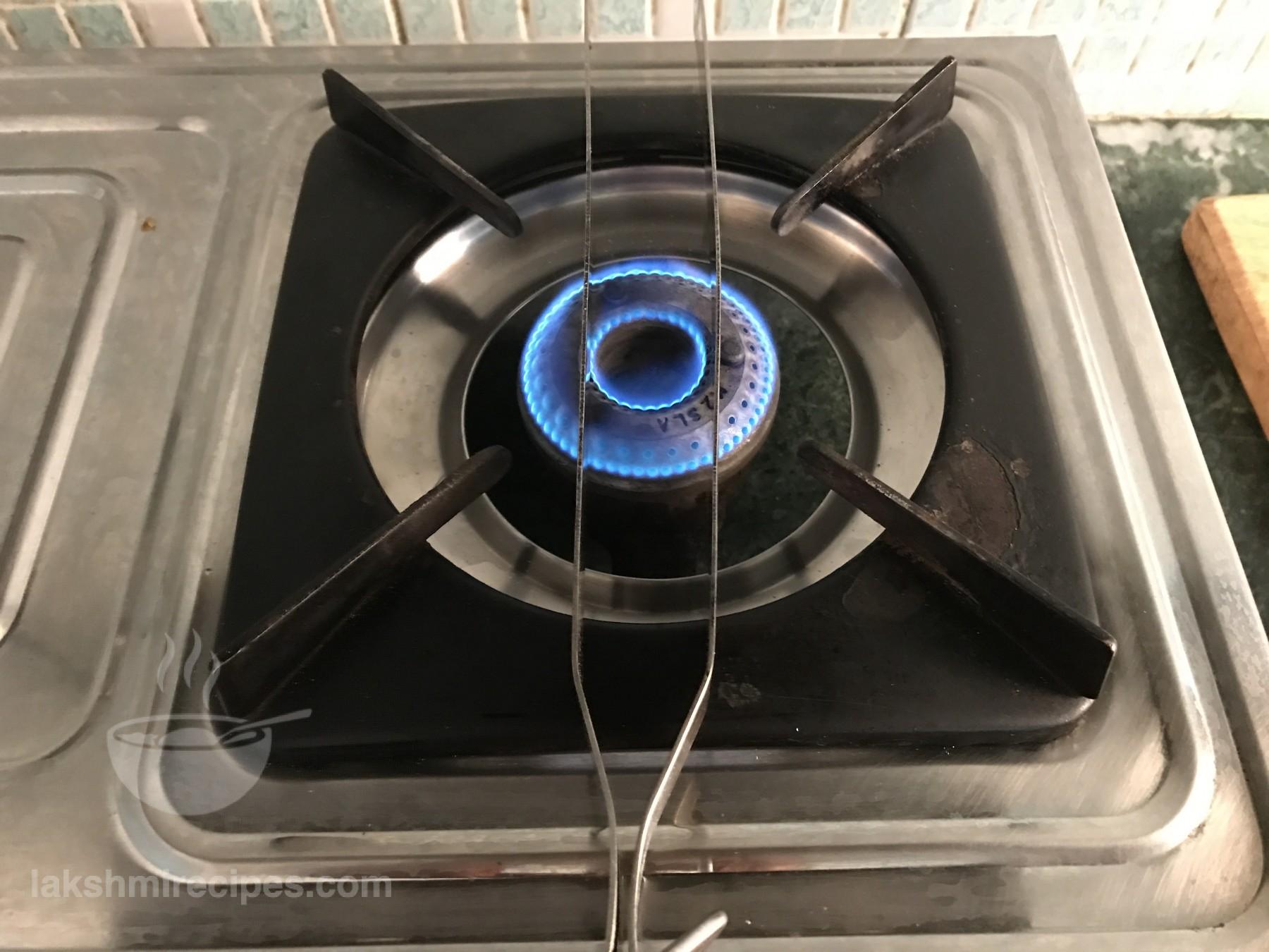 - अब गैस स्टोव पर चिमटे या किसी लोहे की जाल को रखो और गैस को चालू करें।