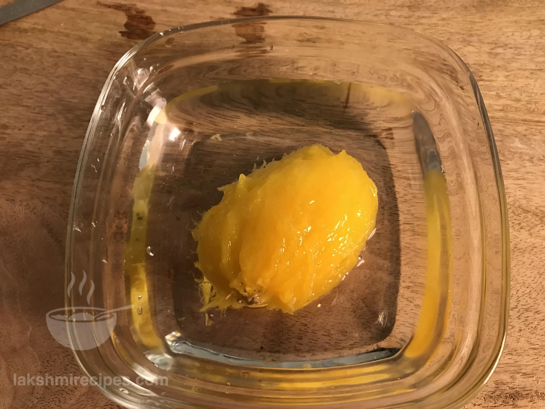 - Take 2 glass water in a deep vessel and transfer the mango to it.