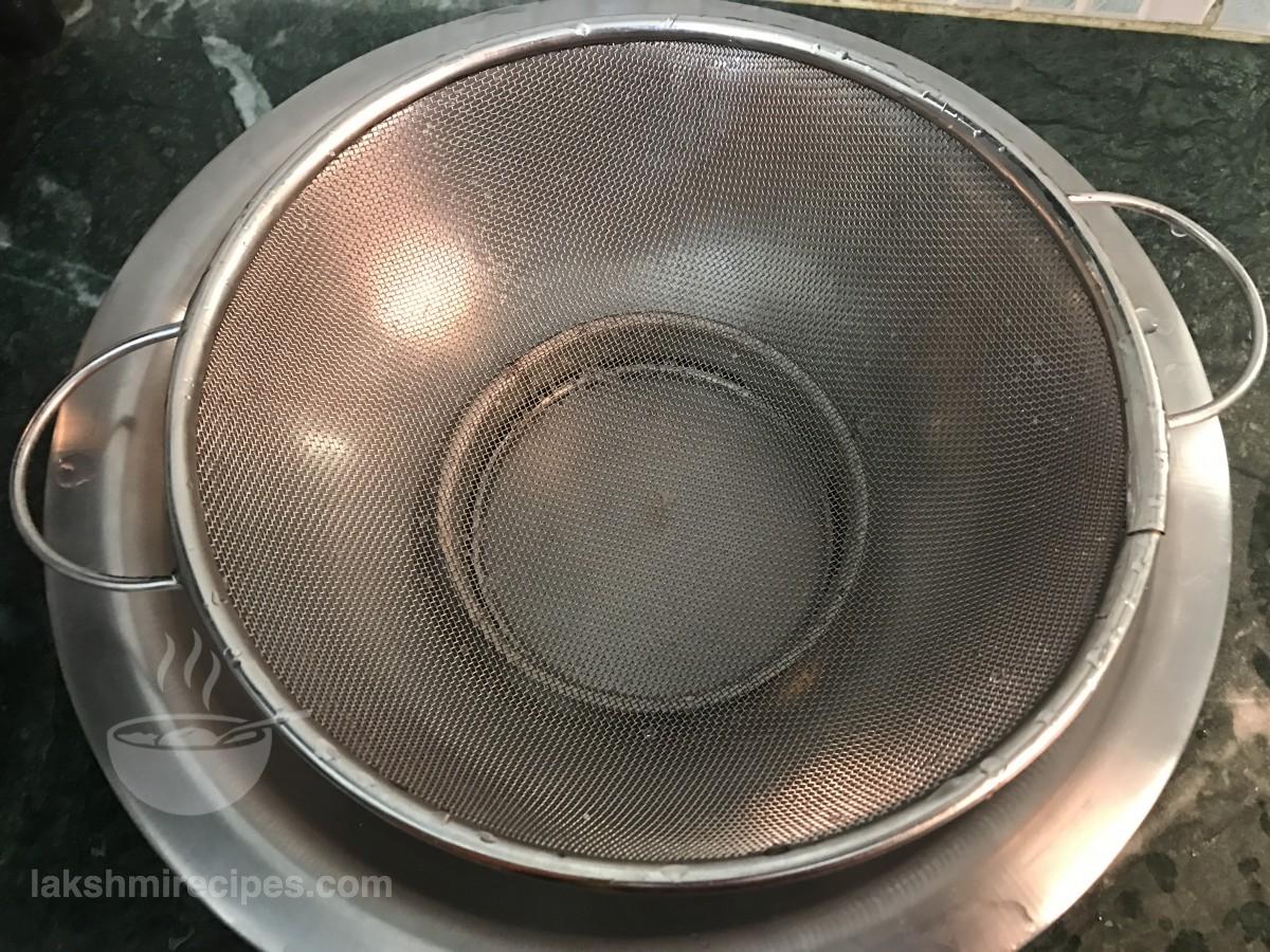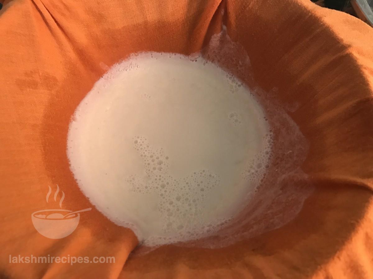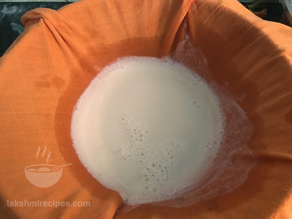 - Then transfer the fine paste of soybean seeds to a deep mixing vessel and add 1 litre water to it. Mix the ingredients well. Now strain the solution into another deep vessel using a fine sieve or strainer or colander.