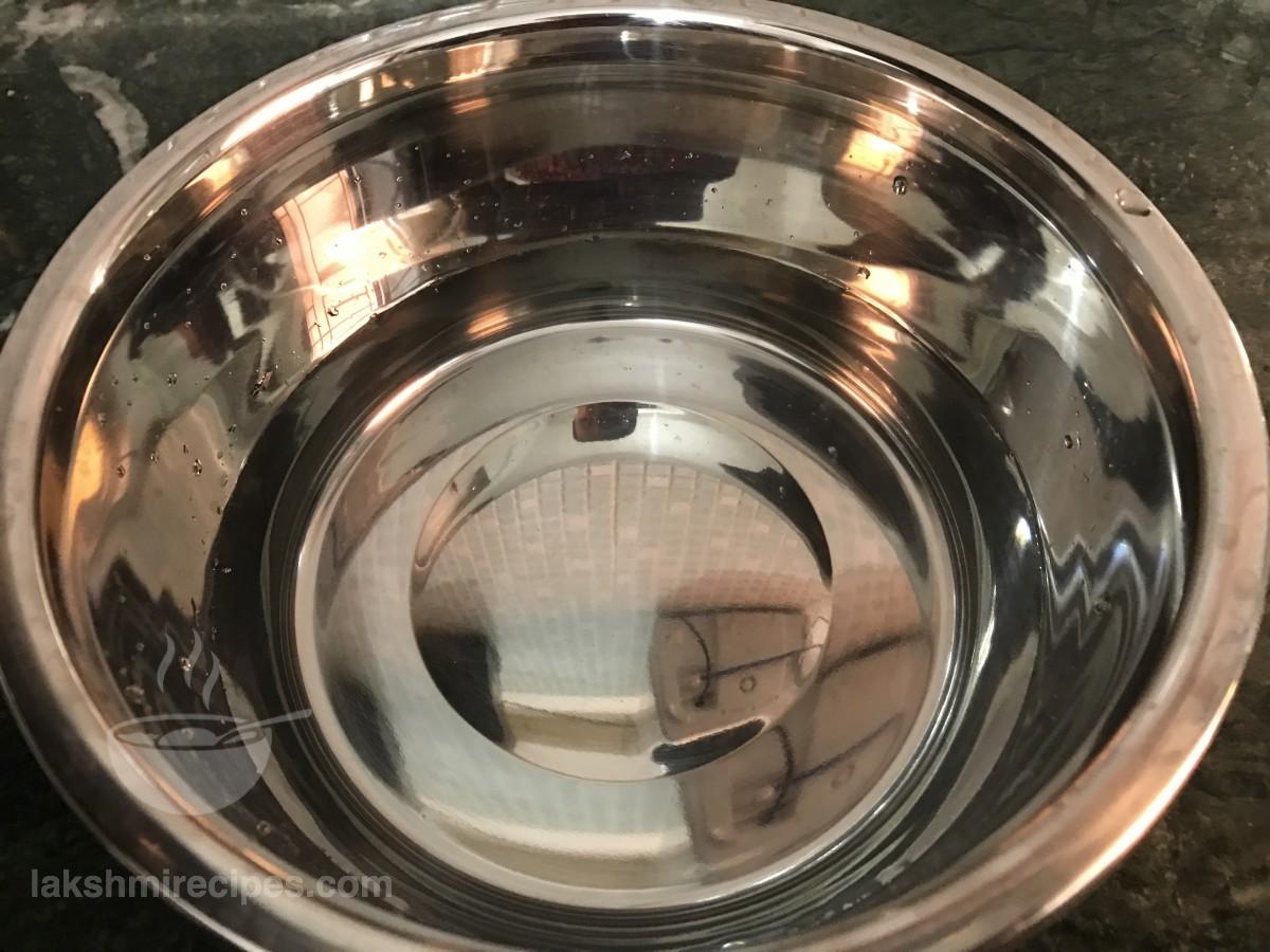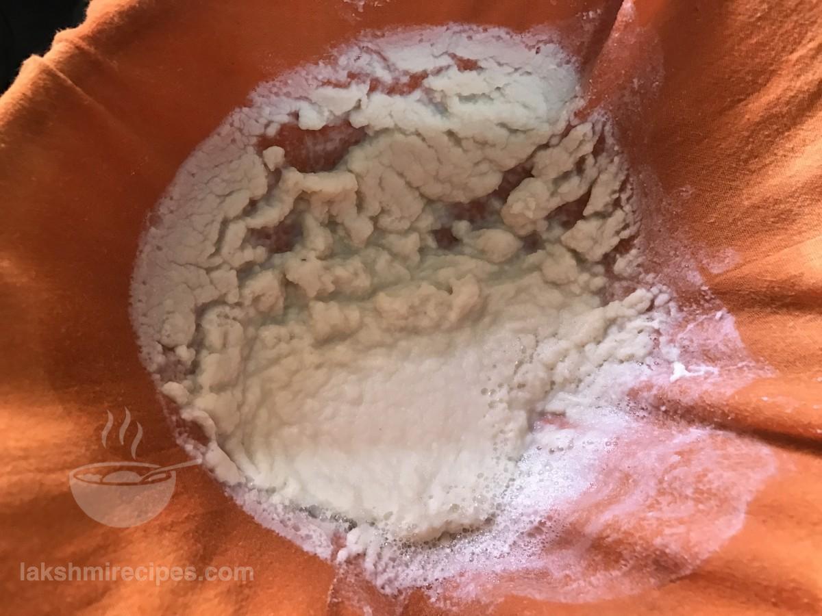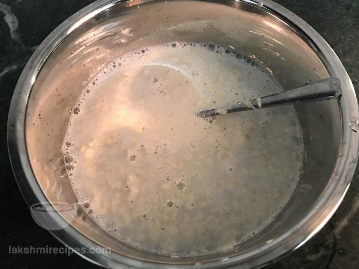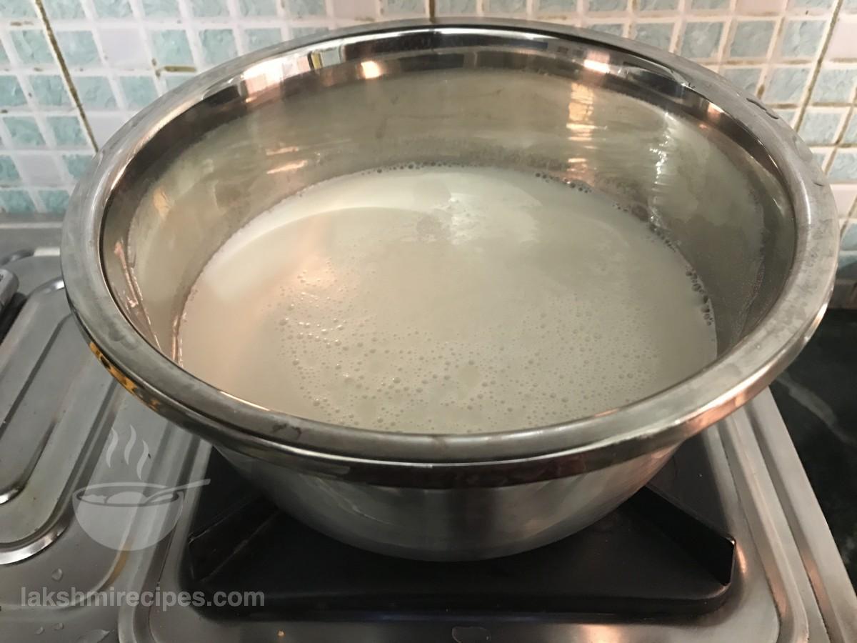- Then transfer the fine paste of soybean seeds to a deep mixing vessel and add 1 litre water to it. Mix the ingredients well. Now strain the solution into another deep vessel using a fine sieve or strainer or colander.