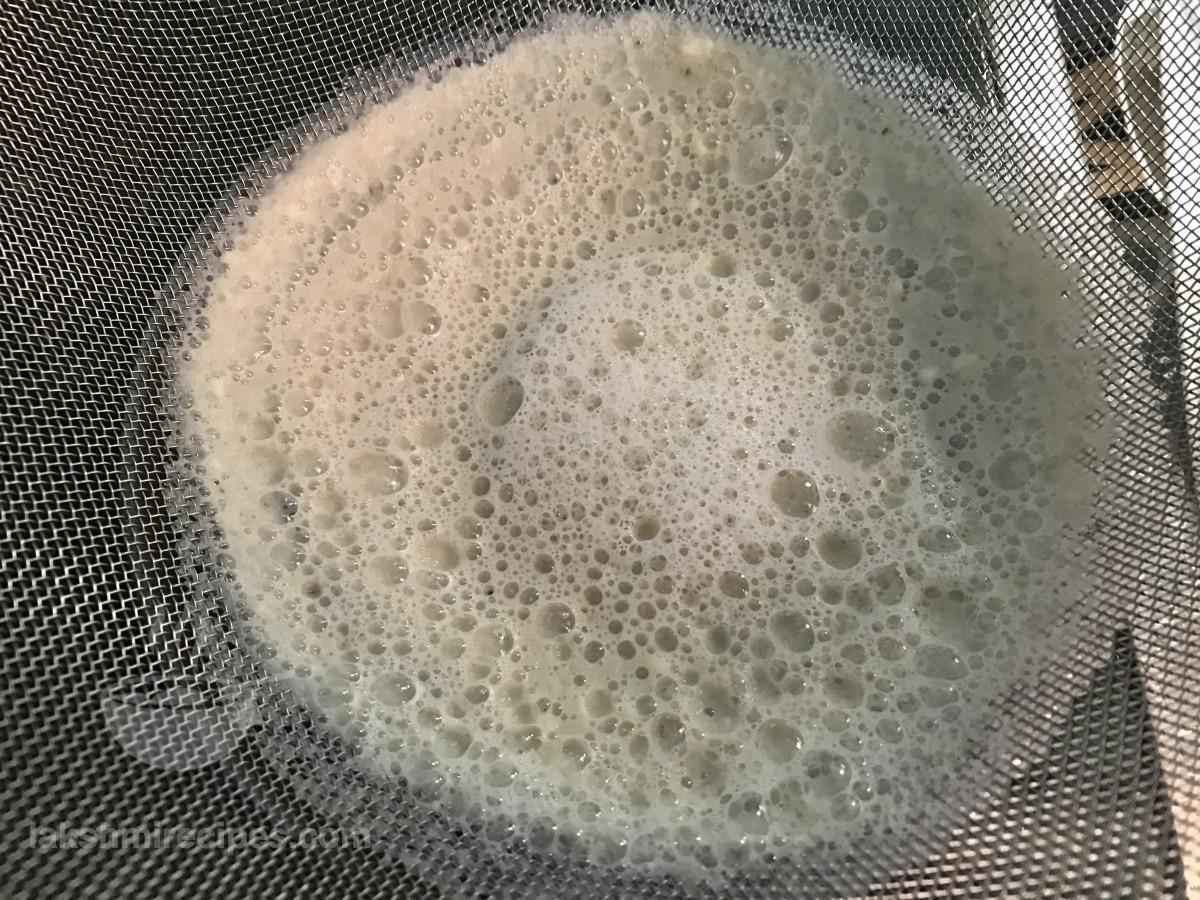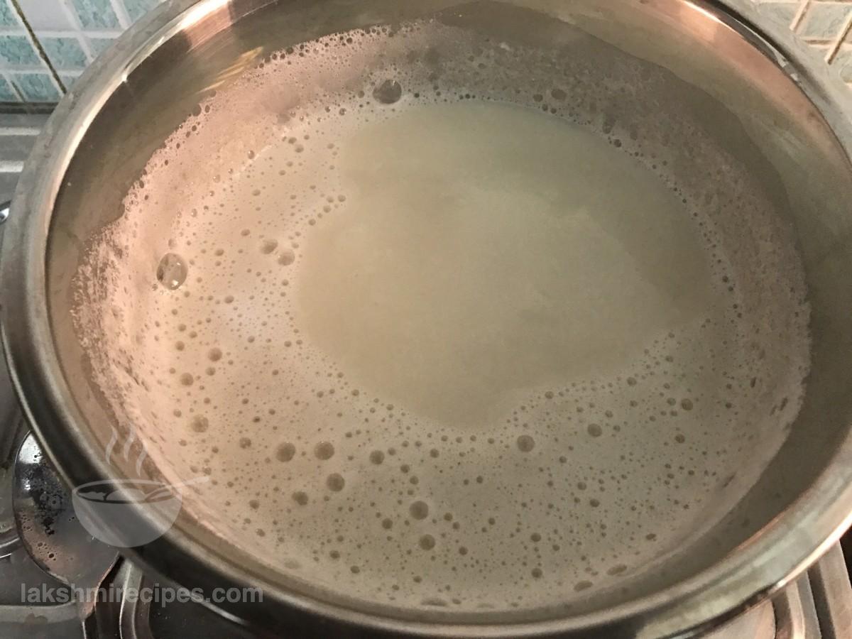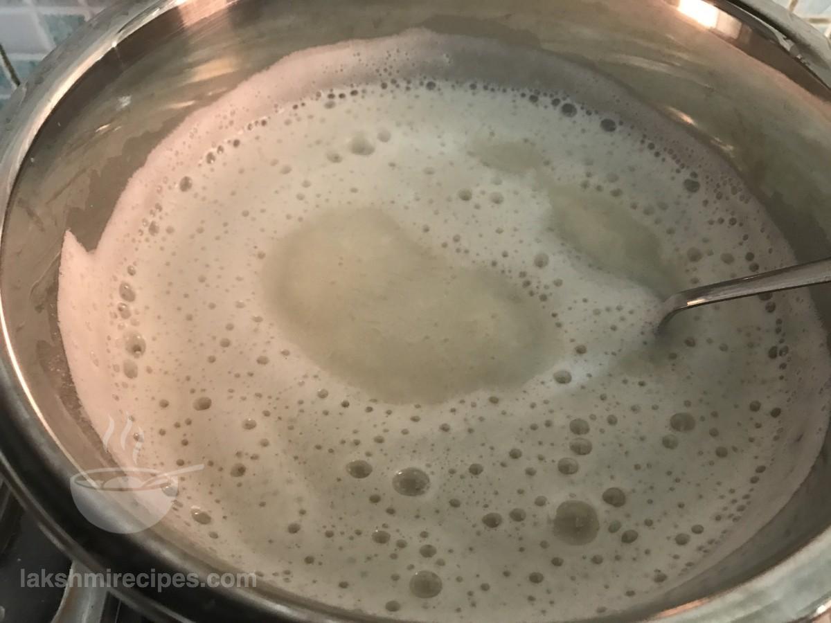 - जब मिश्रण उबलना शुरु होजाएगा, तो उसकी ऊपरी सतह पर झाग सा बनने लगेगा। तब एक चम्मच की मदद से इस झाग को ऊपर-ऊपर से ही निकाल लें (जैसा कि नीचे दी गई छवि में दिखाया गया है)।