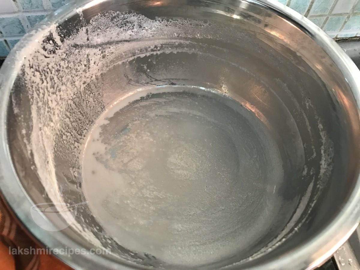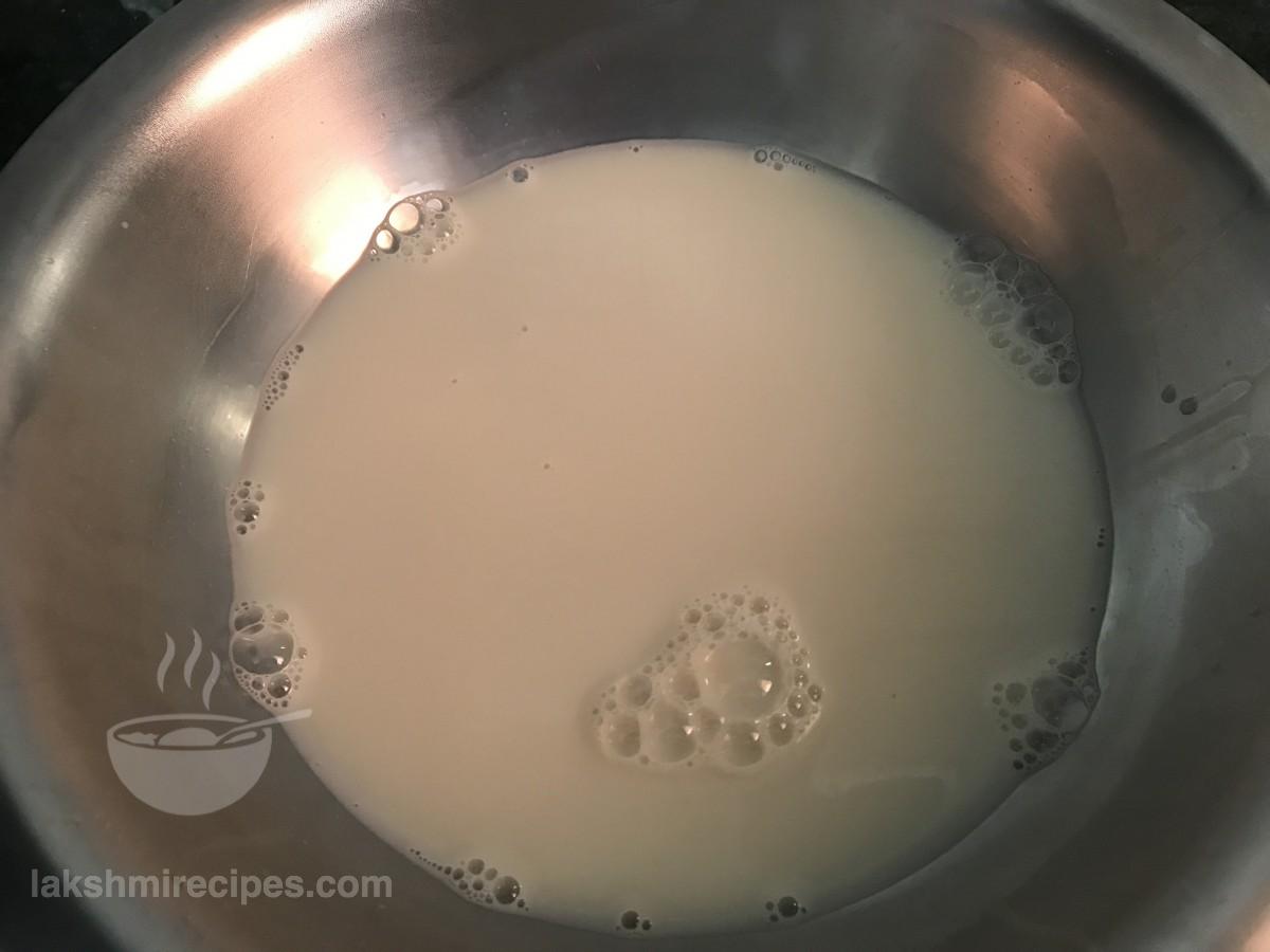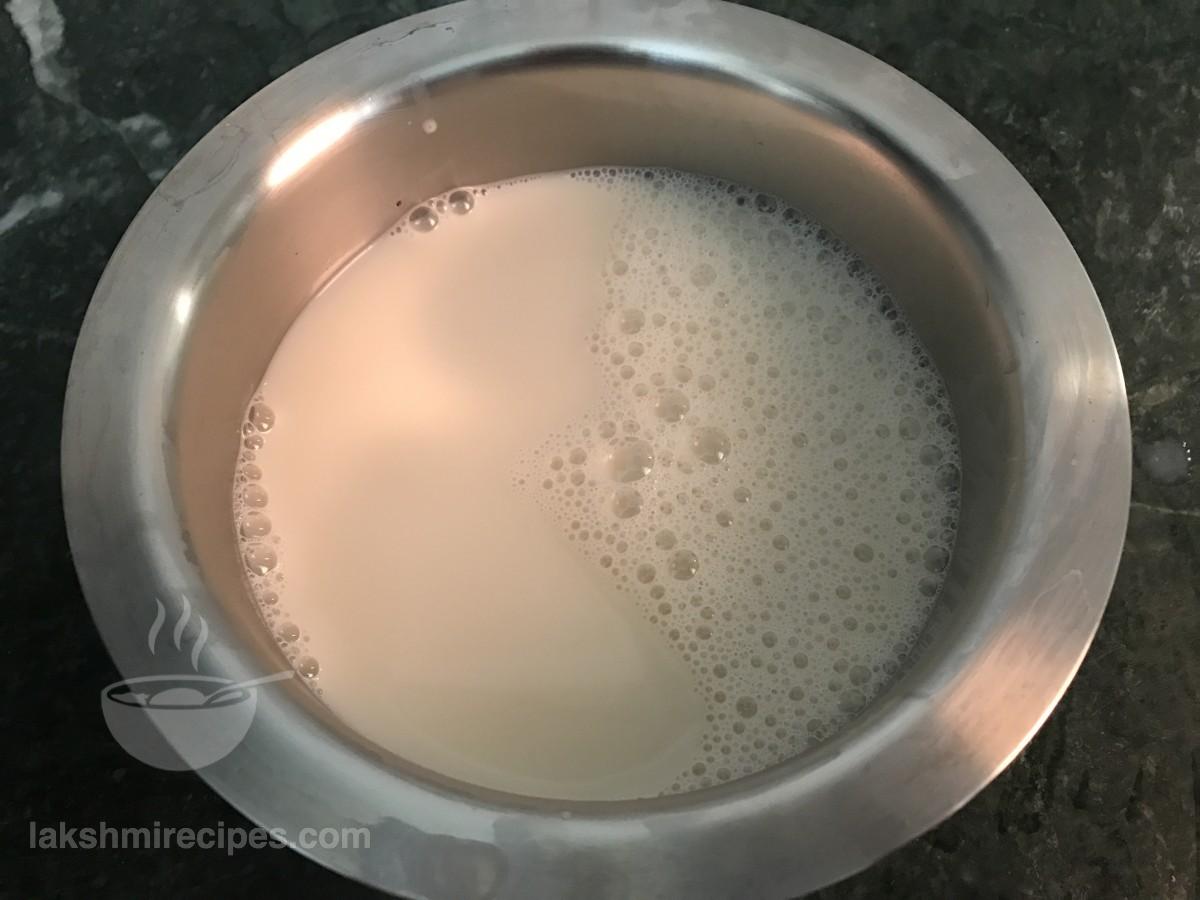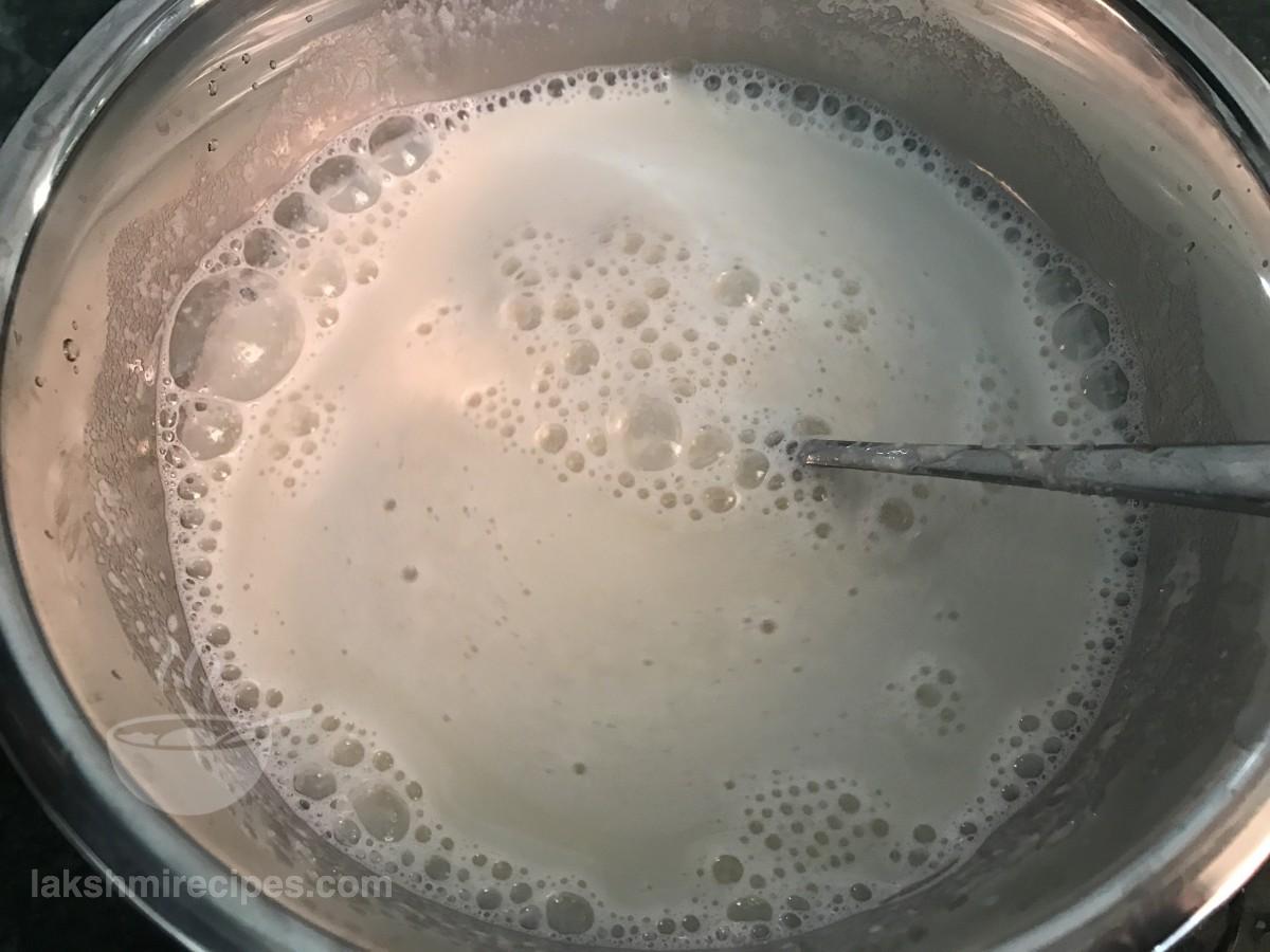 - जब मिश्रण उबलना शुरु होजाएगा, तो उसकी ऊपरी सतह पर झाग सा बनने लगेगा। तब एक चम्मच की मदद से इस झाग को ऊपर-ऊपर से ही निकाल लें (जैसा कि नीचे दी गई छवि में दिखाया गया है)।