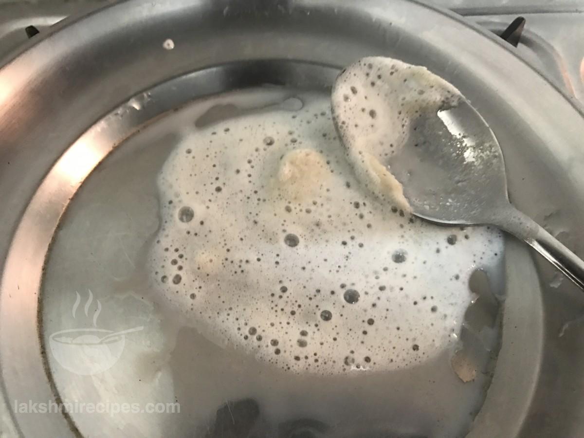 - When the solution will start boiling, foam will be formed on the upper surface. Remove this foam with the help of spoon (as shown in the image below).