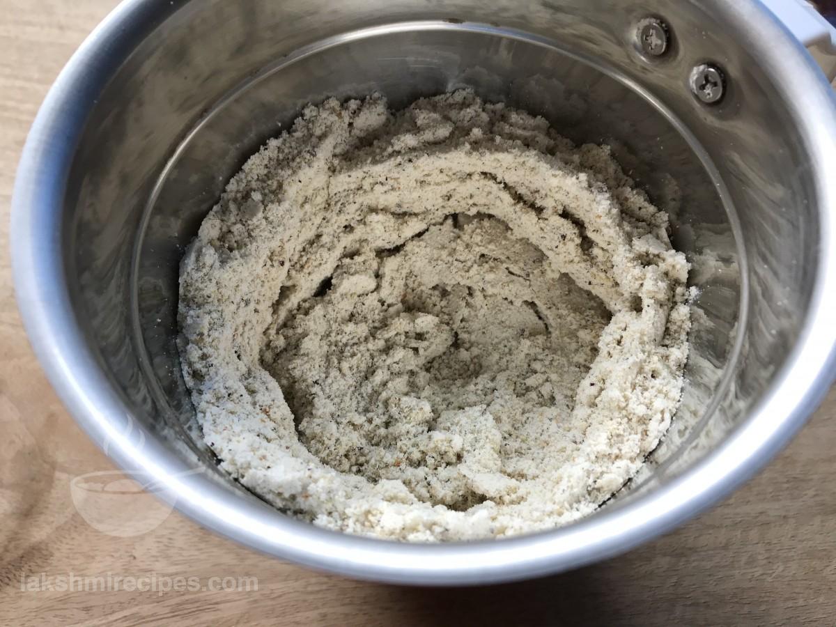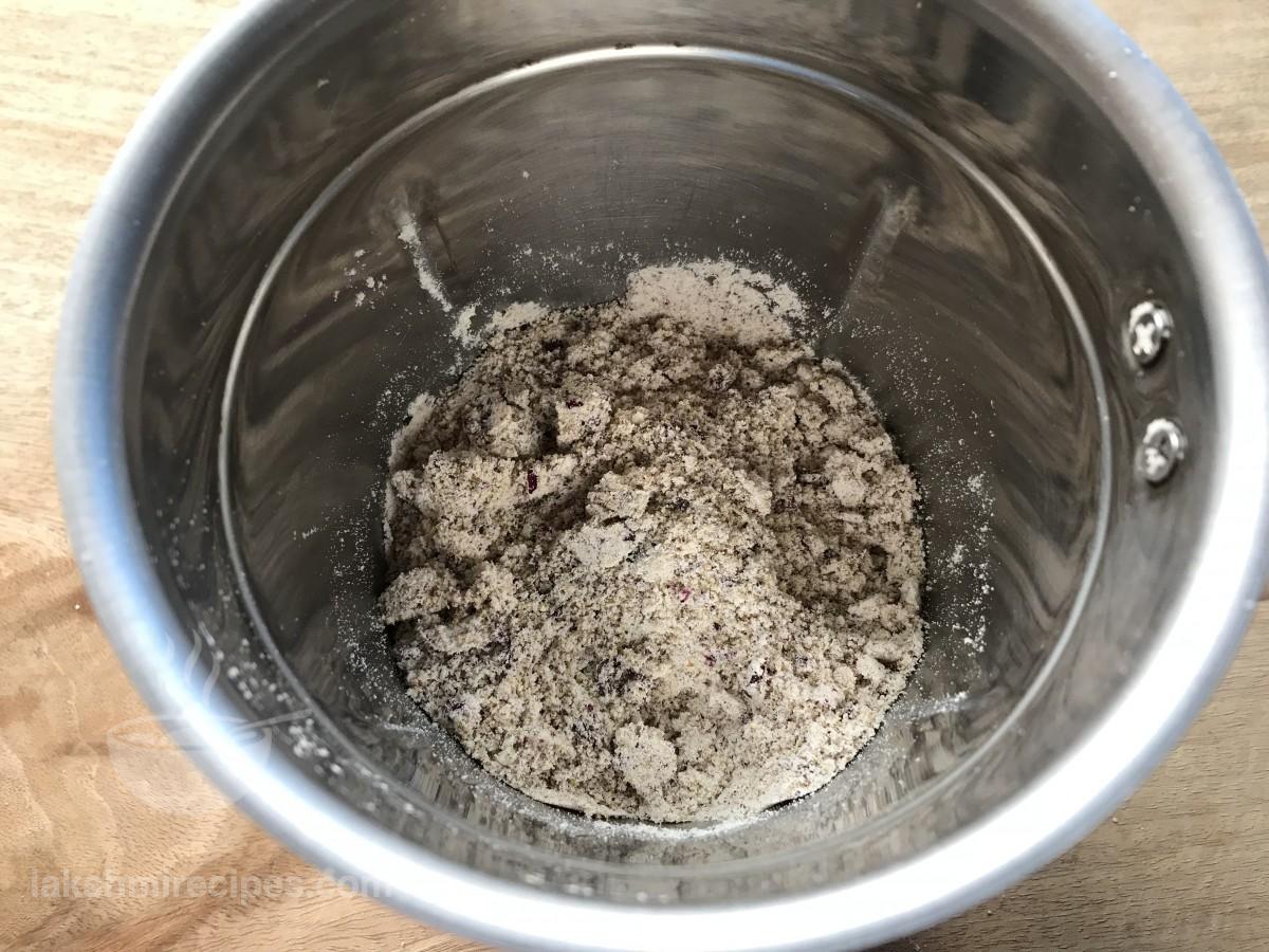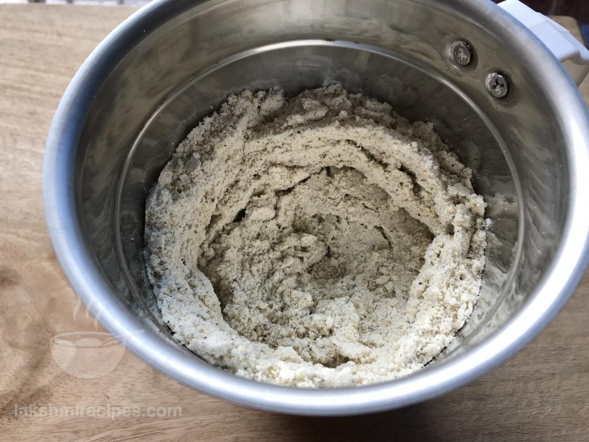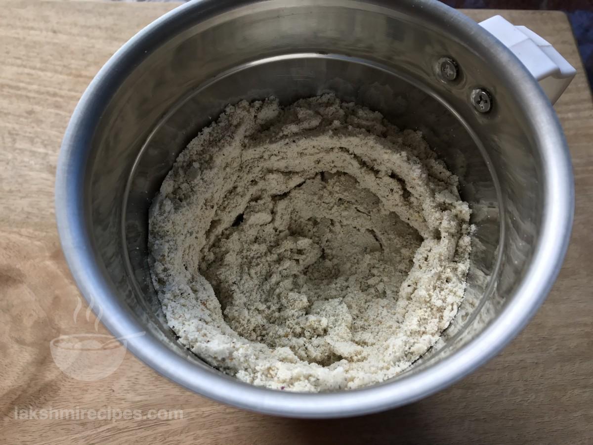 - Add dried rose petals to the mixer jar and then grind the ingredients together to form a fine powder like mixture. Transfer the prepared thandai mixture to a plate. (Remember to grind the ingredients to form a fine powder.)