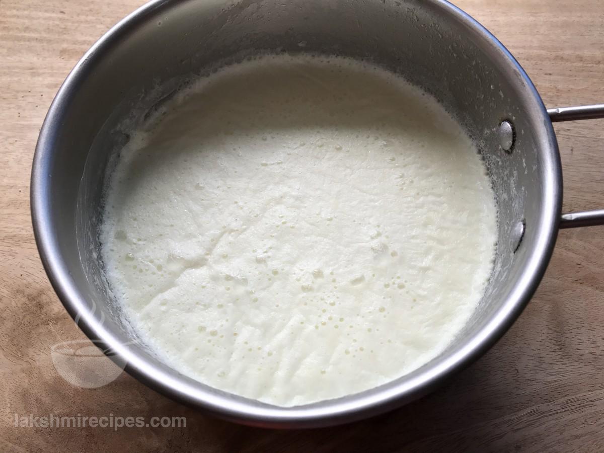 - Pour 1 litre milk in a deep vessel and set it to boil. Then allow it to cool and chill in refrigerator for atleast 2 hours.