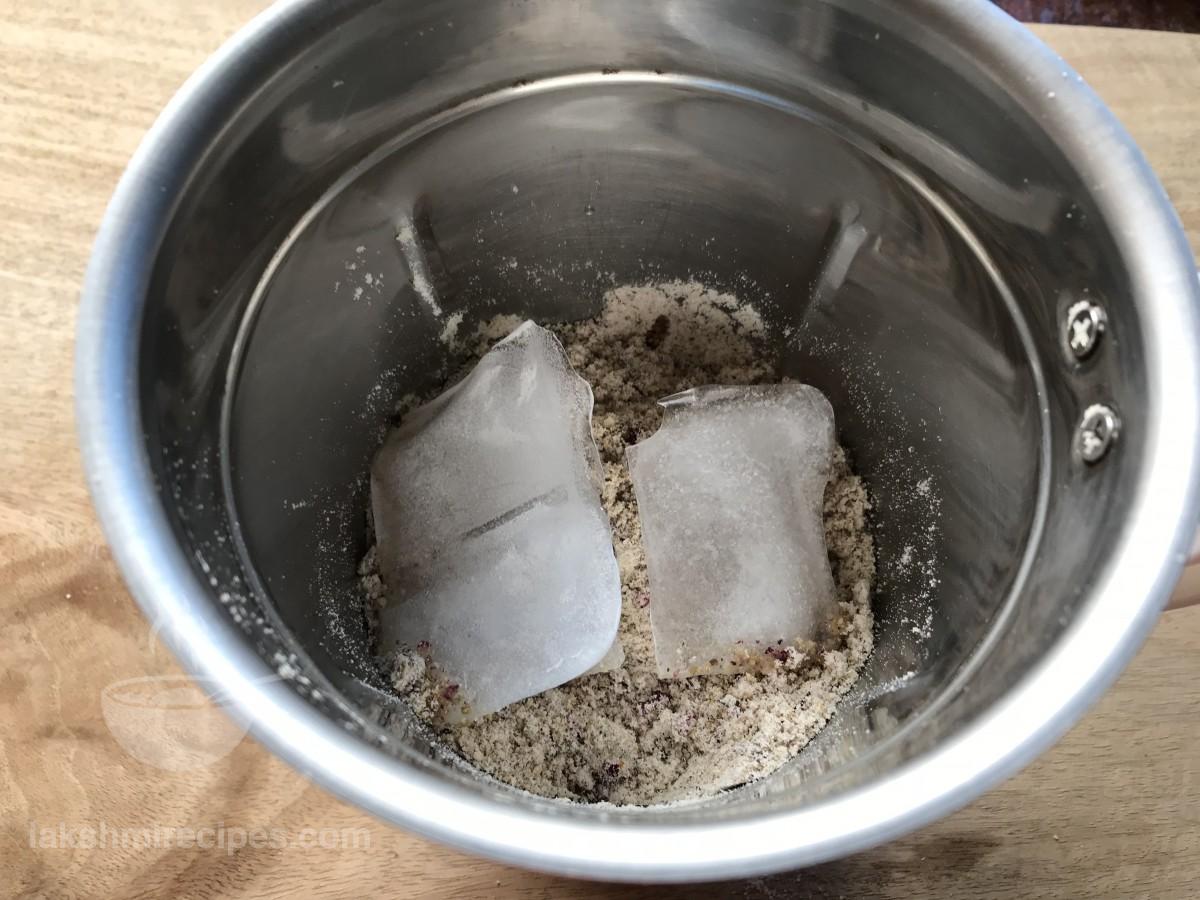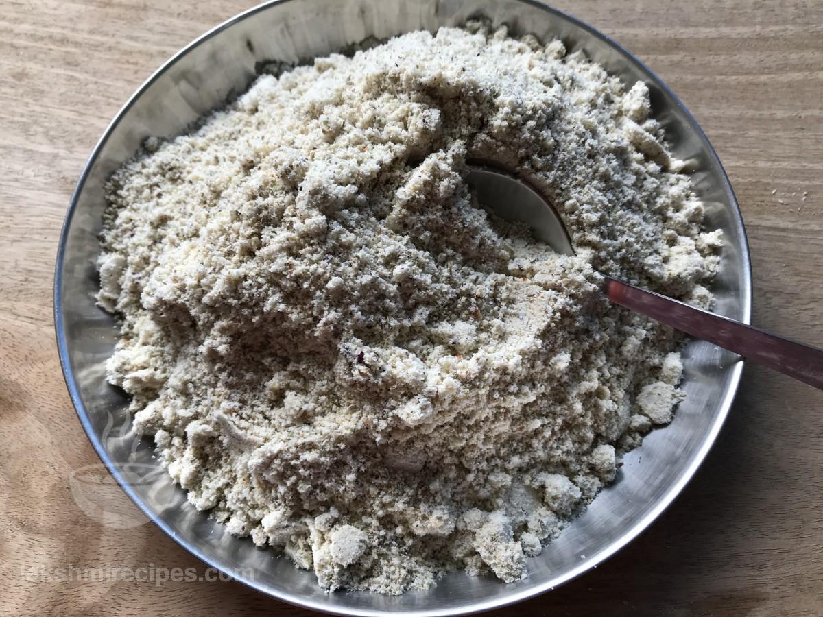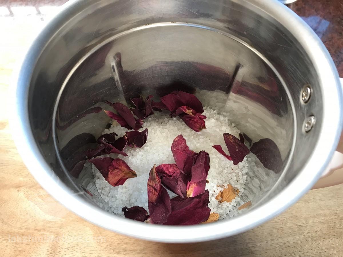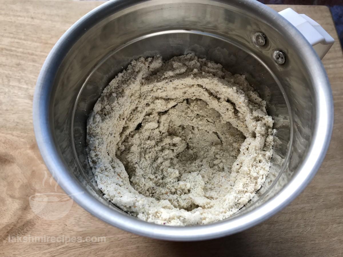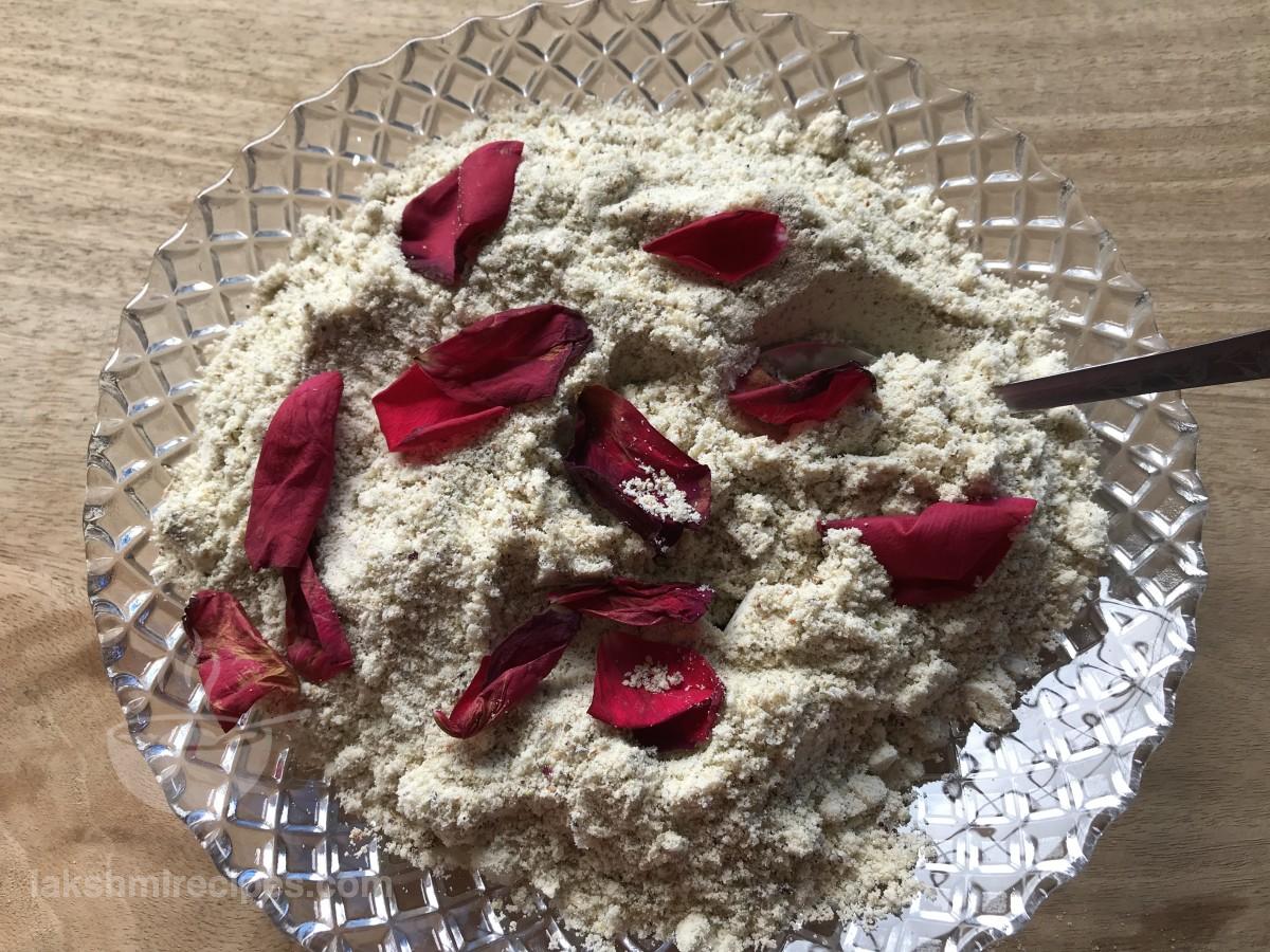 - मिक्सर जार में सूखे गुलाब पंखुड़ियों डालें और फिर सामग्री को एक साथ बारीक पीसकर, बारीक पाऊडर जैसा बना लें। एक प्लेट में तैयार ठंडाई मिश्रण को निकाल लें। (याद रखें कि ठंडाई मिश्रण एकदम बारीक पाऊडर जैसा पिसा हुआ हो।)