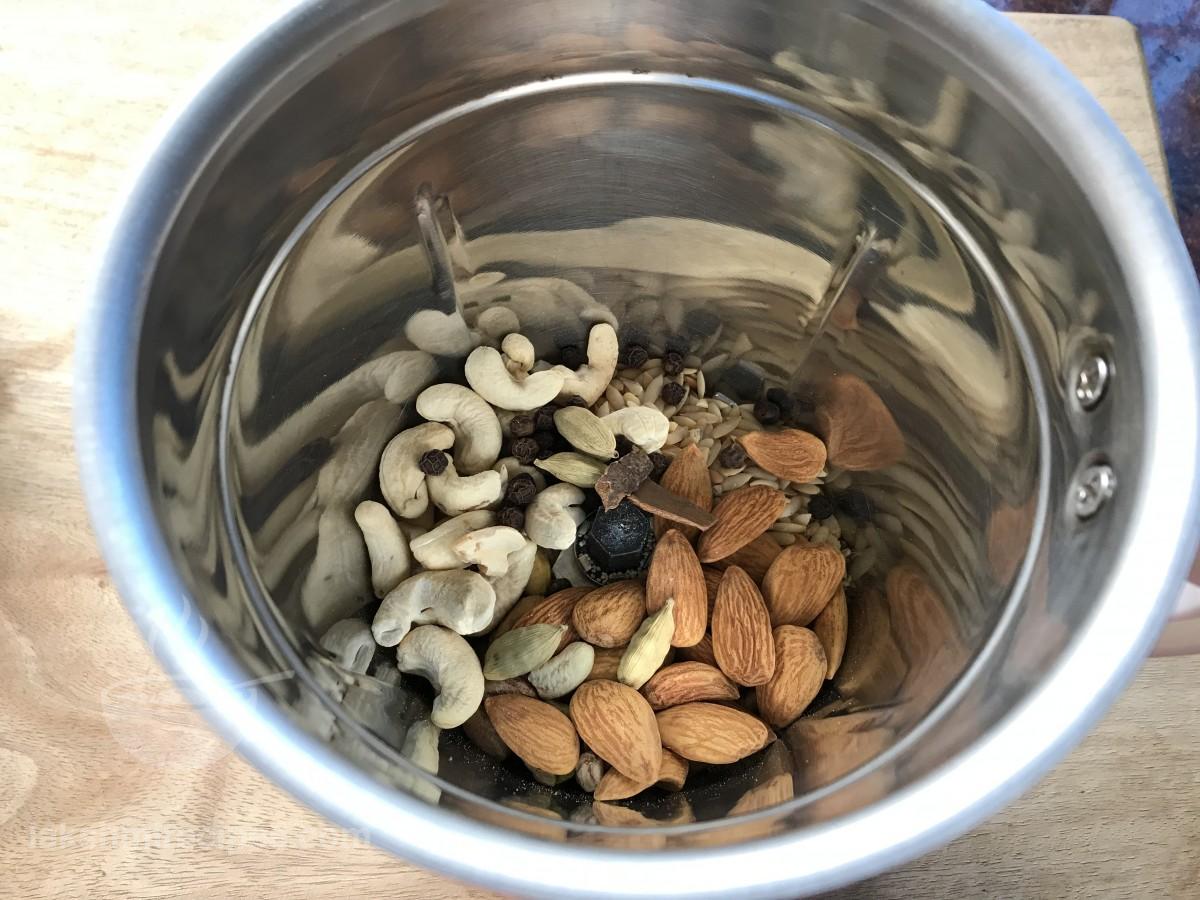 - फिर एक मिक्सर जार में काजू, बादाम, पिस्ता, खस-खस (पोस्तादाना), सौंफ़, दालचीनी, हरी इलायची, काली मिर्च और चीनी डालें। आप चीनी अपने स्वाद या आवश्यकता के अनुसार ही डालें।