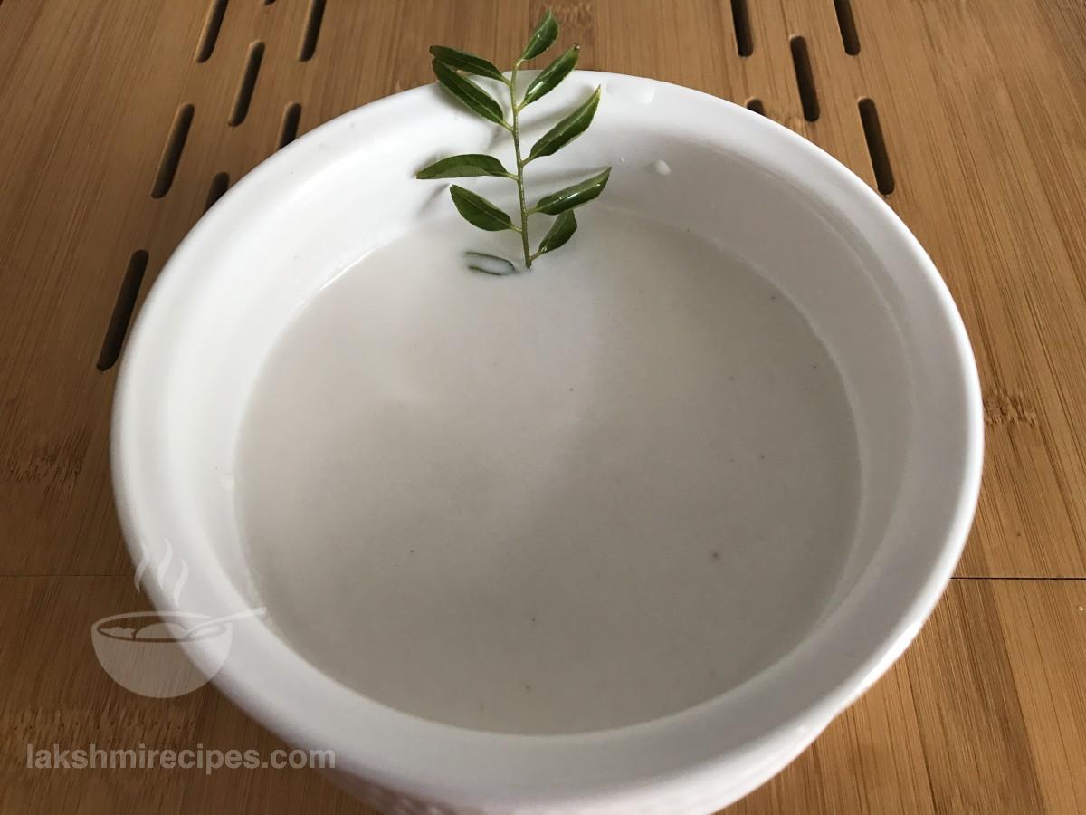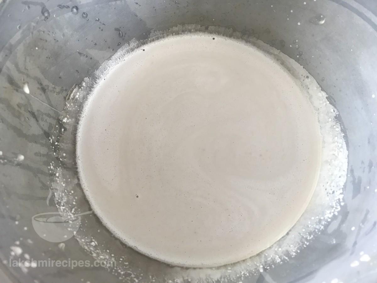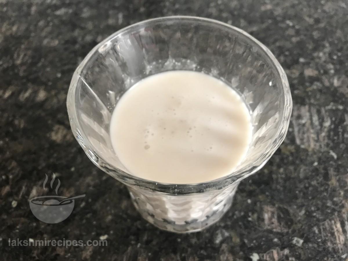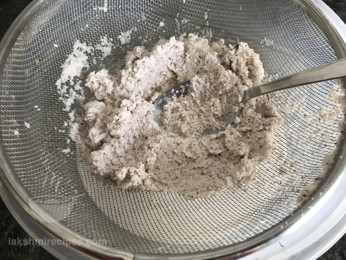 - Now pour the contents of the mixer jar into a small bowl through a sieve or colander to seperate the fibres of coconut from the liquid. The coconut milk is now ready to be used in the later steps for making coconut rice.