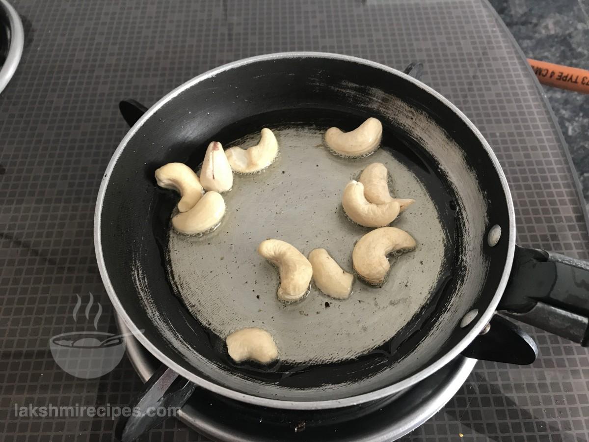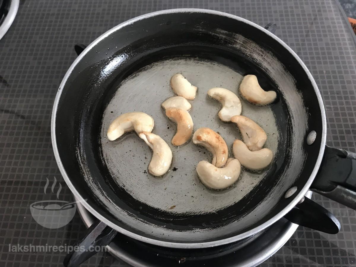 - When the ghee is hot enough for cooking, then add cashews to it to fry them.