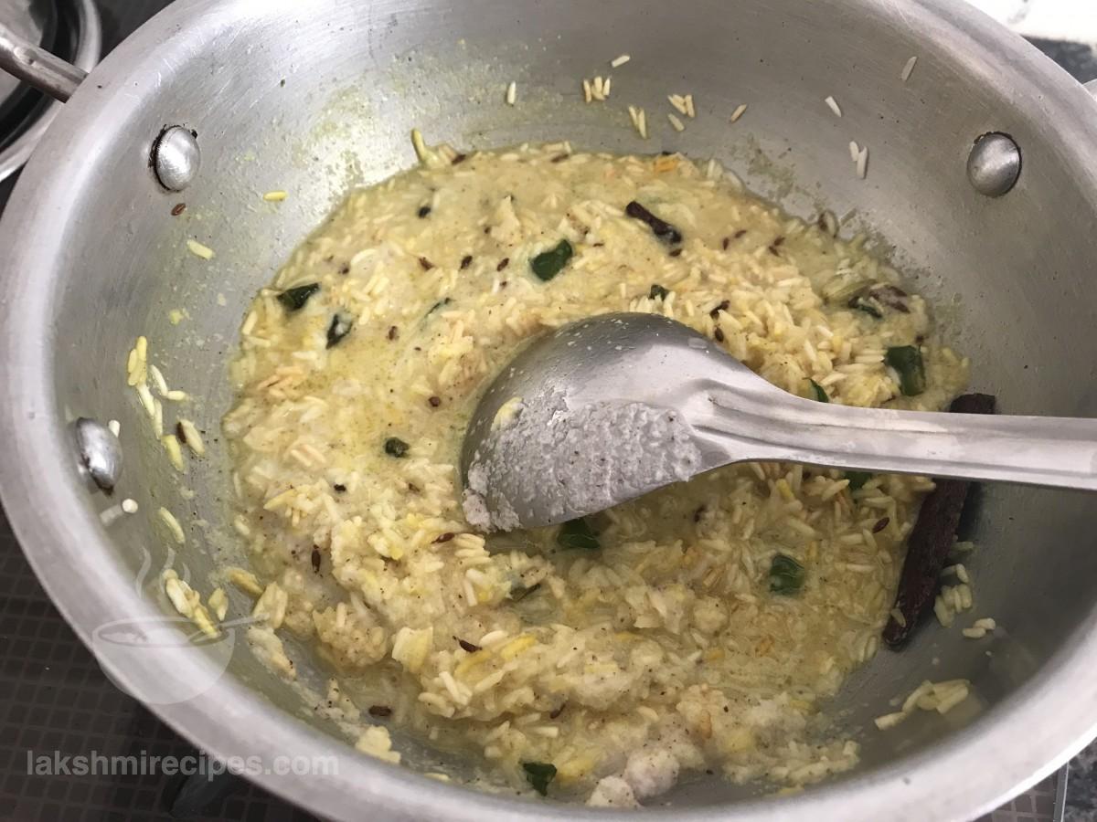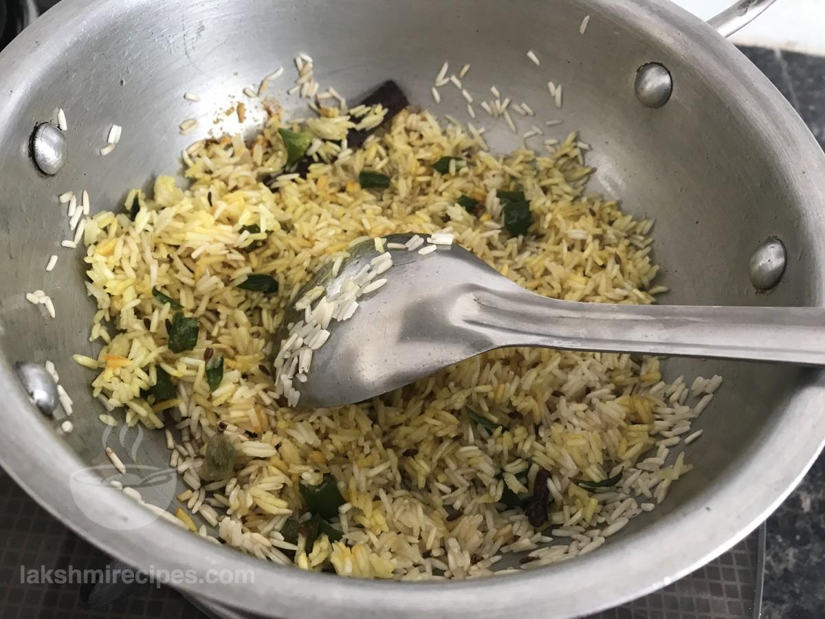 - Stir and saute the rice for 1 minute. Then add coconut milk prepared in the earlier steps to the kadhai. Mix well again.