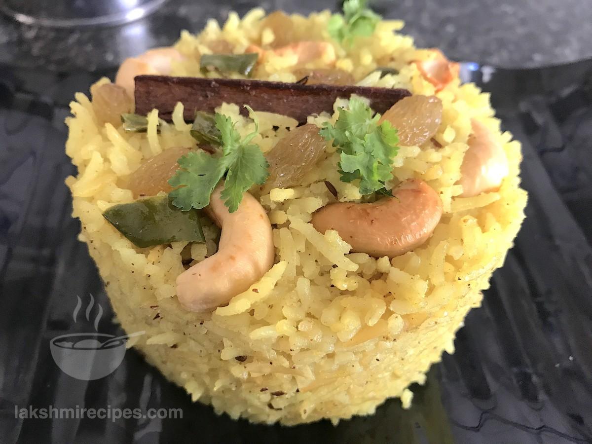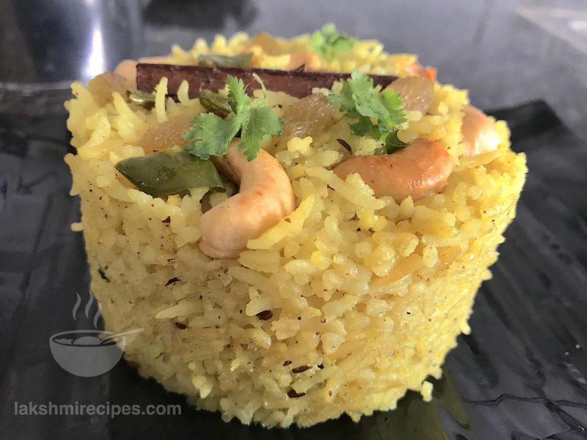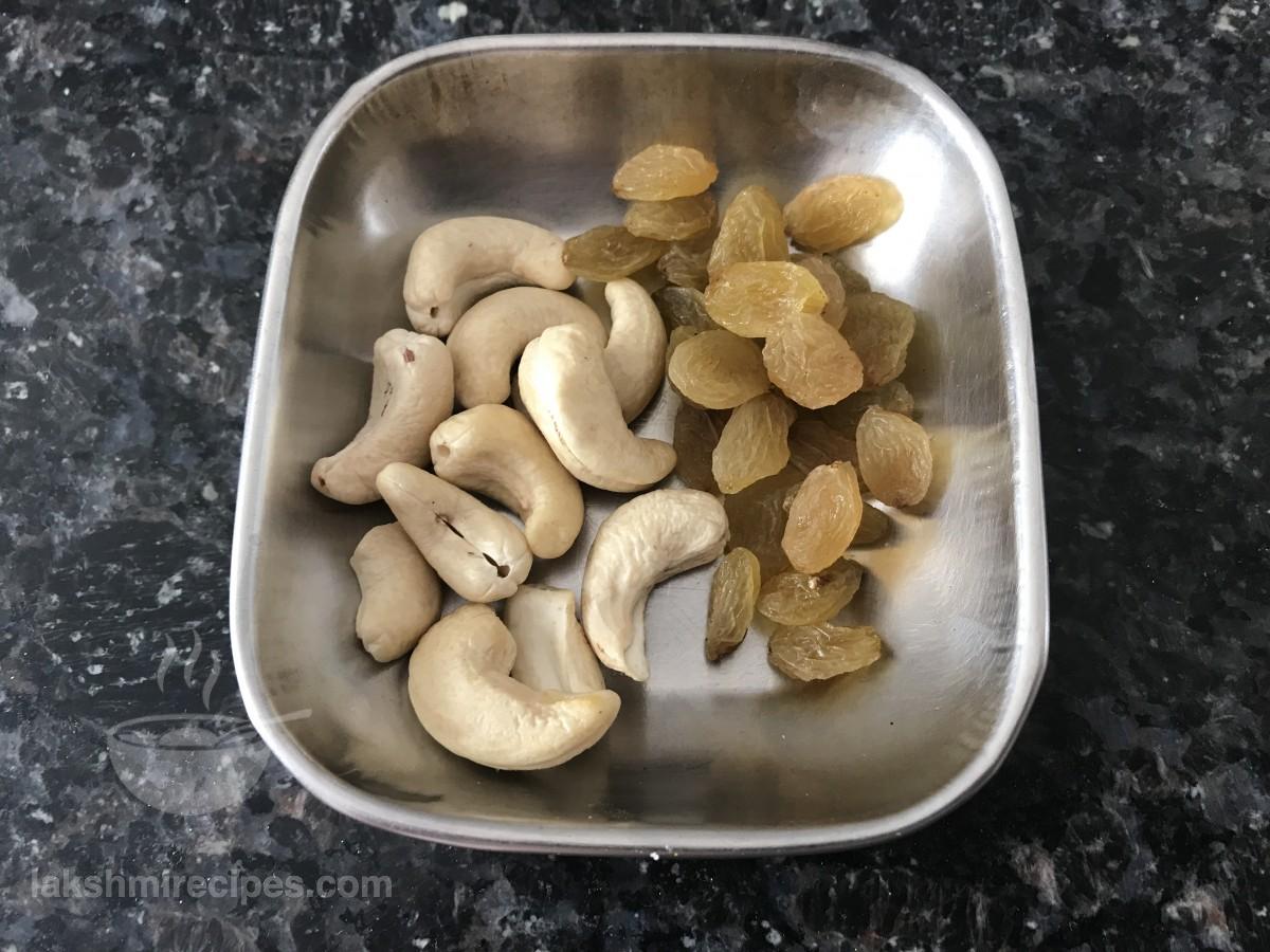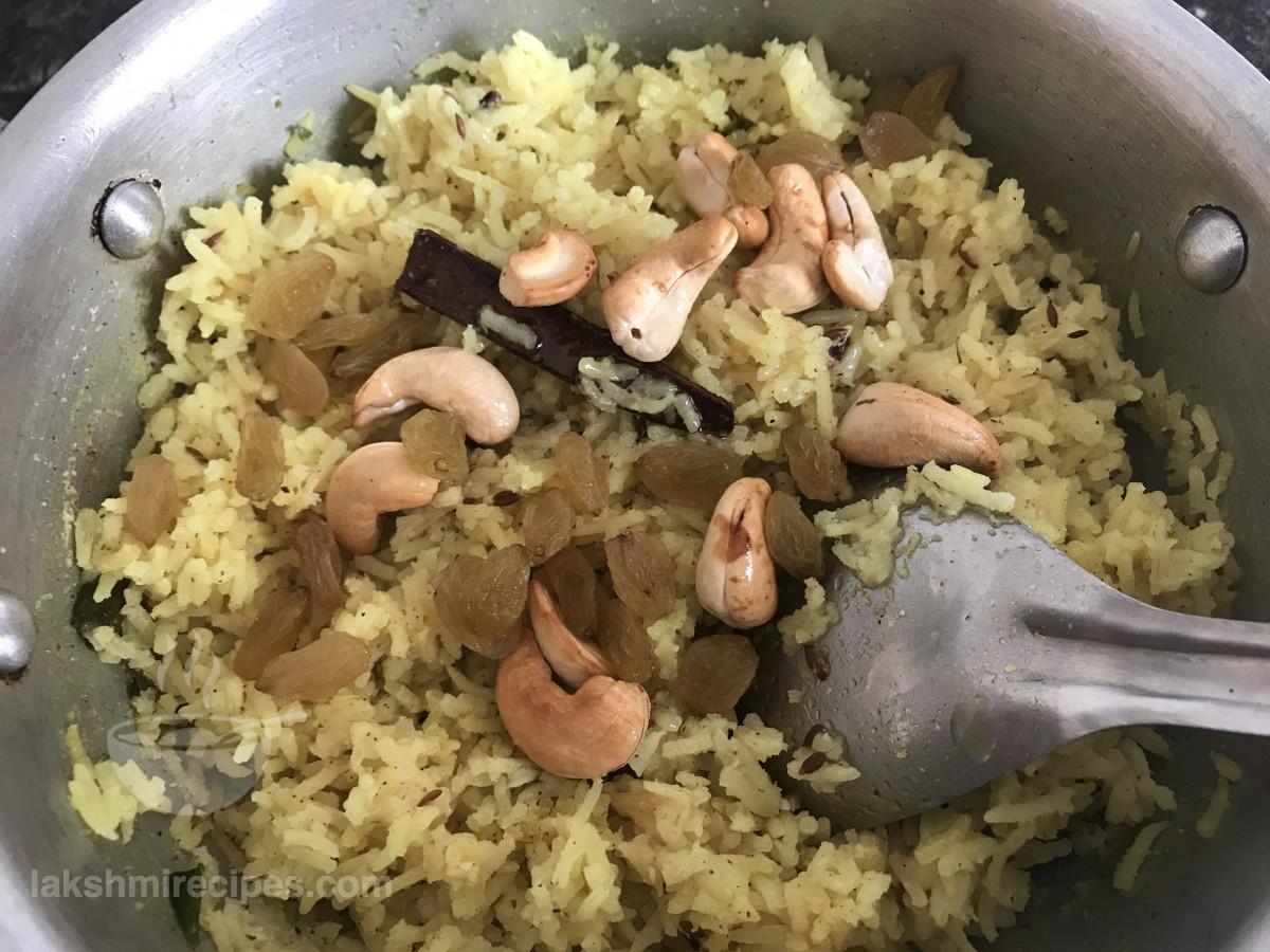 - Fry the cashews till they turn golden brown in color and then transfer them to the cooked rice along with the ghee left in the frying pan.