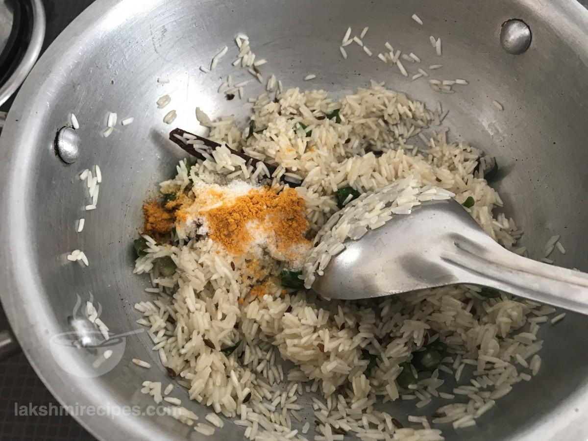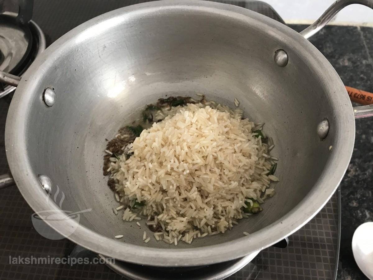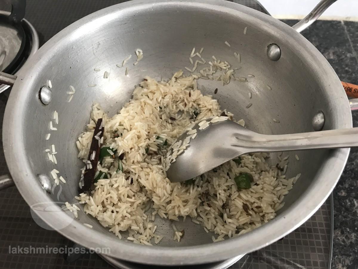 - After 2-3 seconds add the washed basmati rice to the kadhai. Stir rigorously but carefully to saut the rice without breaking the rice grain