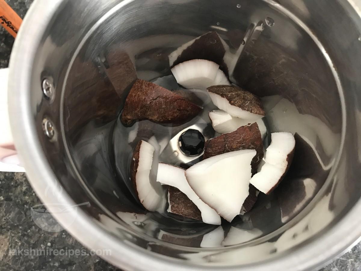 - फिर नारियल के टुकड़ों को छोटे टुकड़ों में काट लें और उन्हें मिक्सर जार में डालें। मिक्सर जार में 1 बड़ा कप पानी डालें और नारियल के टुकड़ों को एकदम बारीक पीस लें।
